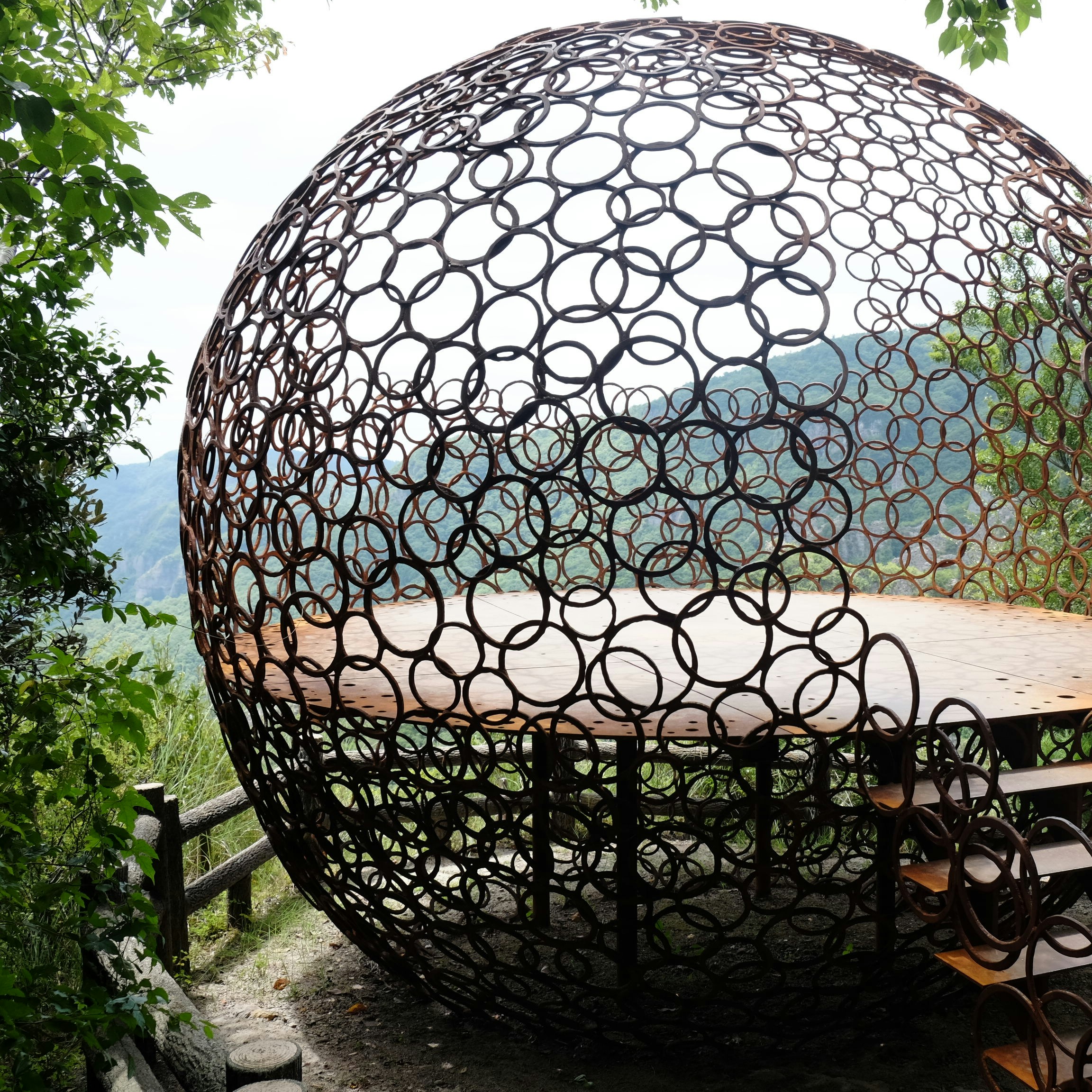 青木野枝は、小豆島の名勝として知られる寒霞渓に、展望台としての機能を持つ作品《空の玉/寒霞渓》(2022)を設置。青木がこのように具体的な機能を持たせた作品をつくるのは初めてだという。球体のなかに入れば、遠く田ノ浦半島を望むことができる。錆びることによって強度が増すコールテン鋼を使用し、金属の色が錆びるほどに風景に溶け込んでいくという恒久設置作品だ。