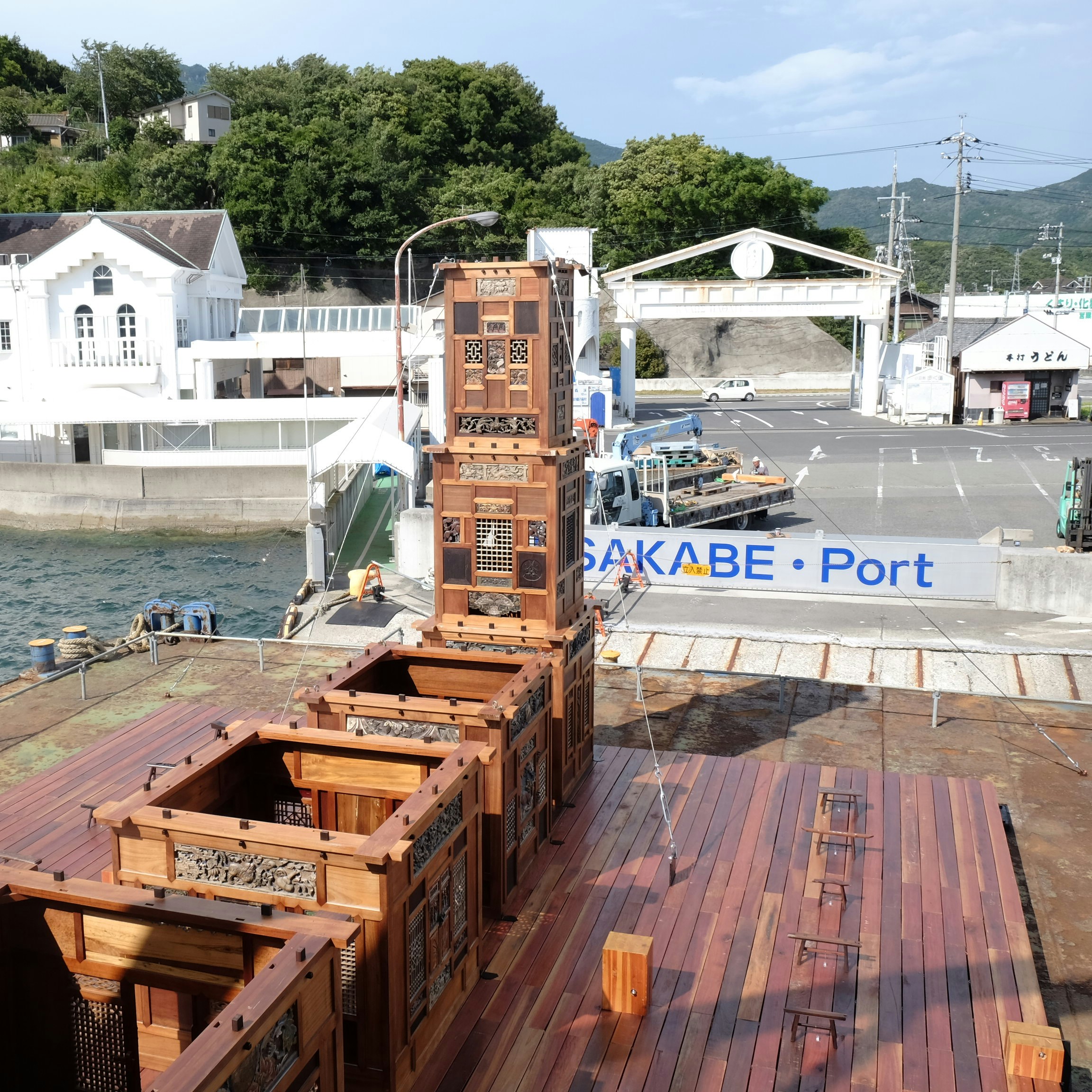 向阳(シャン・ヤン)の《辿り着く向こう岸》(2022)は、現在使われていない草壁港のフェリー用の埠頭につくられた、巨大な木造構造物だ。中国で廃棄された家具や建具を集め、修復して組み合わせることで、船体が逆さまになっているような構造を創出。発展する中国において、忘れ去られ破棄されていく伝統的なものや技術を集積させ、その価値の再考をうながしている。