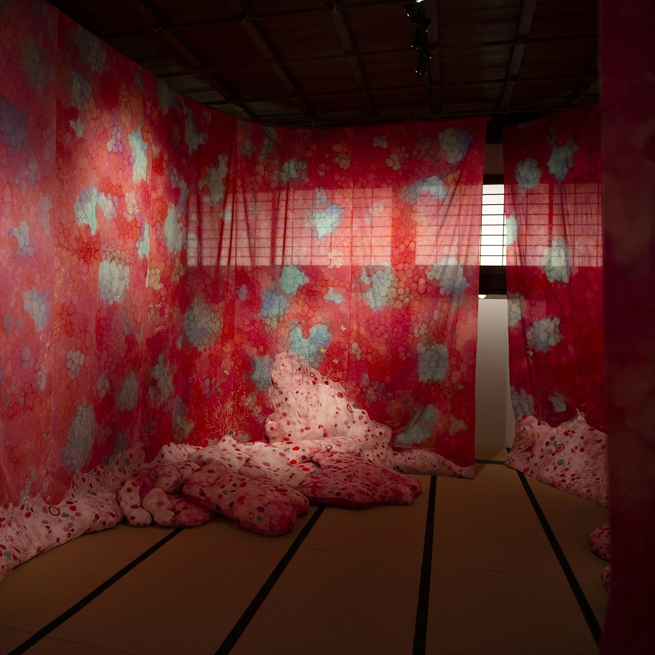 台所の空間には、独学で藍を学び、着物や帯などの実用性のあるものから空間インスタレーションまでを手がける福本潮子が、麻に藍染を施した幔幕を展示。揺れる波のようなテクスチャーが抽象度の高いグラデーションと組み合わさり、奥行きある空間表現を生み出した。