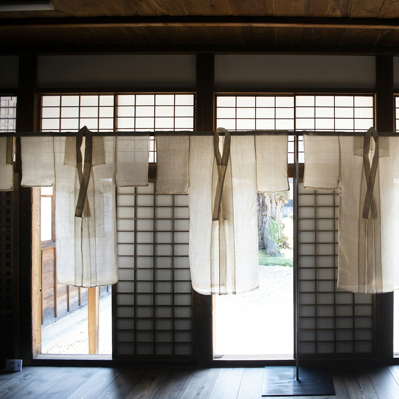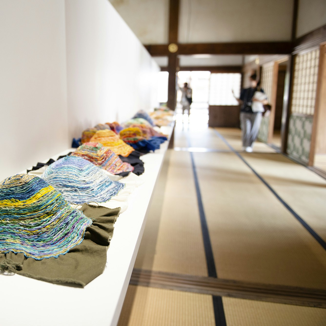 屋内に再び戻ると、アーティストであり自然布の蒐集家・研究家としても知られる吉田真一郎の《白》が、庭を背景に展示。かつて白を追求するペインティングを制作していた吉田は、ヨーゼフ・ボイスとの出会いから古美術や民俗学に目を向けるようになり、麻布の研究を通して白の探求を続けている。40年にわたり蒐集してきた大麻布から、織りや糸の微妙な変化と光の効果から浮かび上がる白の美を提示する。