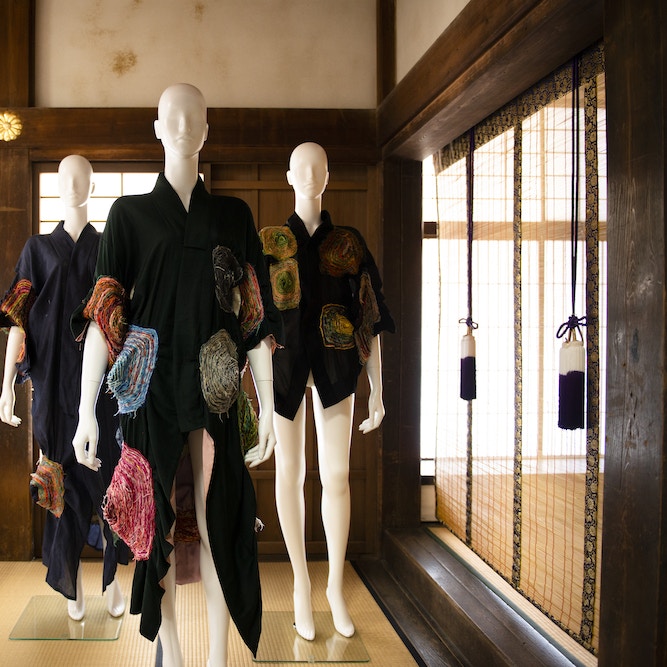 隣の展示空間にも、糸と布の表現が続く。25年にわたり、布に丸い円を縫い続けてきた河合由美子の作品だ。平面的な布に描かれた円が糸で縫い重ねられることで立体的になり、さらに人が身にまとうことで、動きが加わる。1本の糸から始まる展開に想像力が刺激される。