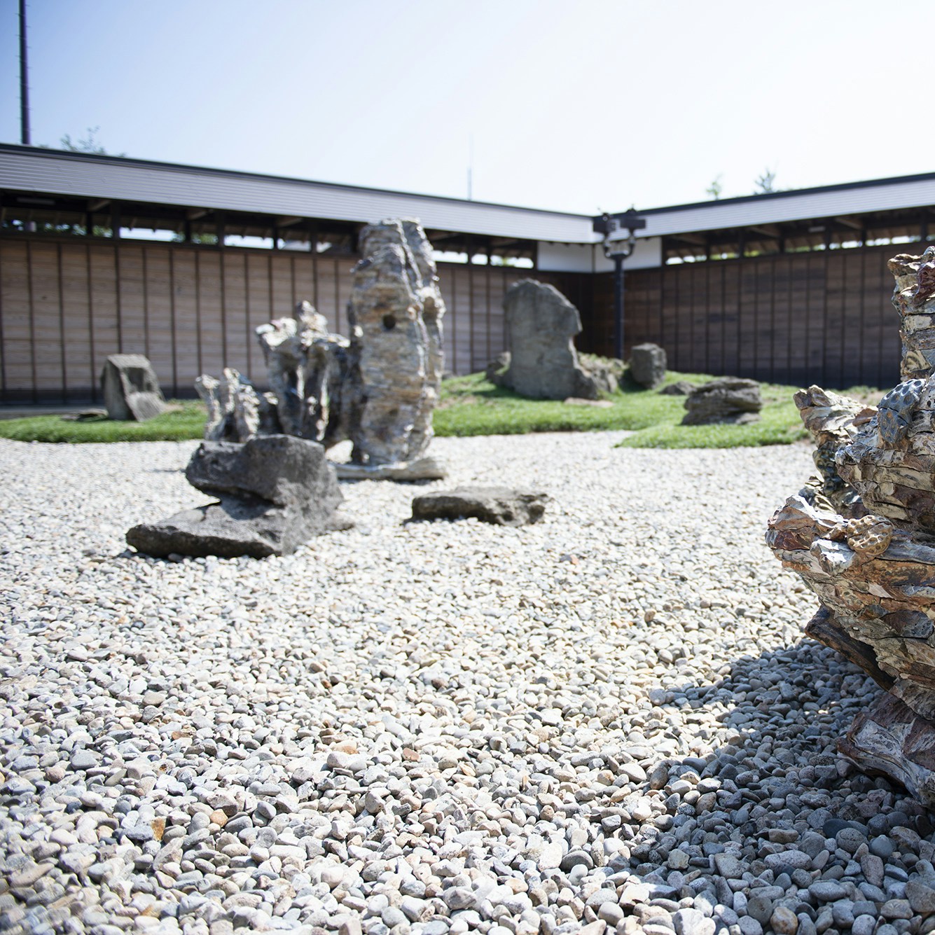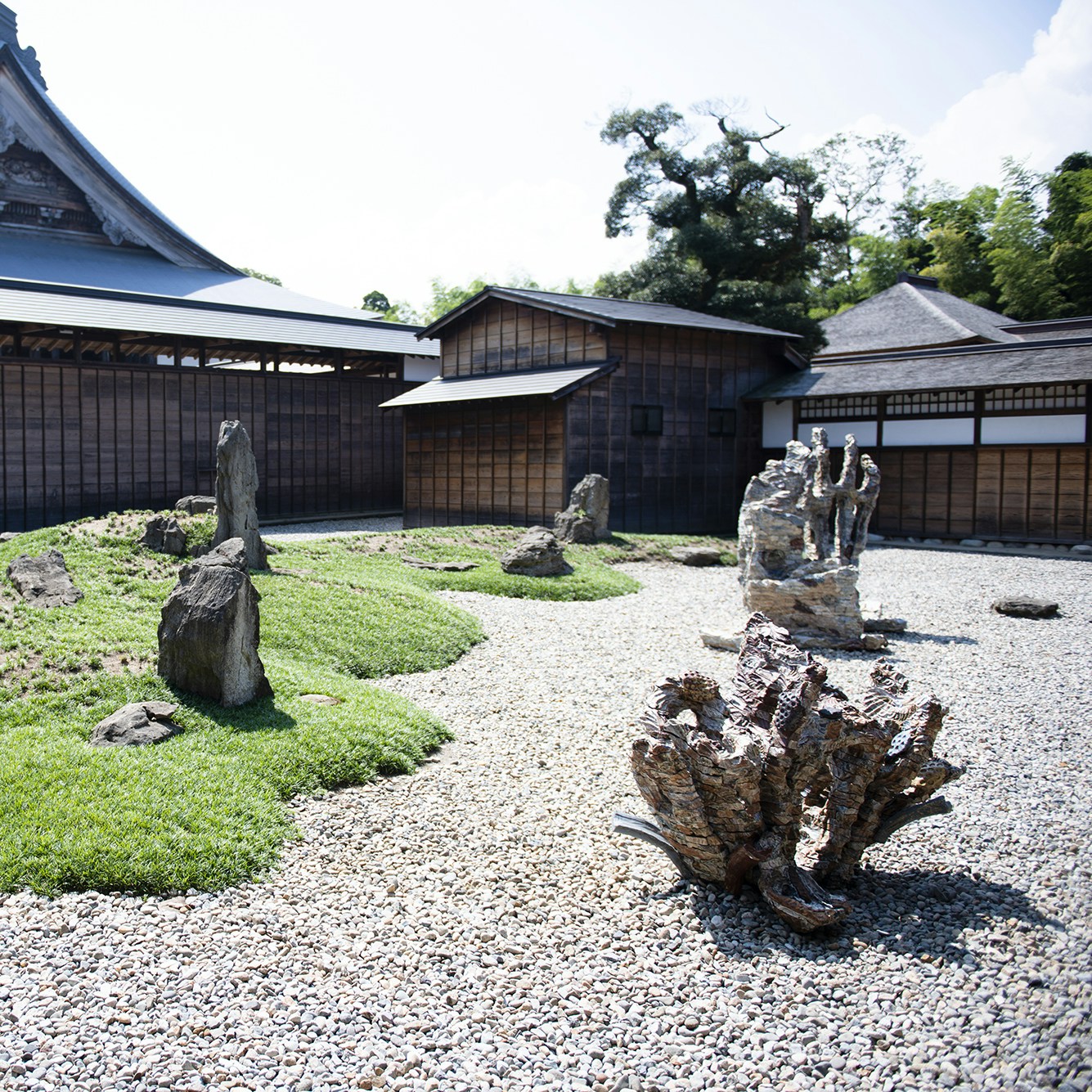 庭園にも作品が展開する。大学で陶芸を学び、当時より身体的スケールで焼き物を制作する小笠原森の作品が石庭で異彩を放つ。土を積層させ、そこに作家が反応することで表れるかたち。素材と身体の繰り返されるインタラクションが作品のヴォリュームを生み、さらには空間に呼応する。庭園に動的なエネルギーをもたらしたような印象を与える表現だ。
