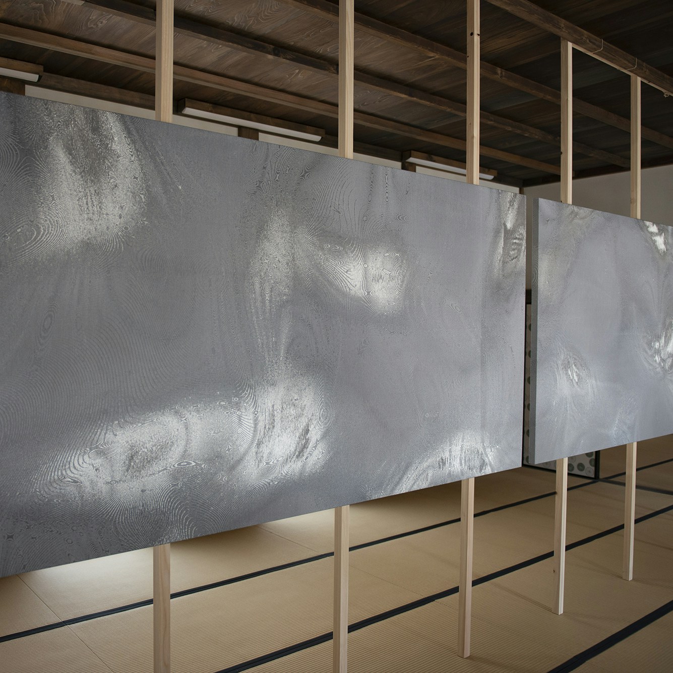 対面には、西陣織の老舗織屋に生まれ、西陣織の新たな表現を目指す細尾真孝が、アーティストでプログラマーである古舘健とともにプログラミングのコードにより生成した織の作品を展示。シルク、レーヨン、銀糸、銀箔を融合させたシャープな織りが、麻の柔らかな風合いとは対称をなす。