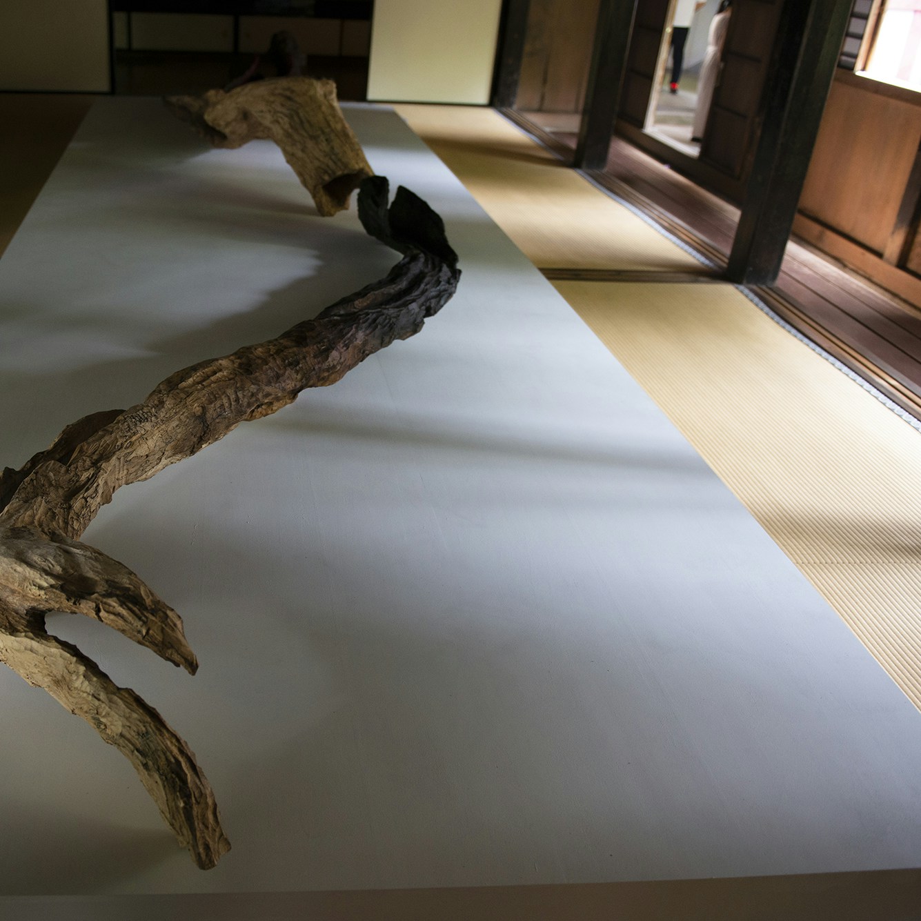 展示は書院より始まる。鵜飼康平の《痕跡》は、境内に放置されていた楢の倒木を用いた作品。自然と朽ちていった倒木の、木の組織が生きている箇所を残し、漆を施すことで木の本来のかたちと経過した時間の痕跡を表現した。普段は綺麗に調整された木材を使用する鵜飼は、「それ自体がストーリーを持つような木を使うことが新鮮で。制作が発掘作業のようだった」と話す。