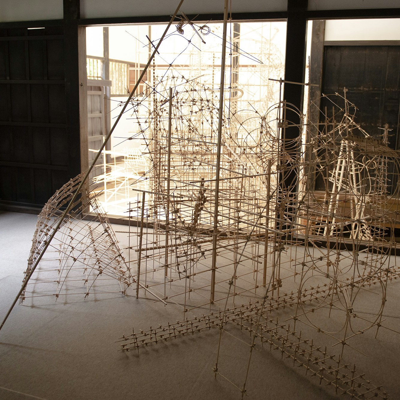 ここで最初に出会う作品は、重要文化財に指定された大広間や式台、台所、書院など一連の建物の外に設置された宮木亜菜の作品。自身の身体を物質としてとらえ、自ら作品の一部となるインスタレーションやパフォーマンスを発表する宮木は、鉄の板と向き合い、「鉄の声を聞きながら、反発しあいながら鉄の板を折り曲げ、素材が持っている必然的なかたち」を作品化した。