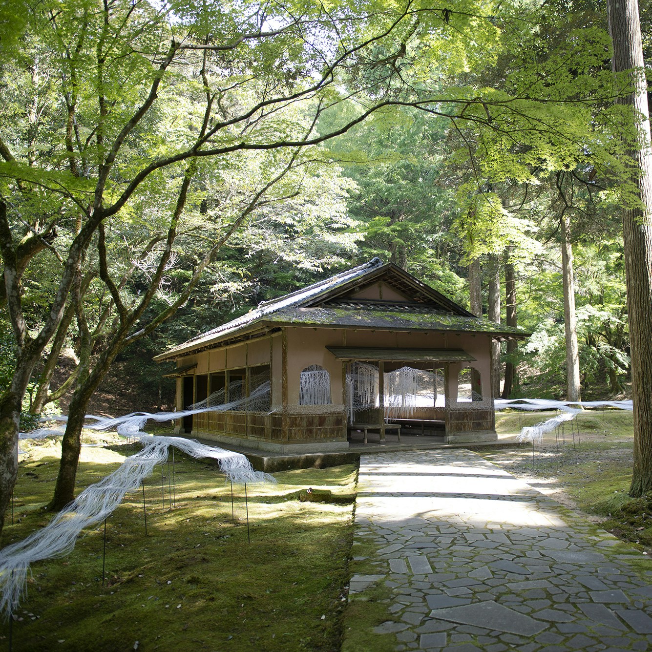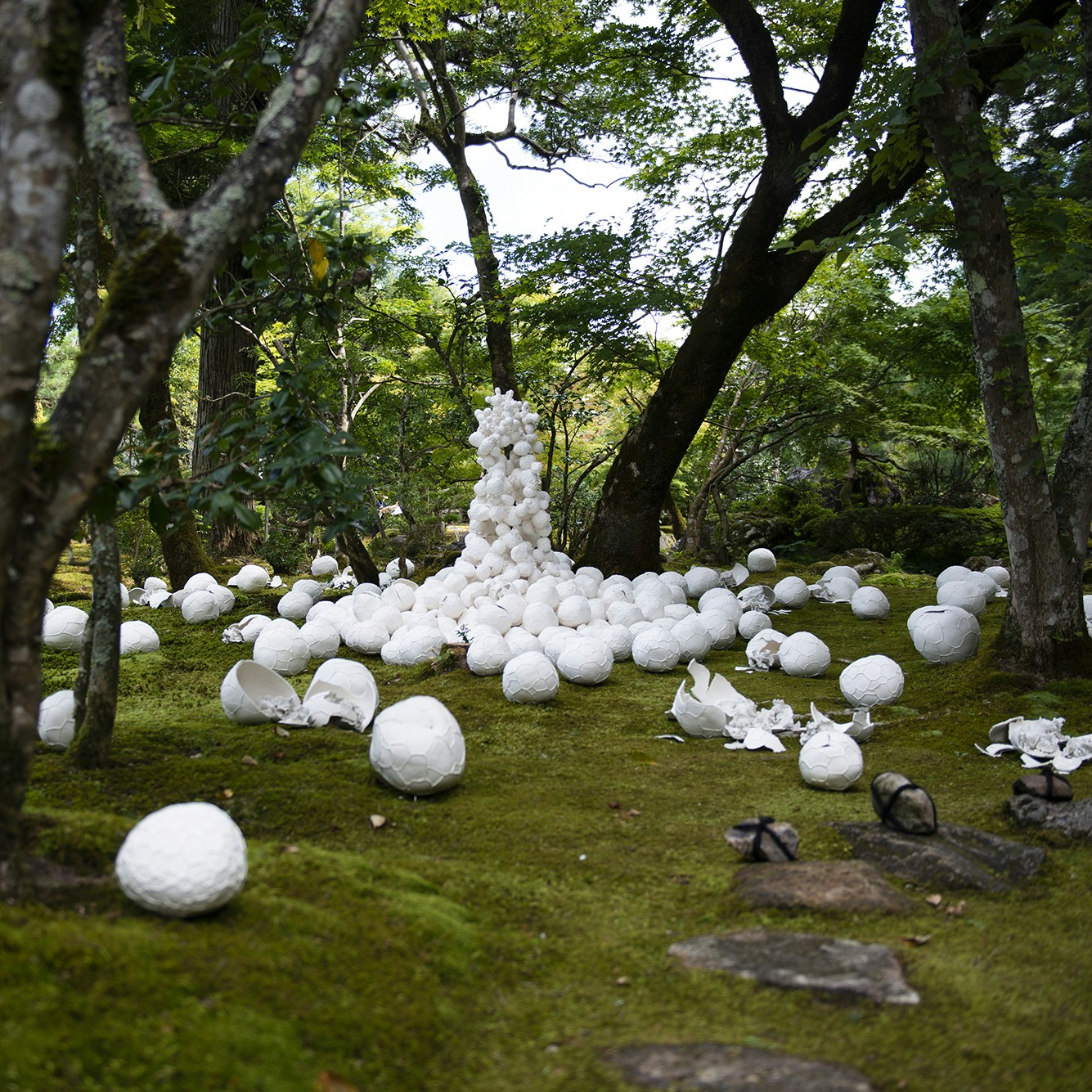 書院の外に出ると、庭園には佐合道子が磁器を用いたインスタレーションを展開する。那谷寺を印象付ける苔や、奇岩とどのように関係するか。九谷焼の土も使用し、空間とのハーモニーが表現されている。新里明士も磁器を用いて空間に介入するような作品を制作しており、そこに響く音を可視化したような、あるいは過去に存在した人や自然物の痕跡を立ち上らせたような印象を与える。