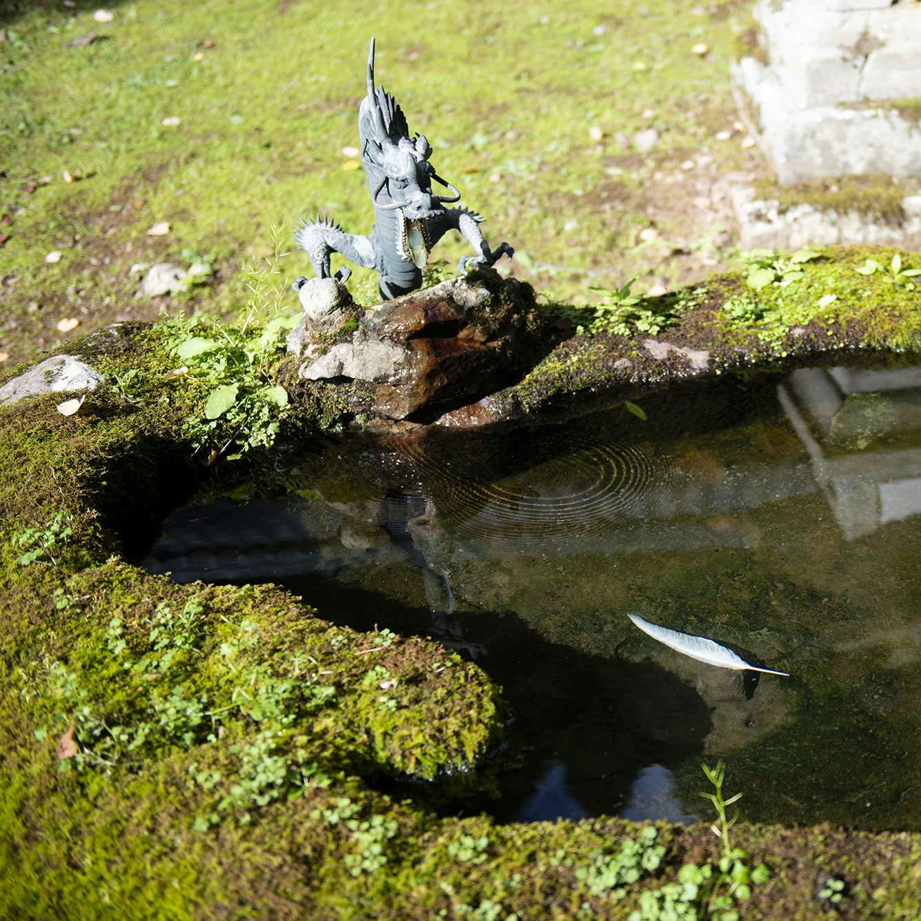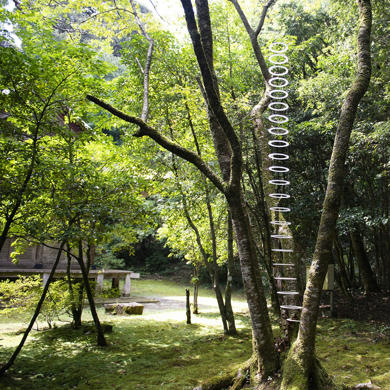 さらに奥へ。自然保護のために靴を脱ぎ、草鞋に履き替えて山道を歩く。手水に羽の彫刻作品を展示する橋本雅也が、この地を散策し、百合の花をモチーフに制作した作品を木の洞に設置した。「場に身を浸し、そこで立ち上がってくるものを待つ」という橋本の制作方法により、鹿角を素材に新たな神話を連想させるような美しい作品が生み出された。