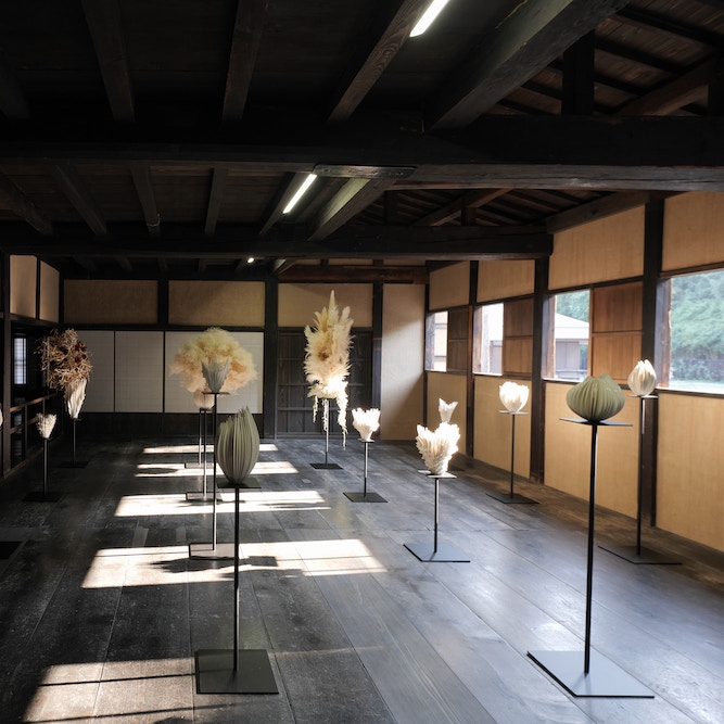 陶芸家で建築家の顔も持つ奈良祐希は、小原流五世家元の小原宏貴とコラボレーションを行った。作品タイトルは《con-temple-ate》。熟考し、あるいは瞑想し内面と向き合うことを意味する動詞「contemplate」を起点に、生の土を焼成することで固定化した焼き物と、水分を失い乾燥させることでやはり変化を止めたドライフラワーに「死」のイメージを重ね、寺の整然とした空間にグリッド状に作品を配置。展示には建築家の周防貴之、総合監修の秋元雄史も加わり、空間全体で死生観を表現するインスタレーションが完成した。