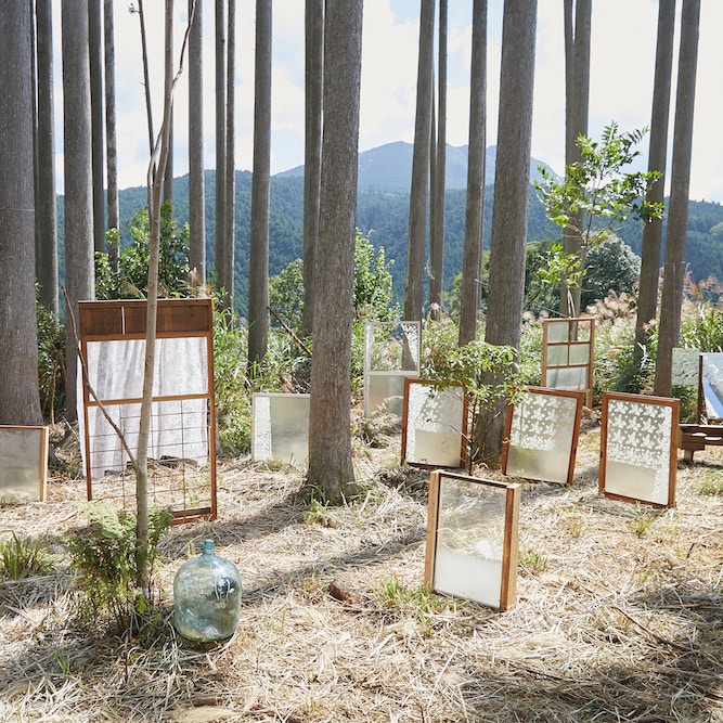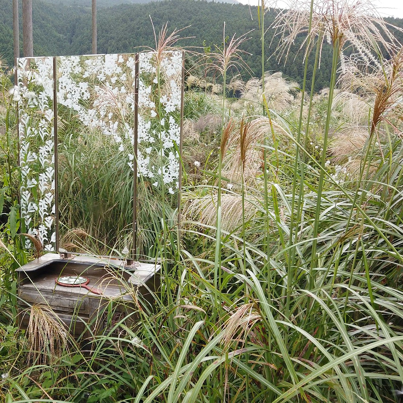 トレイルを歩きながら、随所で足元に設置されたMIND TRAILの矢印を追いかける。舗装された道から脇に入り、ススキの草原に向かうと、前田エマが曽爾村の住民が実際に使用していた家具や食器を使って制作した《窓》が設置されている。窓や鏡などを通して曽爾村を再発見するこの作品。曽爾村の自然に住民たちの生活史が溶け込んだような幻想的な展示風景が広がる。