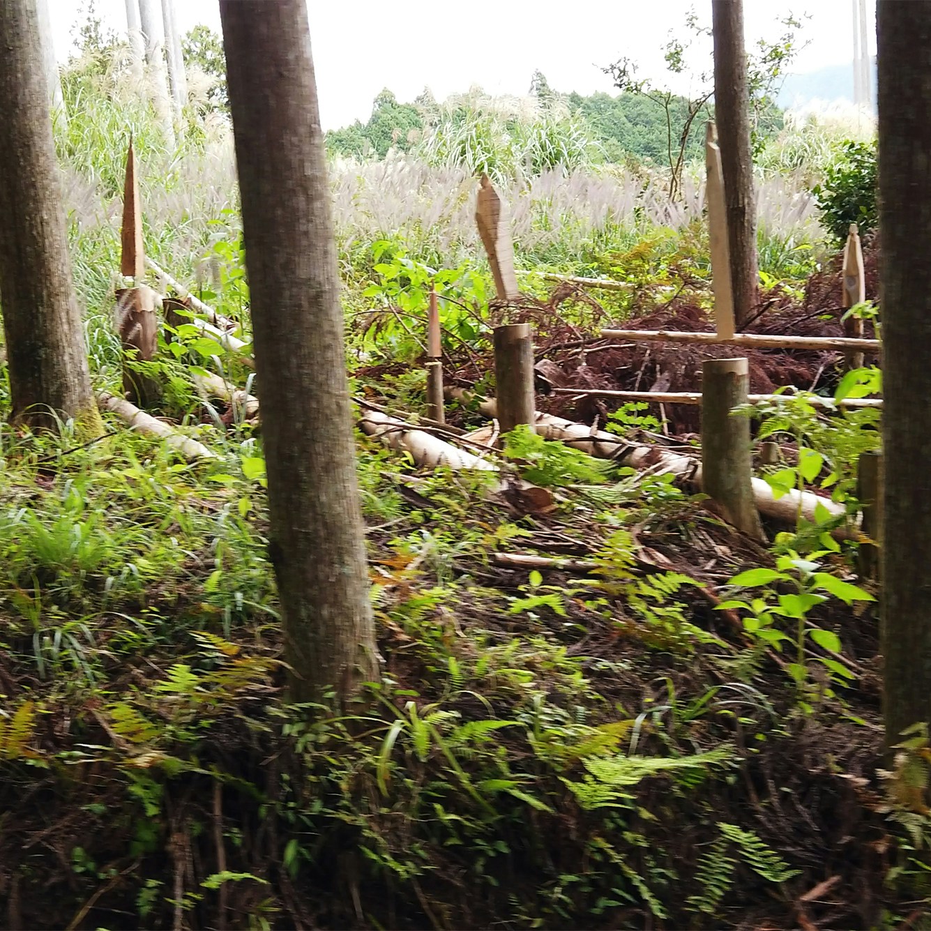 役場前の道を東北方向に進むと、10分ほどで門僕神社が見えてくる。その麓に展示された三瓶祐治の作品《クシティ・ガルバ》は、トレイル中に点在する切り株をサンスクリット語で「大地の母胎」を語源とする地蔵菩薩に見立てて制作された。無数の樹木の様子に「千仏思想に通じる何かを感じた」という三瓶によるこの作品は、トレイル中の複数箇所に設置されており、無数の地蔵菩薩を数えながら森の樹々への思いが深まっていく。