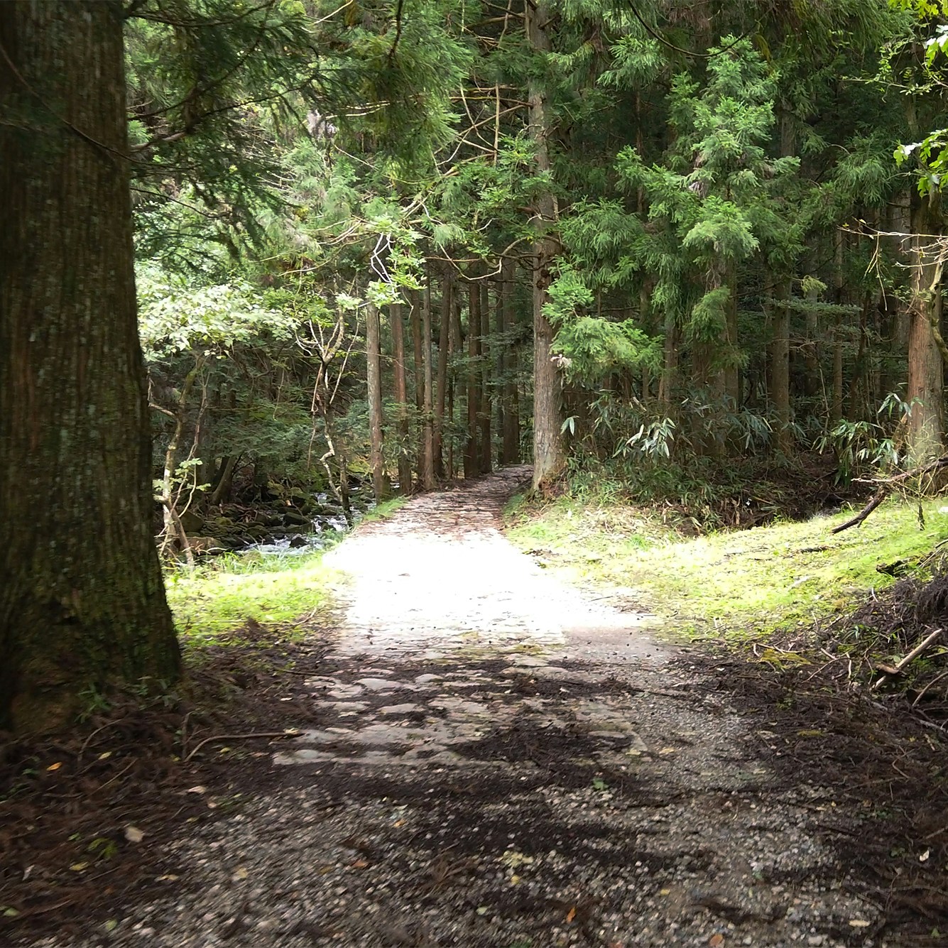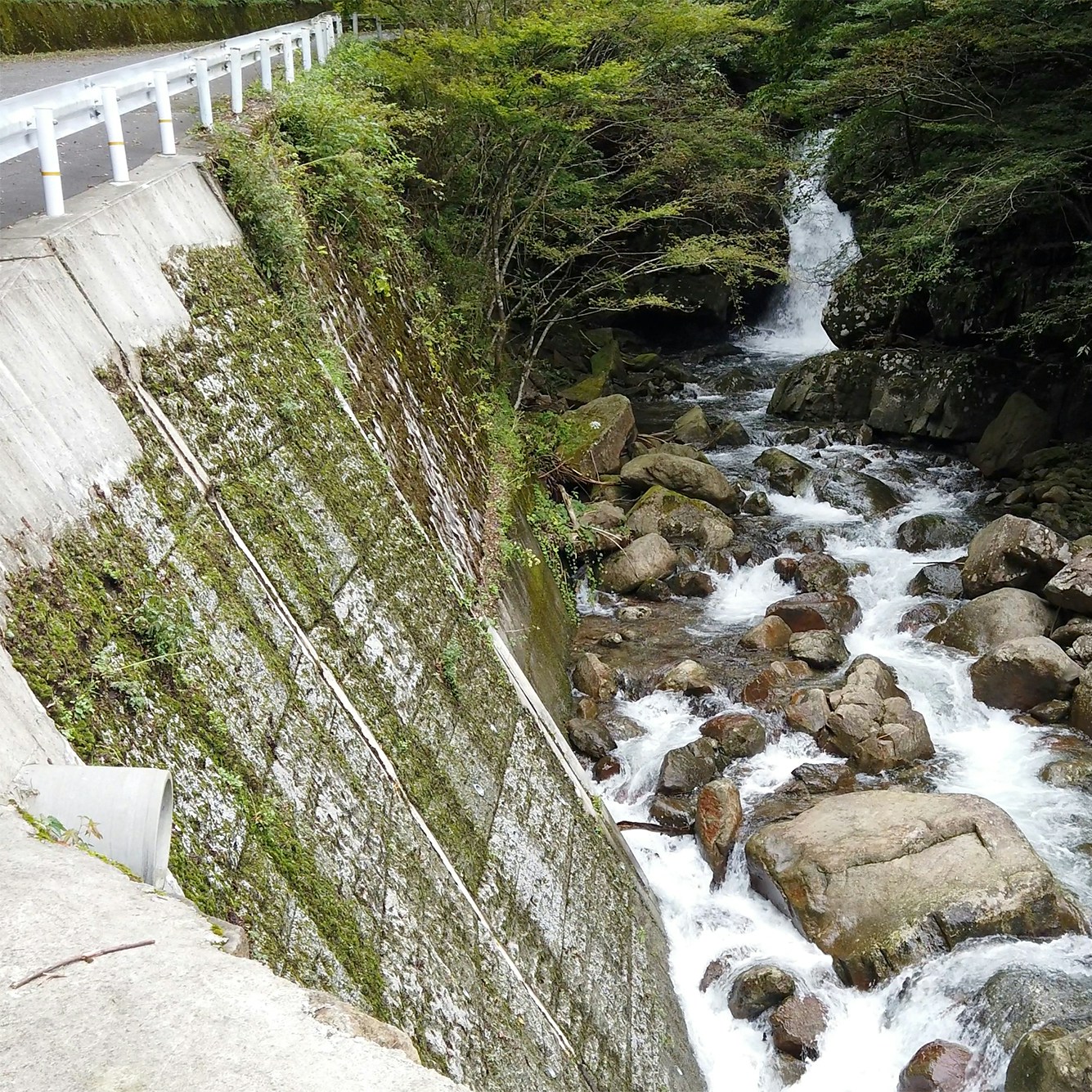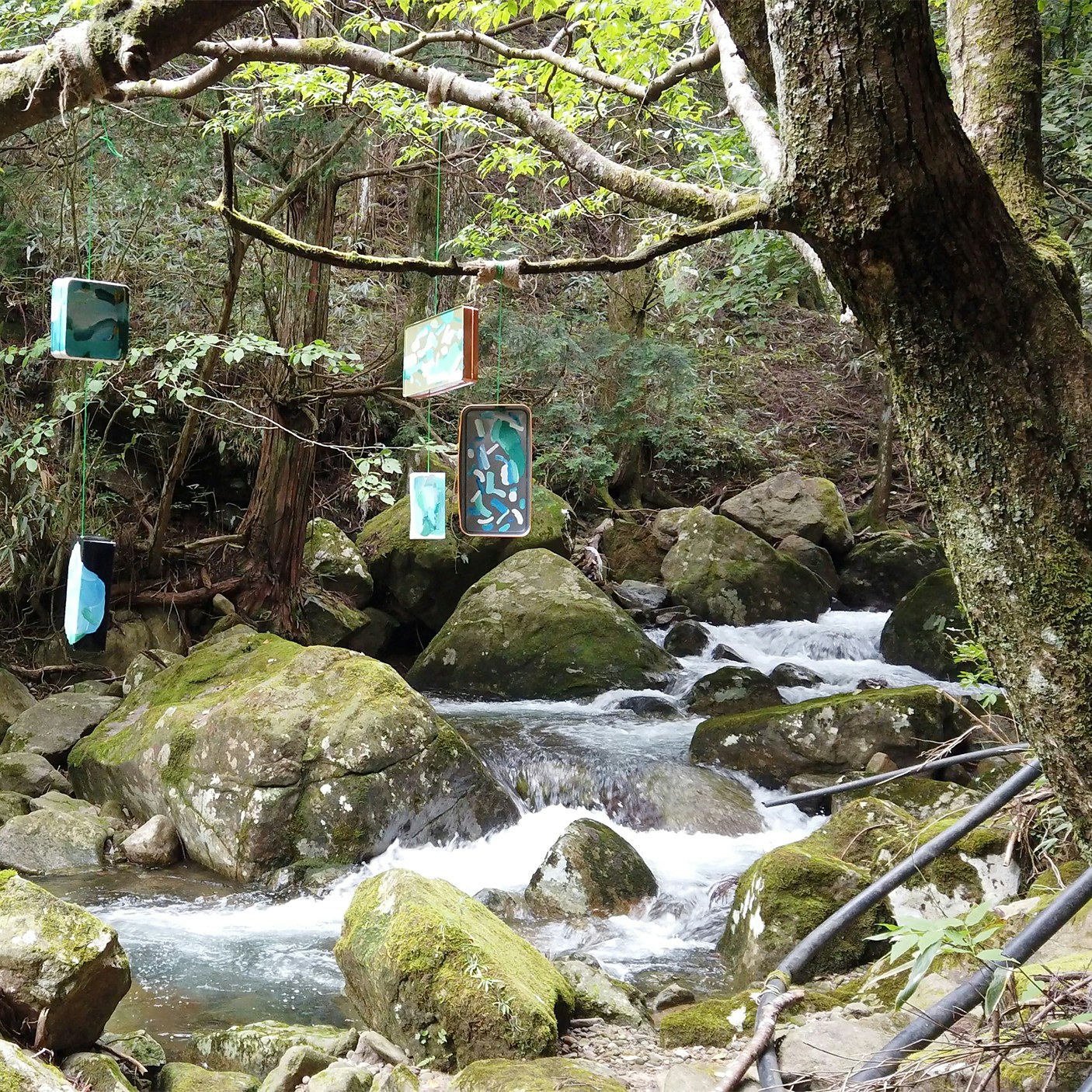 しばらく舗装された山道を歩く。「長走りの滝」を横目にしばらく進むと、コースは山道に入っていく。川が流れ、水量が多いために少しの高低差で滝になっている箇所も多く、奥大和の水の豊かさが感じられる。山道に入り、最初に出会う作品が長岡綾子《Mirrors for Weeds》。さらに歩みを進めると、尾柳佳枝《外に囲まれている絵》も川の上に見えてくる。どちらもコースの序盤で一度出会った作品だが、周囲の光や植物など、背景が変わると当然ながら作品の表情も変化する。