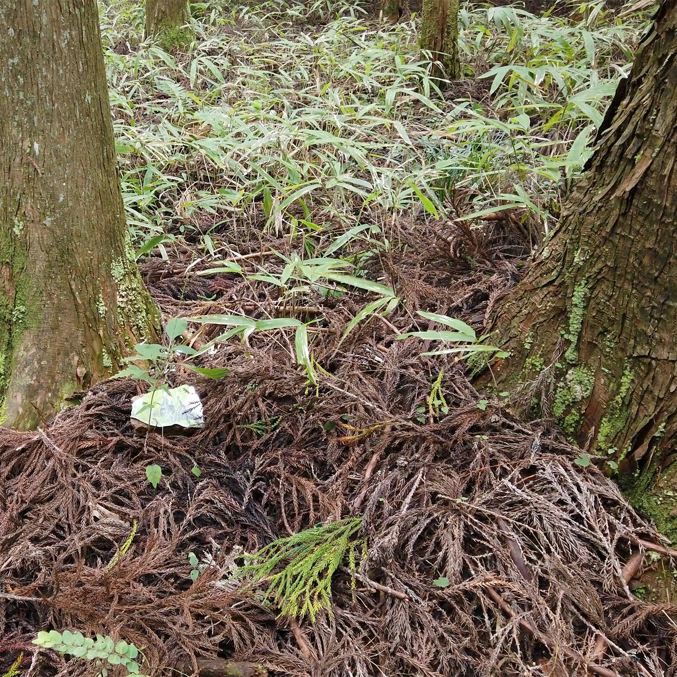 そしてすぐ裏手には岩谷雪子《私に気づいて》、少し坂を上ると長岡綾子《Mirrors for Weeds》が展示されており、いずれも山の木や草から発想が生まれた作品だということがわかる。岩谷と長岡の作品もトレイル中の複数箇所で展開しており、場所ごとに異なる姿を見せる。作家たちを自然がインスパイアし、新たな発想が生まれており、展示のスタート地点からトレイル全体への期待が高まる。