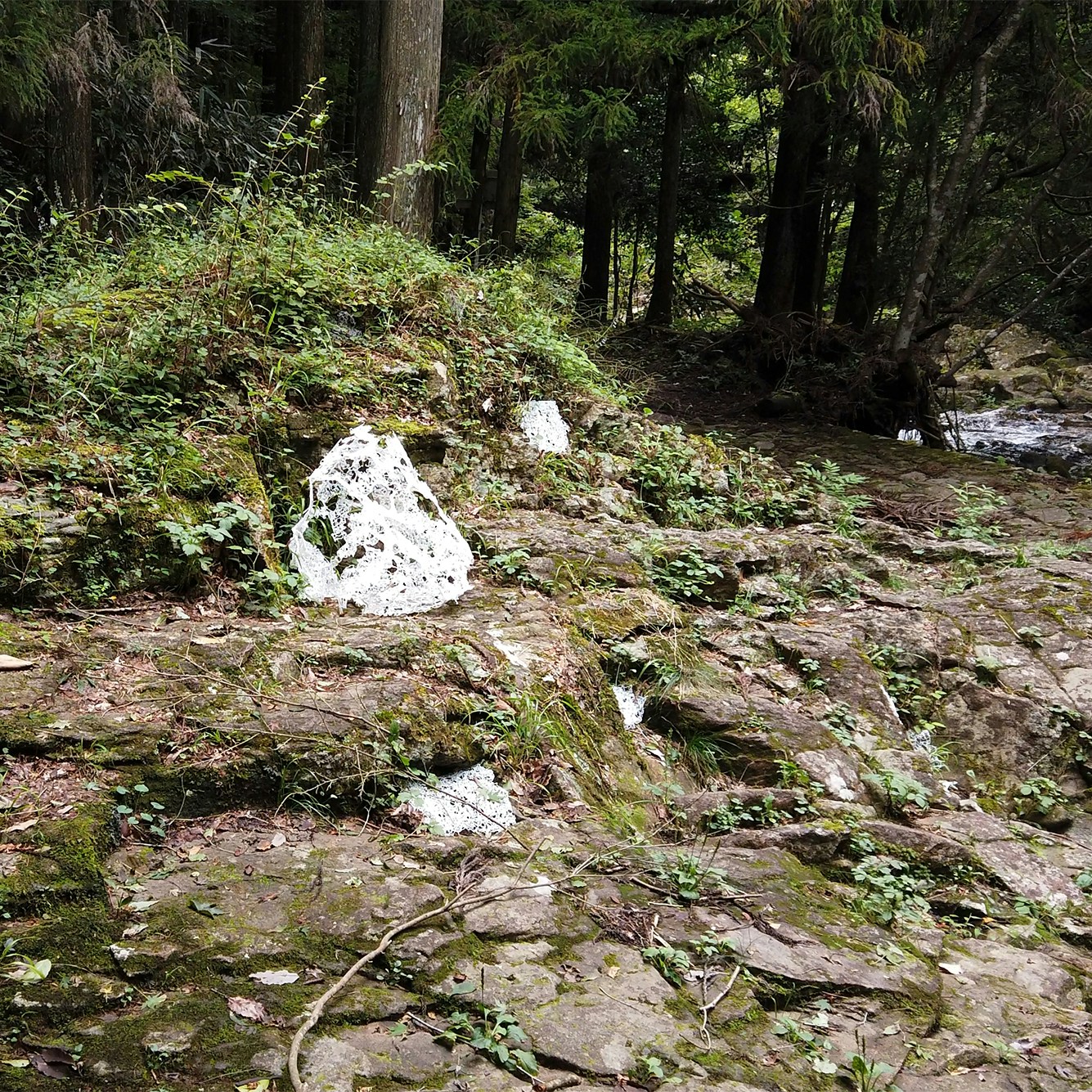 川沿いを歩き、少し視界が開けた場所にたどり着くと、小松原智史による《コマノエ》が設置。自然の中にあるかたちや、あったかもしれないかたちを借りて立体的に描いたドローイング作品だ。植物的であり、空気や水の流れのようでもあり、空間から感じ取ったものを視覚化するまでのプロセスを想像しながら先に進む。かつて寺があり、修験者が行水をして身を浄め、水煙大不動明王の霊を仰いだと言われる「済浄坊の滝」がほど近い。