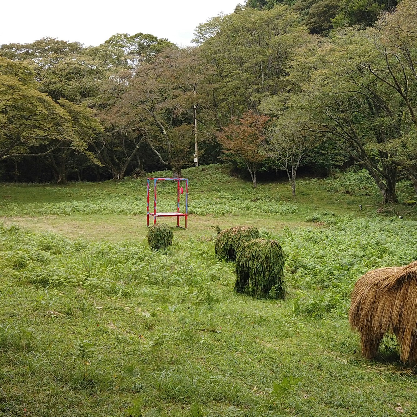しばらく山道を歩き、次に出会う作品が西岡潔《存在Xここと向こう側を意識する為の装置》。植物で覆われた動物の半身のような存在が森の中に佇んでいる。そこに鑑賞者が上がり込み、「顔ハメ看板」の要領で向かい側の鏡を見ると、自分が動物と一体化して森の中に存在する様子が目に入ってくる。森の中でケンタウロスになった自分。森にひとり、シュールな体験に笑いが込み上げてくる。