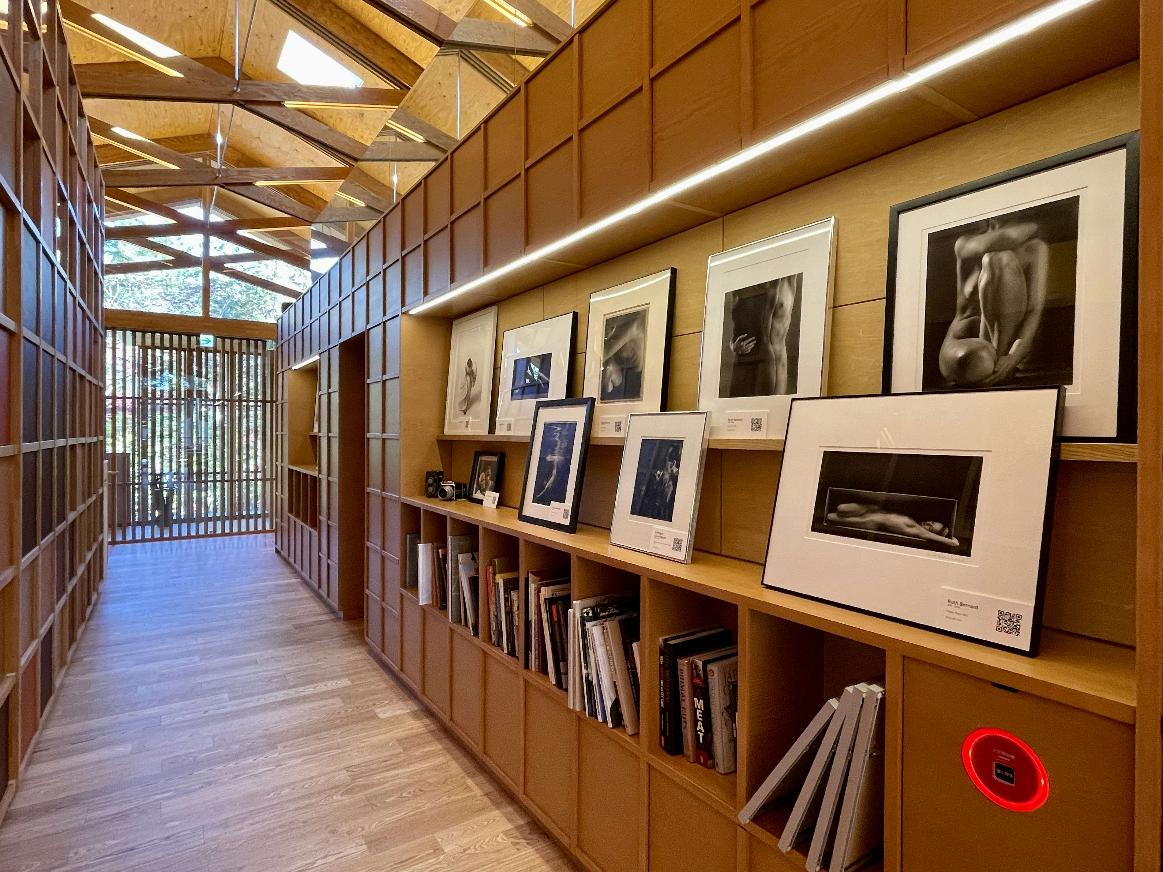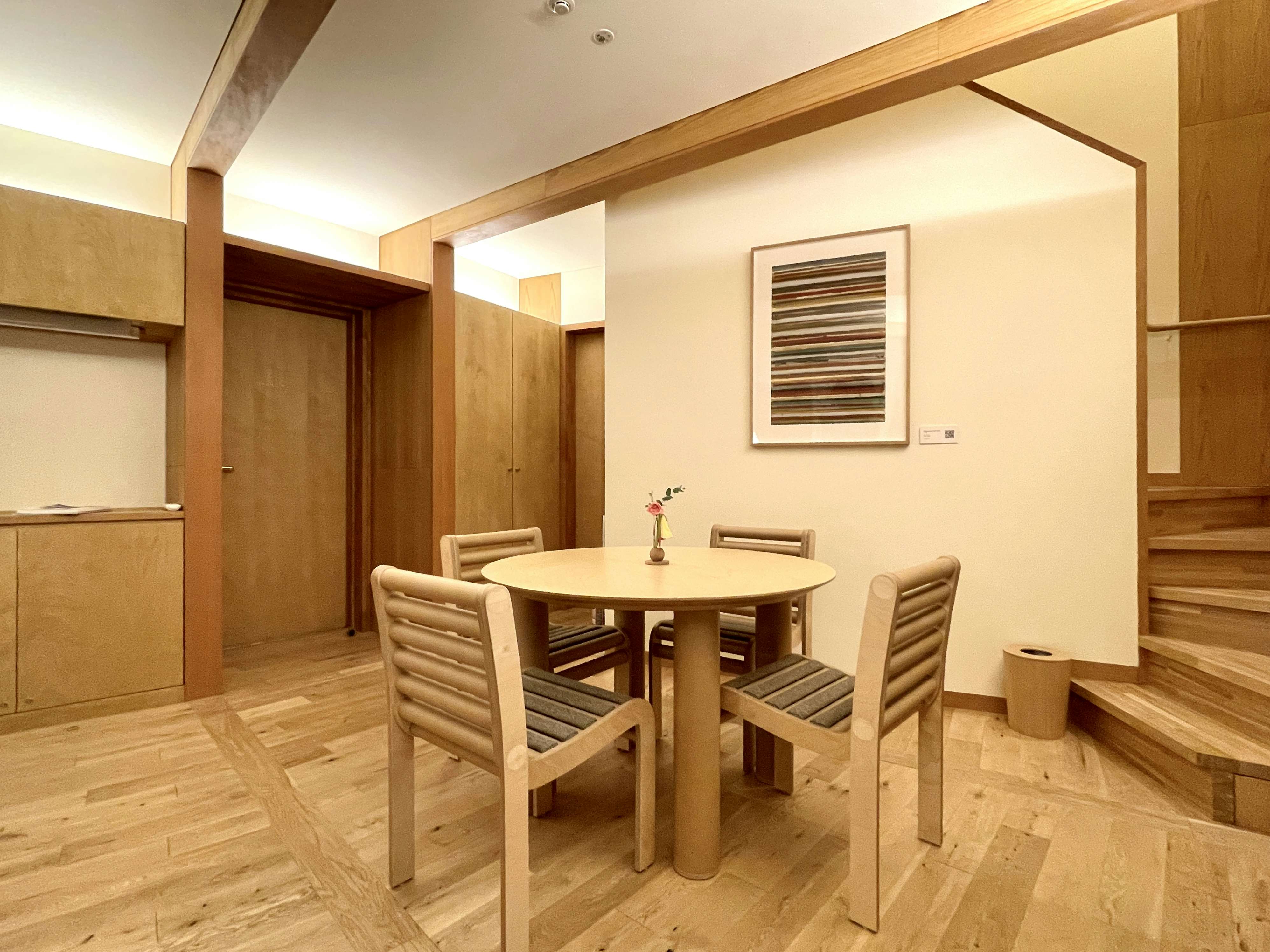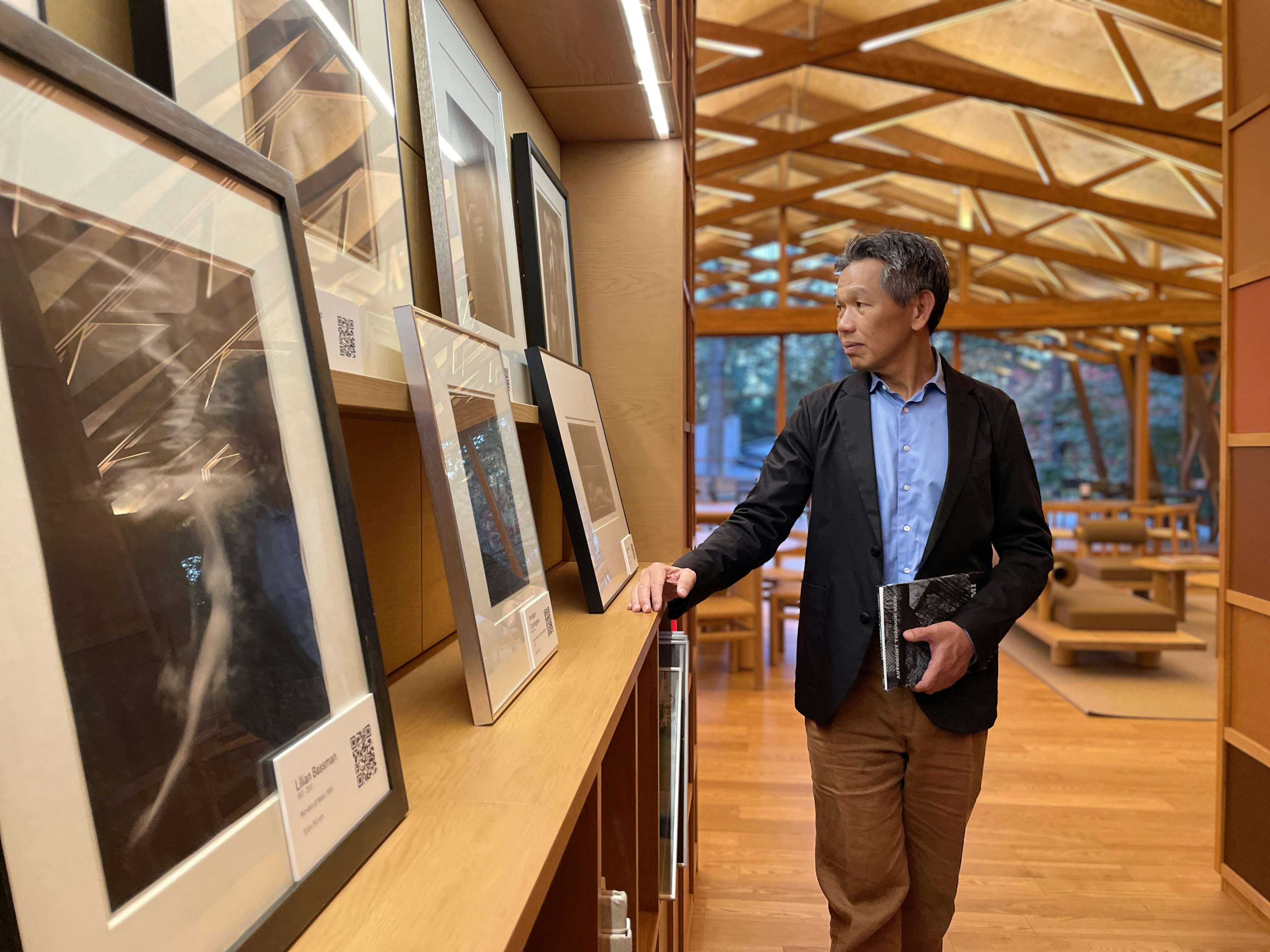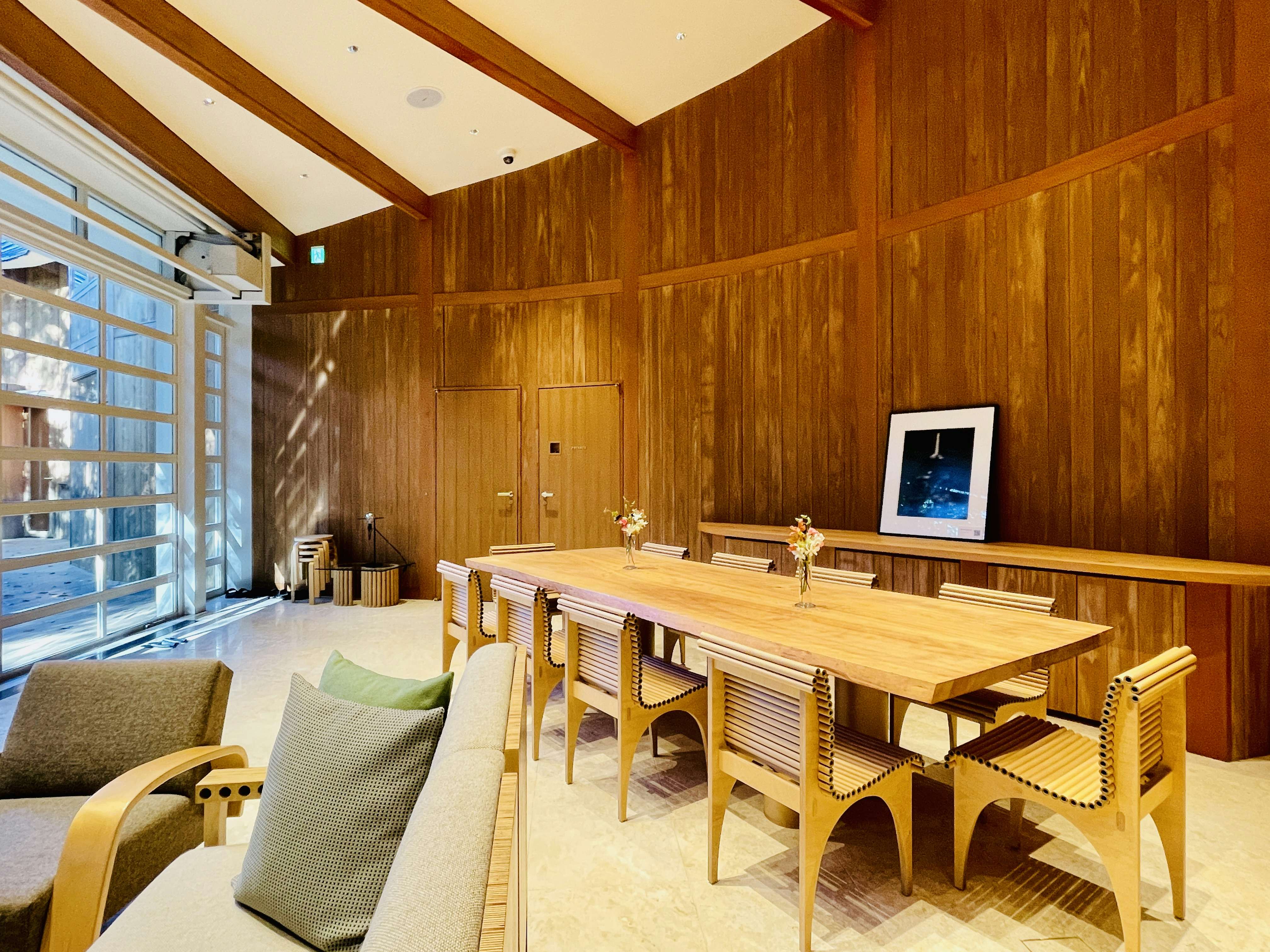グランドルームにあるテーブルや椅子も坂茂デザイン。右手に見えるのは杉本博司《エンパイア・ステート・ビルディング)》(1997)
