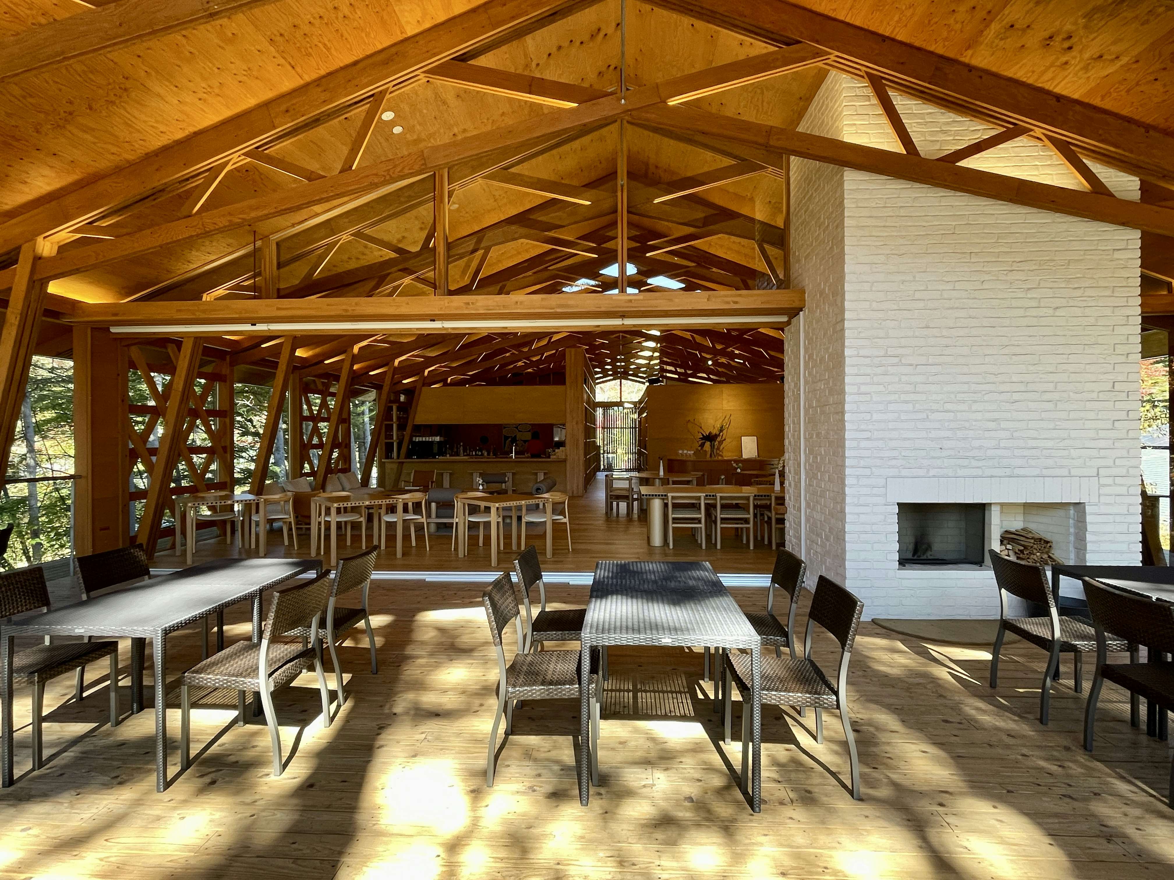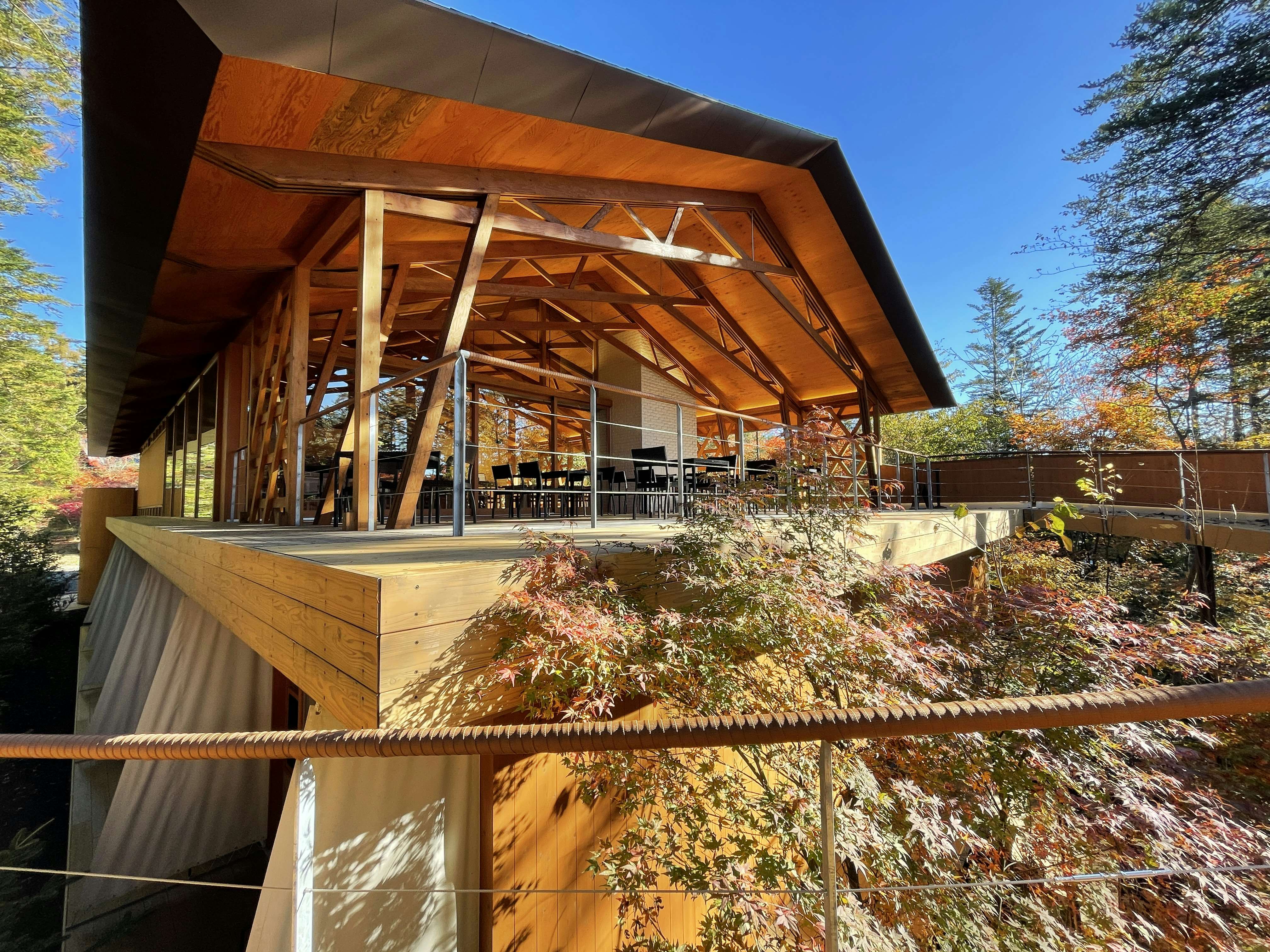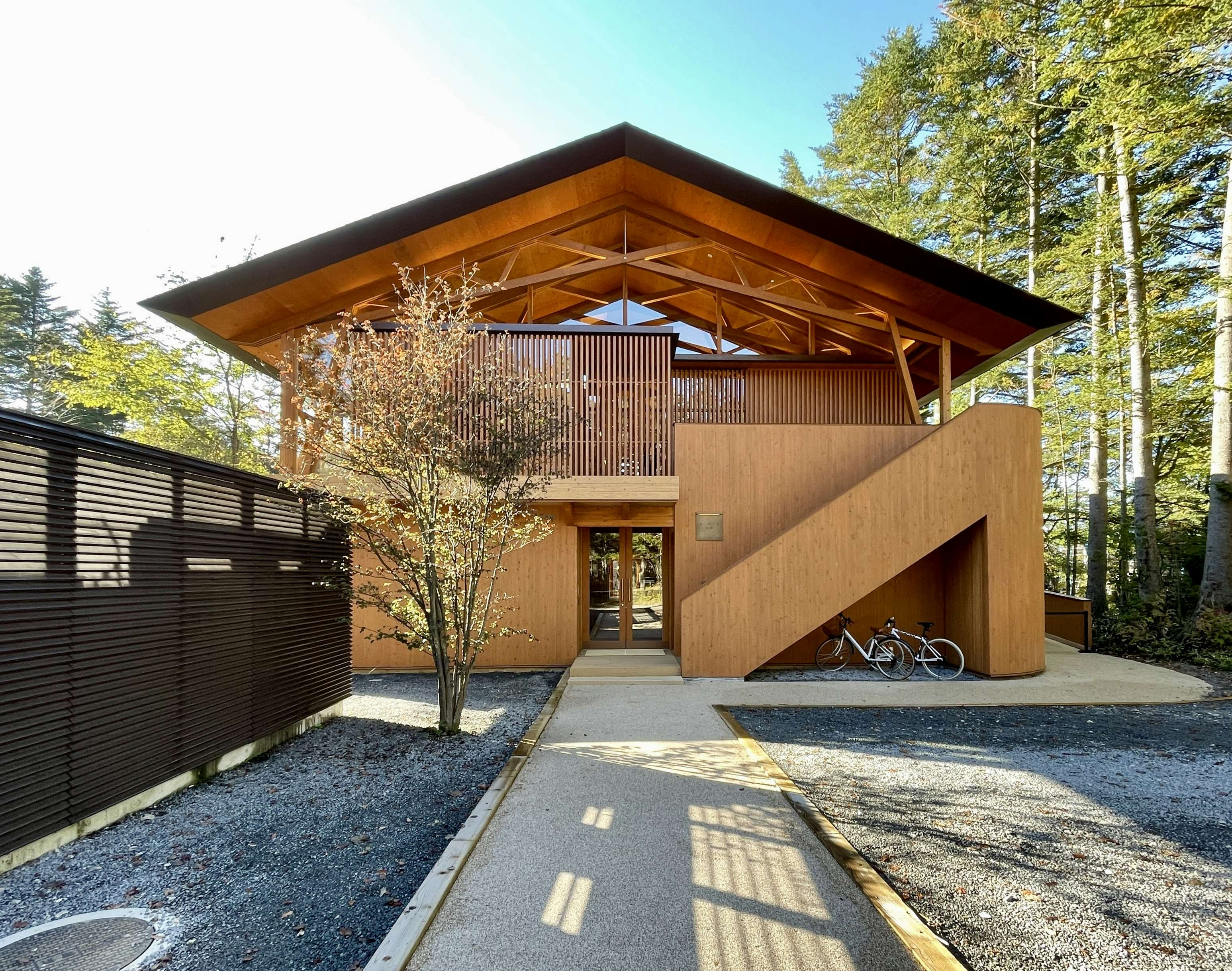 ししいわハウス軽井沢No.2(SSH No.2)の外観(フォレストテラス側)。長いスロープの先にテラスとレストランがある