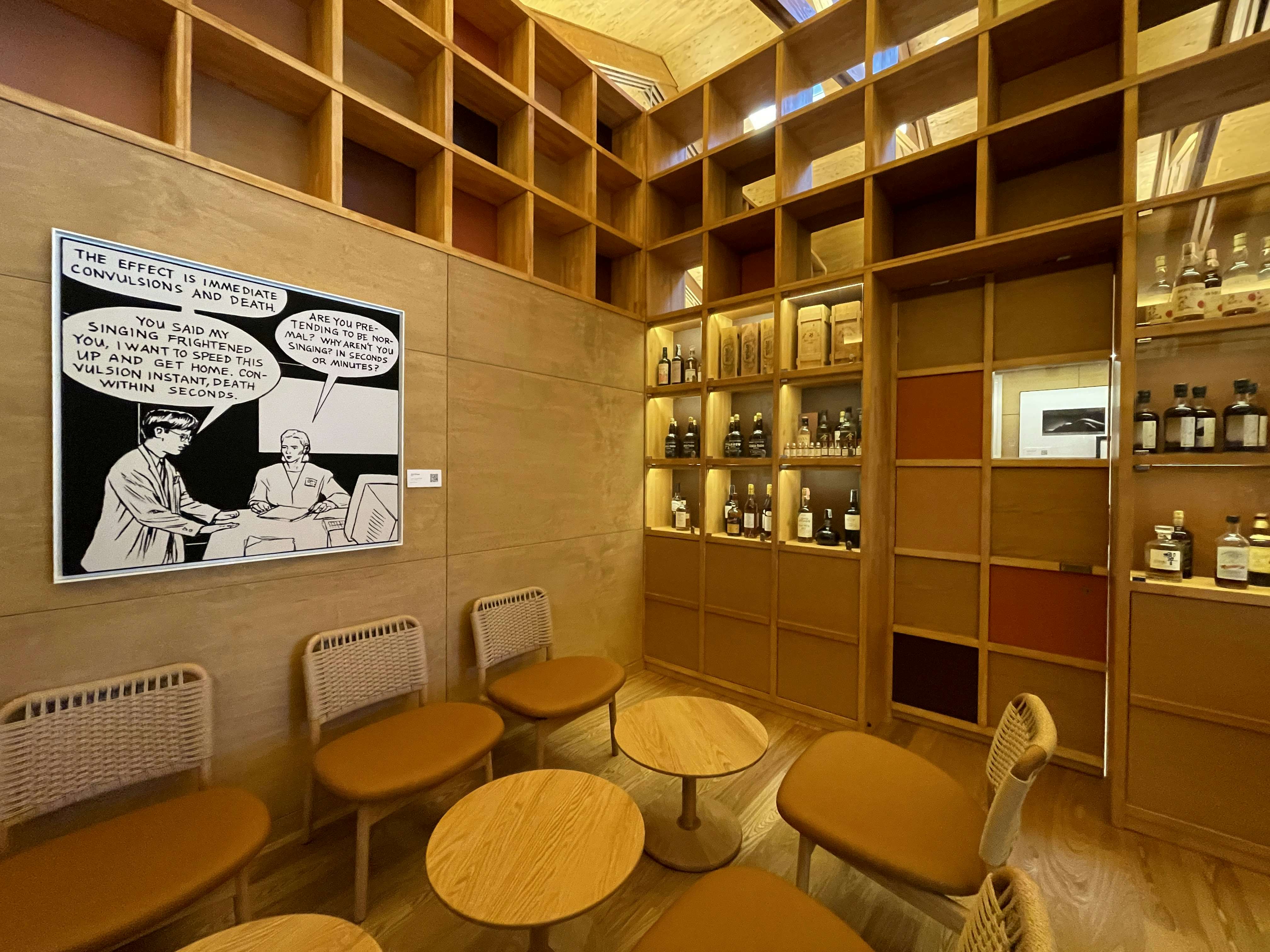 貴重なシングルモルトが並ぶ「ザ・ワイン&ウイスキー・バー」にも作品が展示されている。ジム・ショーの《Horror a Vacui #22》(1992)