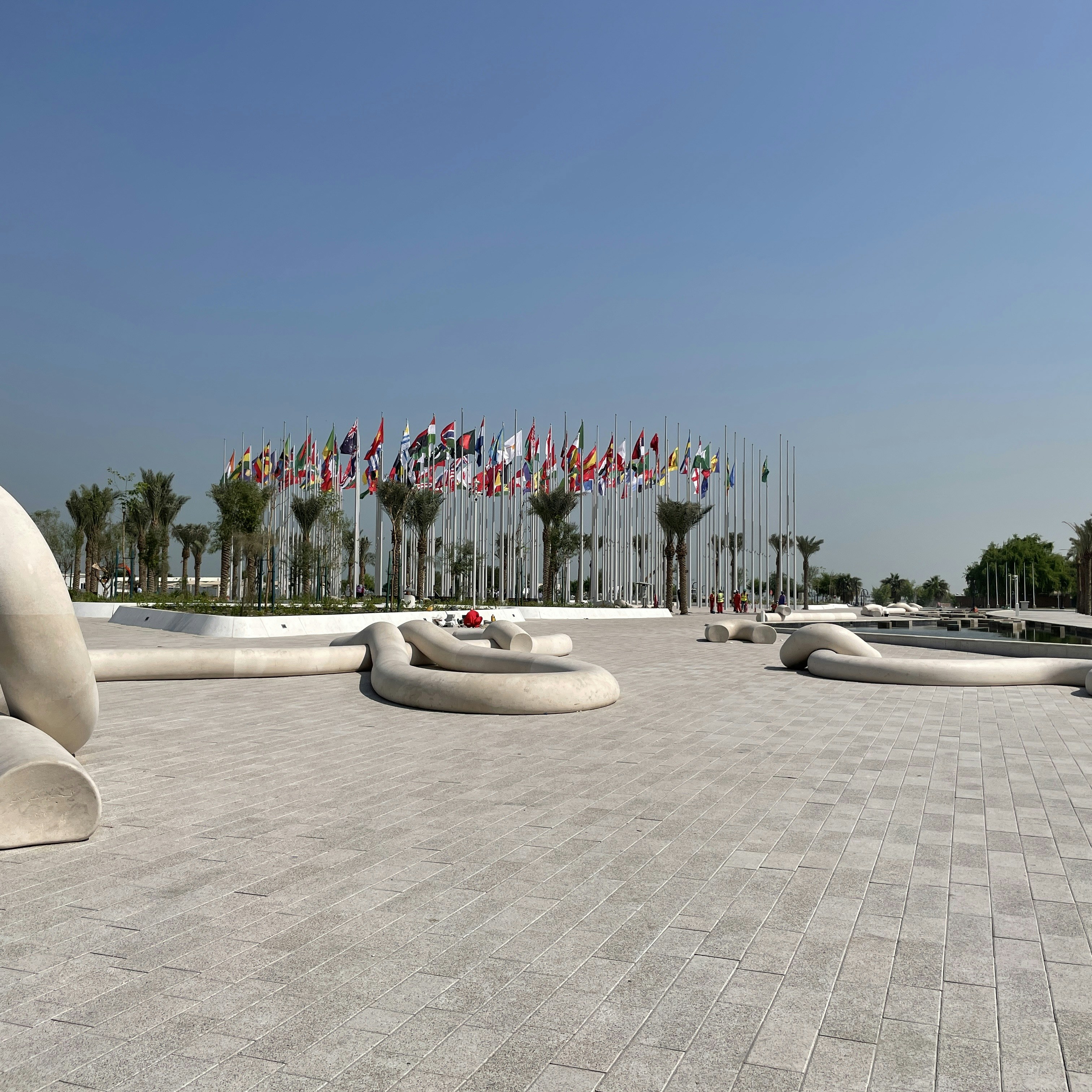 イスラム美術館が所在するMIAパークに隣接するフラッグ・プラザでは、レバノン系フランス人アーティスト、ナジャ・エル・ゼインがレバノンの職人たちとともに手作業で制作した全長313メートルにもおよぶ石灰岩のインスタレーション《Us, Her, Him》(2022)が展示されている。人と人とのつながりの複雑さと重要性を考察し、愛、内向性、自信、親しみなど人間の相互作用における様々な感情や様式を示すというものだ。