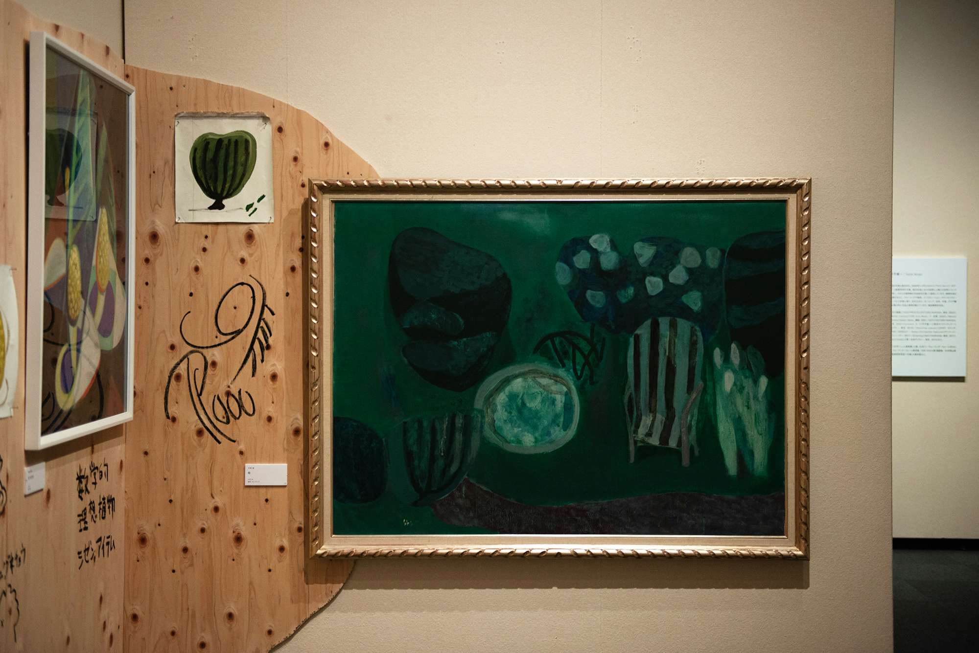 展示風景より、左から小林猶治郎《鶏頭》(1932)、佐藤多持《華(水芭蕉)》(1954)