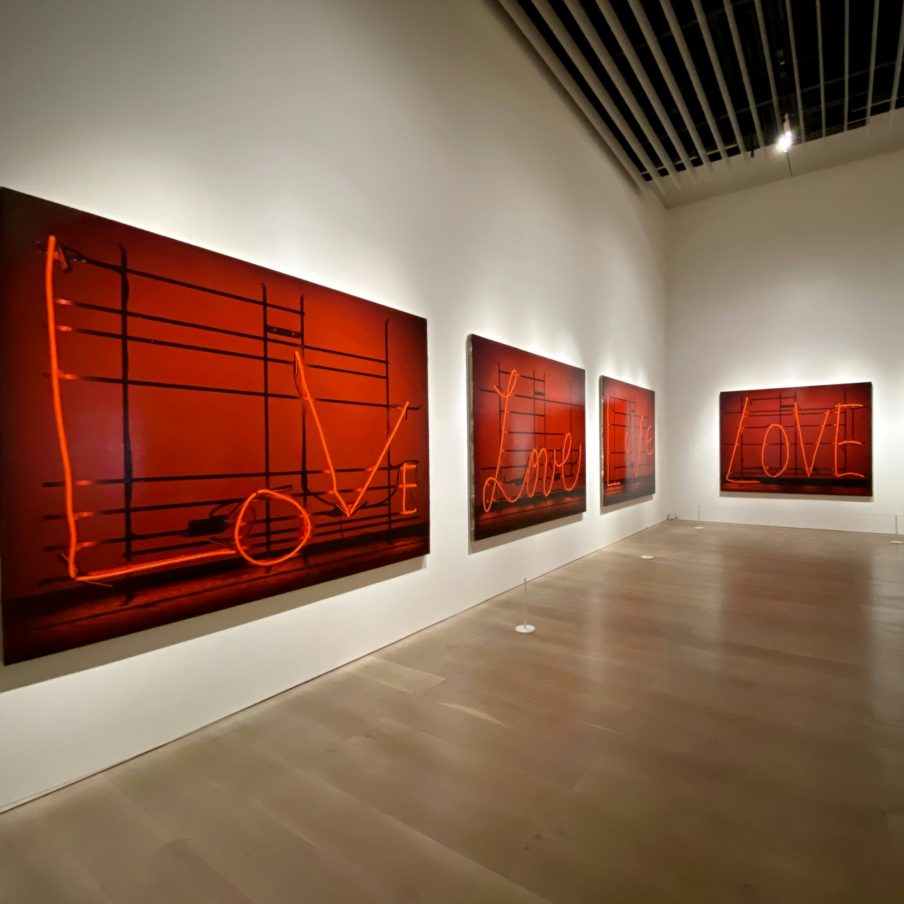 向かいの壁には、横山奈美が本展のために制作した新作ペインティング《Shape of your Words - T.K. -》が展示されている。一見写真のようにも見えるこの作品は、知人による手書き文字をもとに横山がネオン管を制作して、それを見ながら描かれたものだという。文字のかたちが多様であるように、LOVEも多様というメッセージが感じられる。