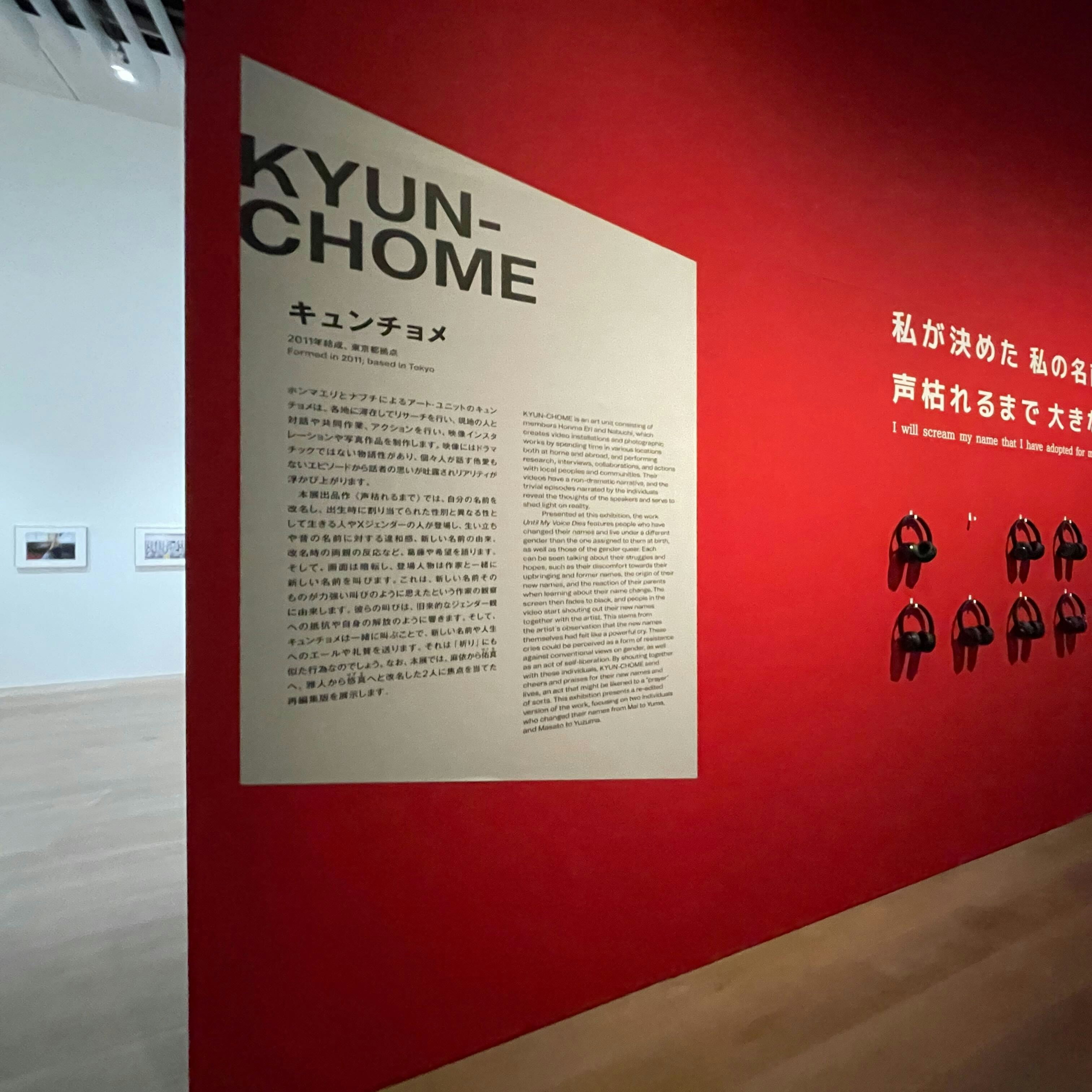 左手の壁の向こう側では、キュンチョメの映像インスタレーション《声枯れるまで》が鑑賞できる。2019年のあいちトリエンナーレでも展示されたこの作品は、トランスジェンダーの登場人物がその性と名前を変えるまでの歴史を語り、新しい性の名前を叫ぶというもの。