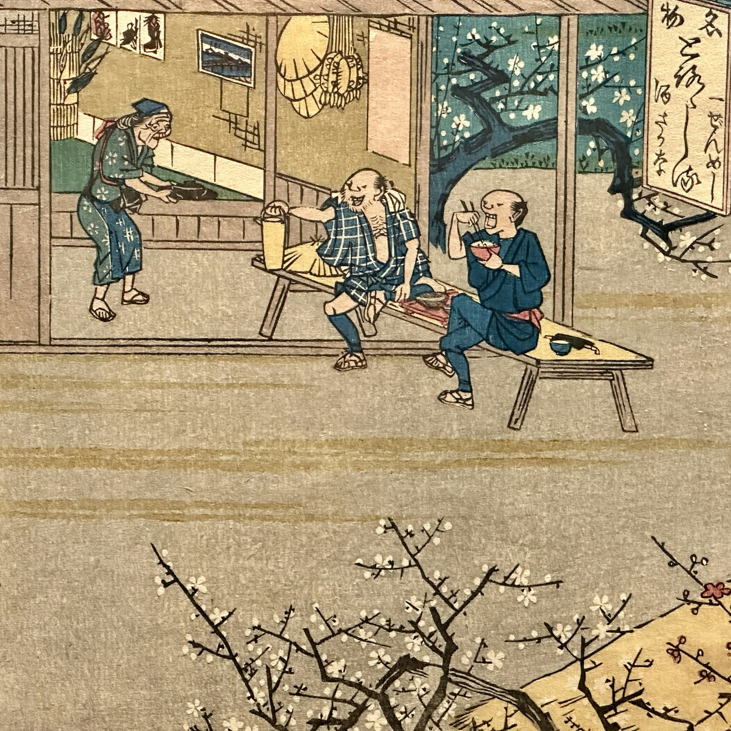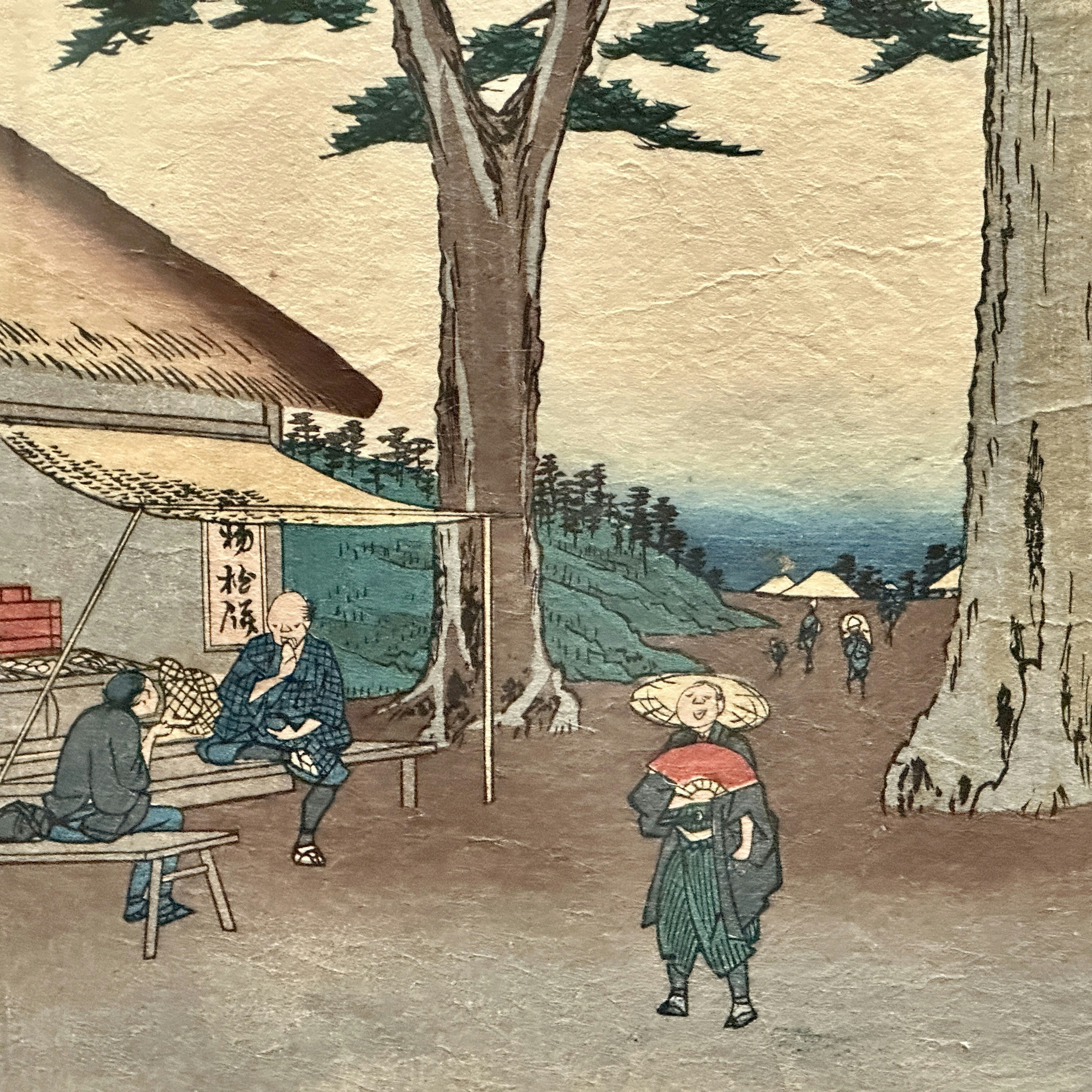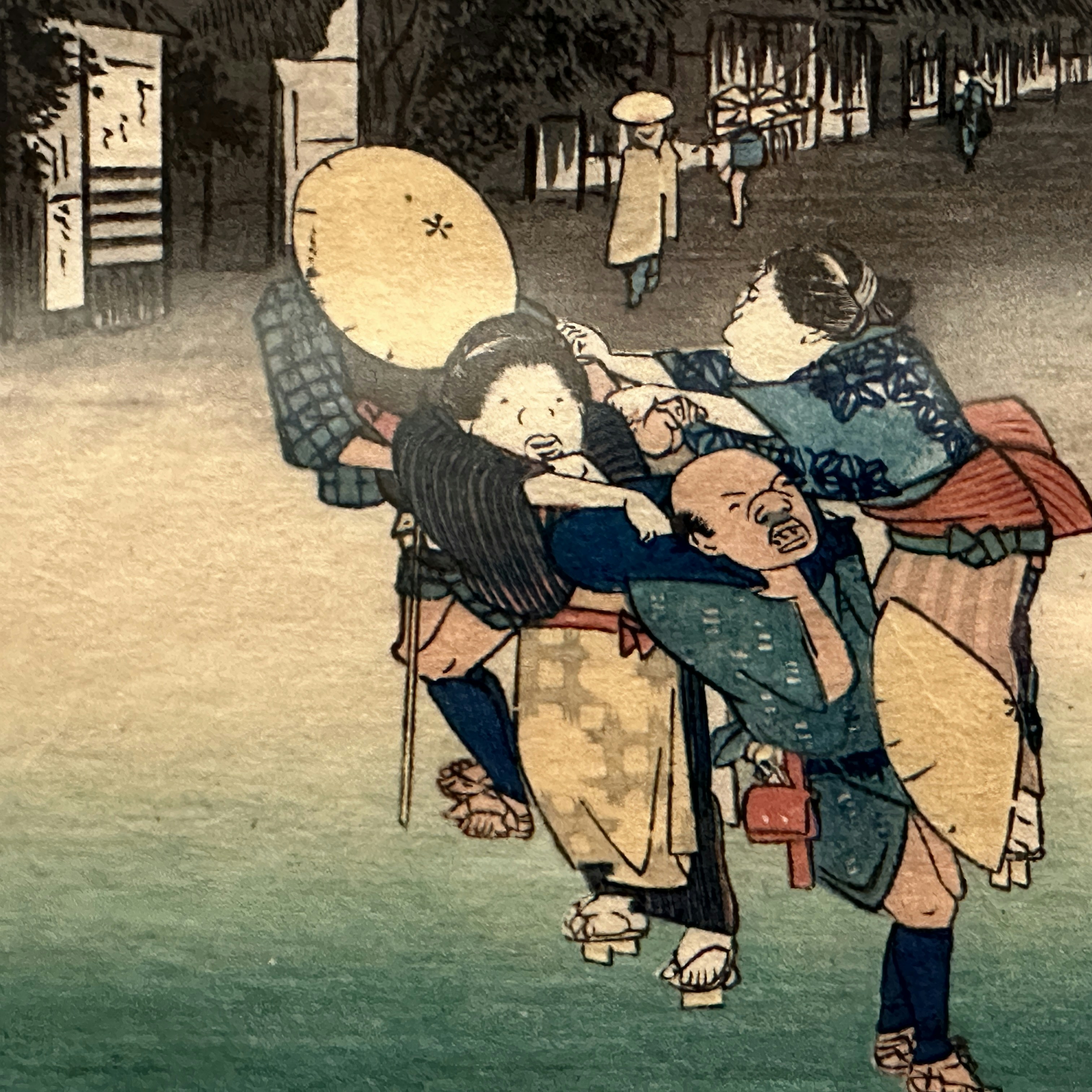 風景画の主題はあくまで「風景」であり、おじさんは脇役(いまでいうモブキャラ)として描かれることが多い。しかしながら、広重のおじさんは一人ひとりが骨格から服装まで細かく丁寧に描き分けられており、そこから身分や職業がわかることはもちろん、人間関係の「ドラマ」を想像することもできる。