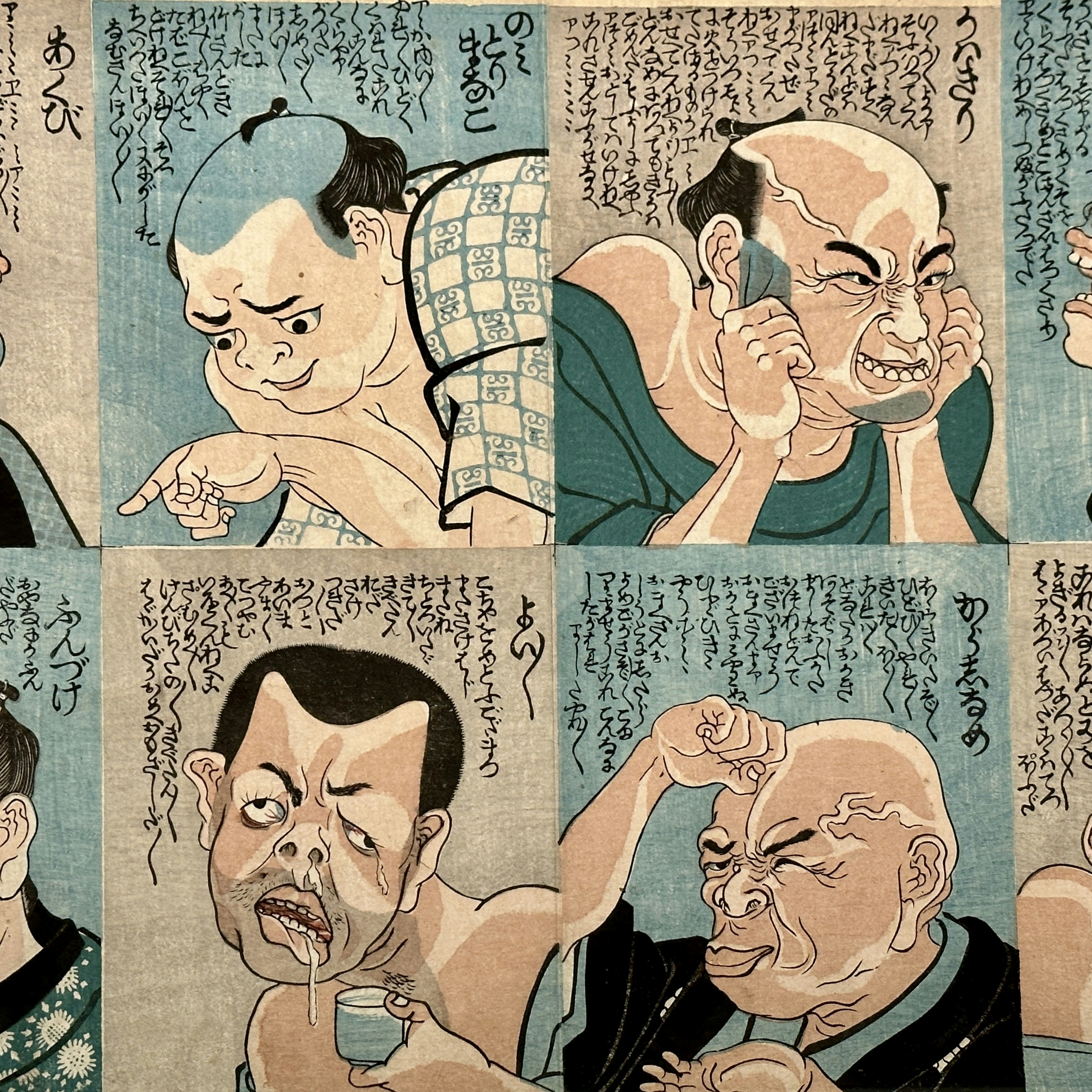 とくに展示冒頭(かつもっともボリュームがある)の第1章は面白い。ここでは、広重作品に登場するにこやかなおじさんたちの表情がわかりやすく、様々な切り口で並ぶ。