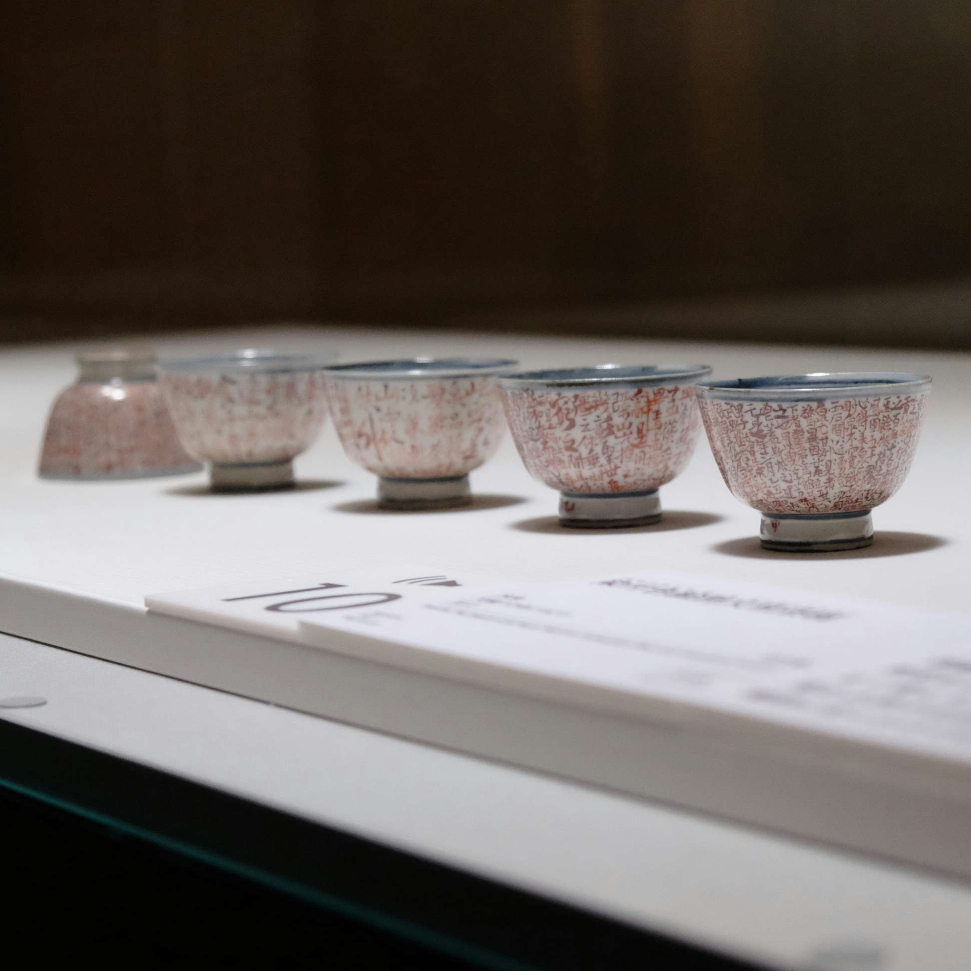 また、木米は器に表す文字にもこだわった。唐代や北宋時代の詩を側面から背面にかけて彫刻した《白泥詩文一文字炉》(1829)や、五口の煎茶碗ひとつひとつの胴部に茶詩や茶に関する文章が赤絵で記された《染付色絵詩文煎茶碗》(1827)など、そのびっしりと敷き詰められた文字は、木米ならではの作風が見て取れる。