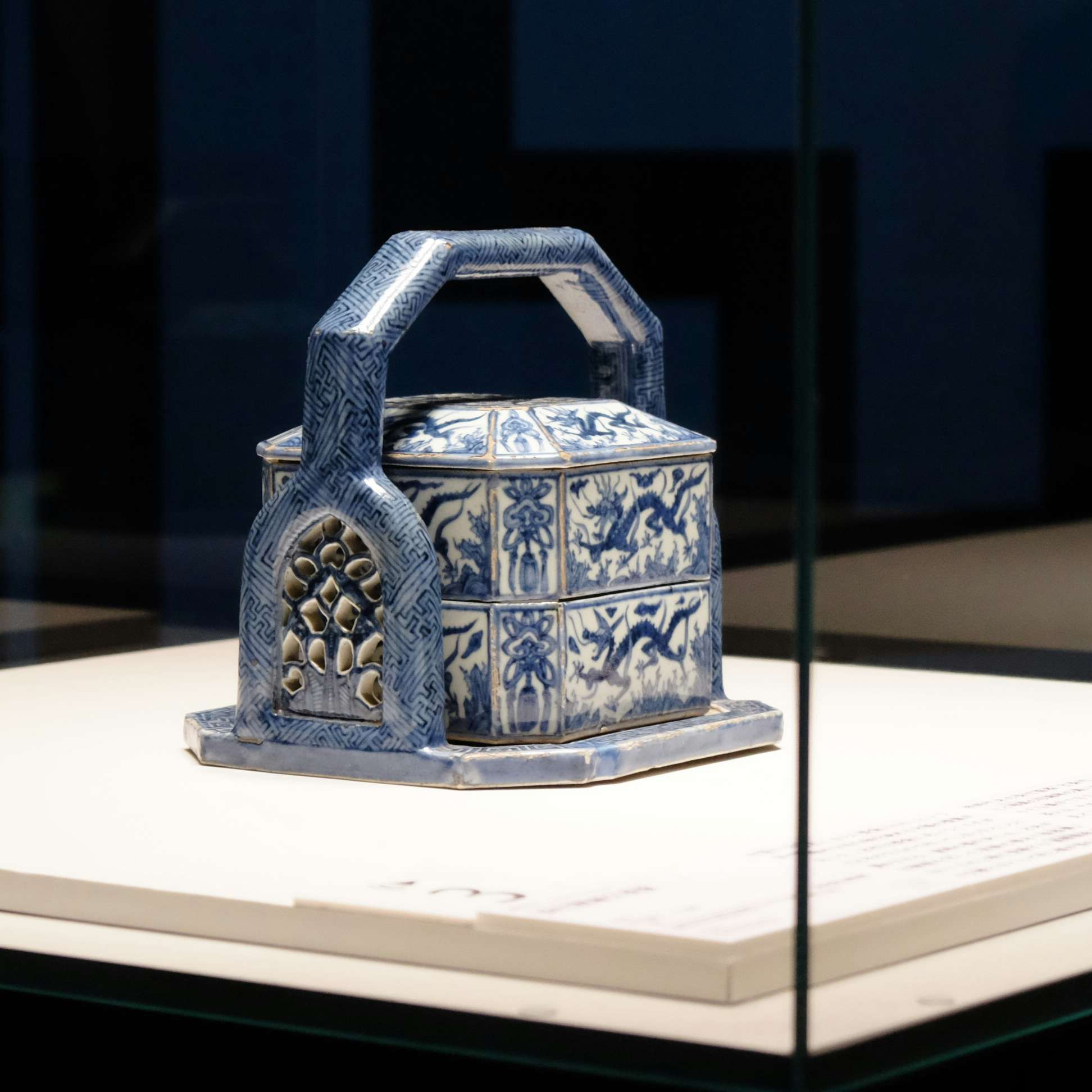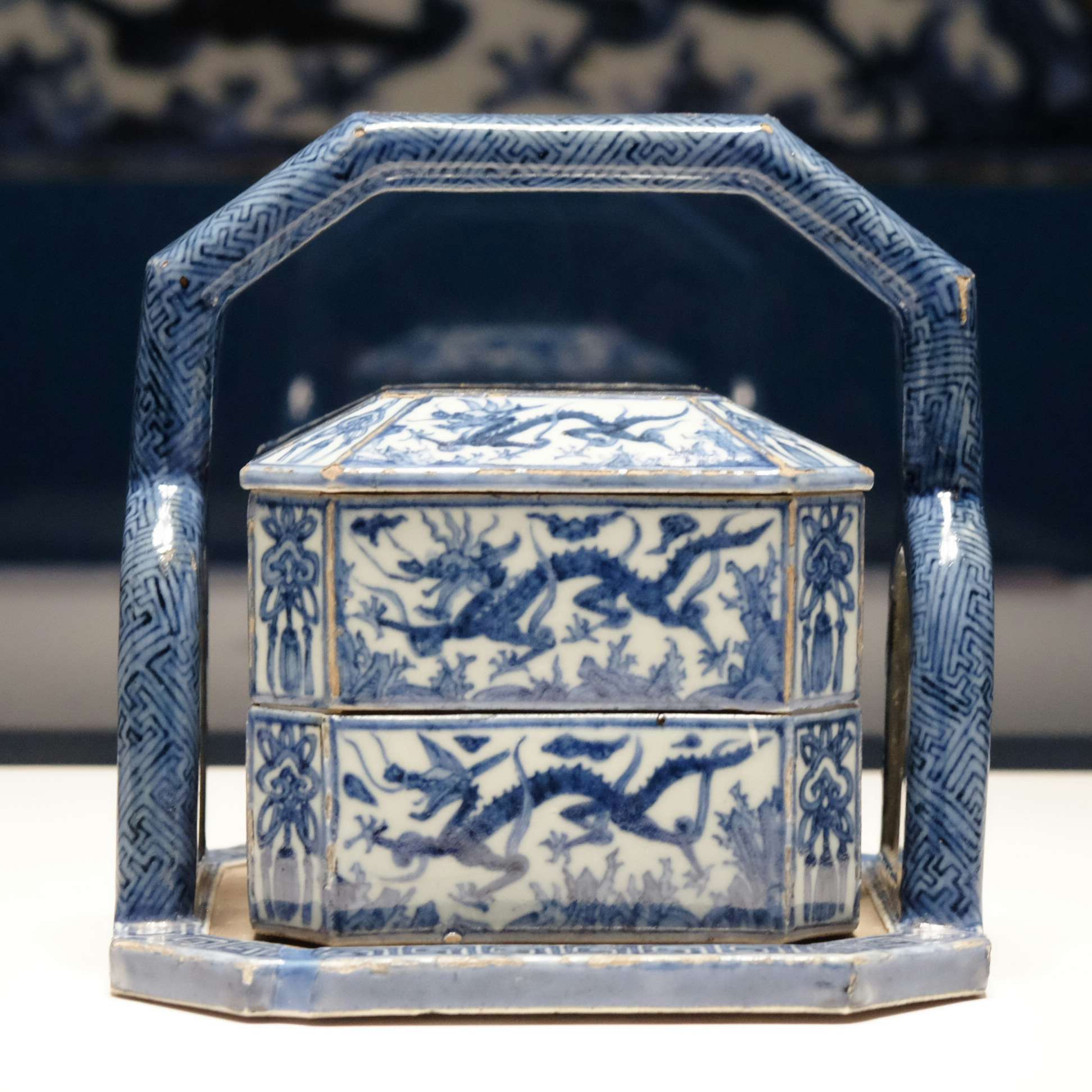 第1章の冒頭に展示されている《染付龍濤文提重》(19世紀)は、まさに文人としての木米の思想を端的に伝えるものといえる。中国に古くからある食べ物や貴重品を収める木製の堤重をやきもので制作。重箱の角や縁の釉の欠けは、明代の古染付に見られる製造行程で出来た傷を、「虫喰い」として愛でる日本の茶人文化に則ってわざと加工したとも言われている。規則的な紗綾形文や雷文も明代末の染付磁器の雰囲気に通じるものがあり、木米が豊富な中国陶磁の知識を動員しながら、大胆かつ洒脱に編集して本品をつくりあげたことがわかる。多重な文脈を踏まえながら新たなおもしろさを陶磁器に織り込んでいく、文人ならではの視線を感じられるだろう。