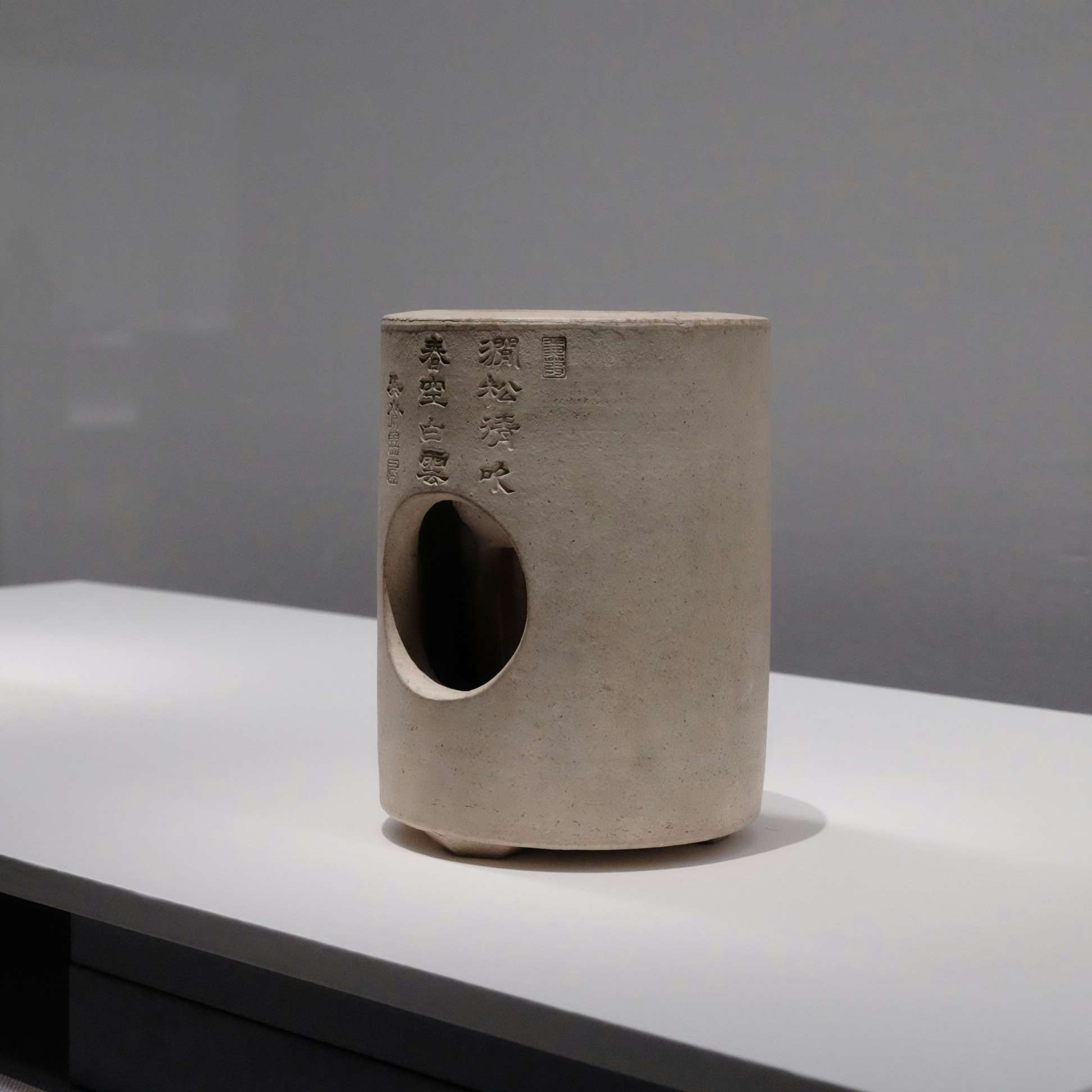 《白泥蘭亭曲水四十三賢図一文字炉》(19世紀)はそのユニークな造形に目を奪われる涼炉だ。窓に見立てた風門には、満面の笑みを浮かべて外の鳥を眺める書聖・王羲之が塑像でつくられており、王羲之が飛び鳥の美しさからその書体を生み出したという逸話がモチーフにされている。また、背面には賢人たちが川岸に座り作詞に興じる様子が彫刻によって表されており、優れた技量で文人たちが理想とする世界が表現されている。