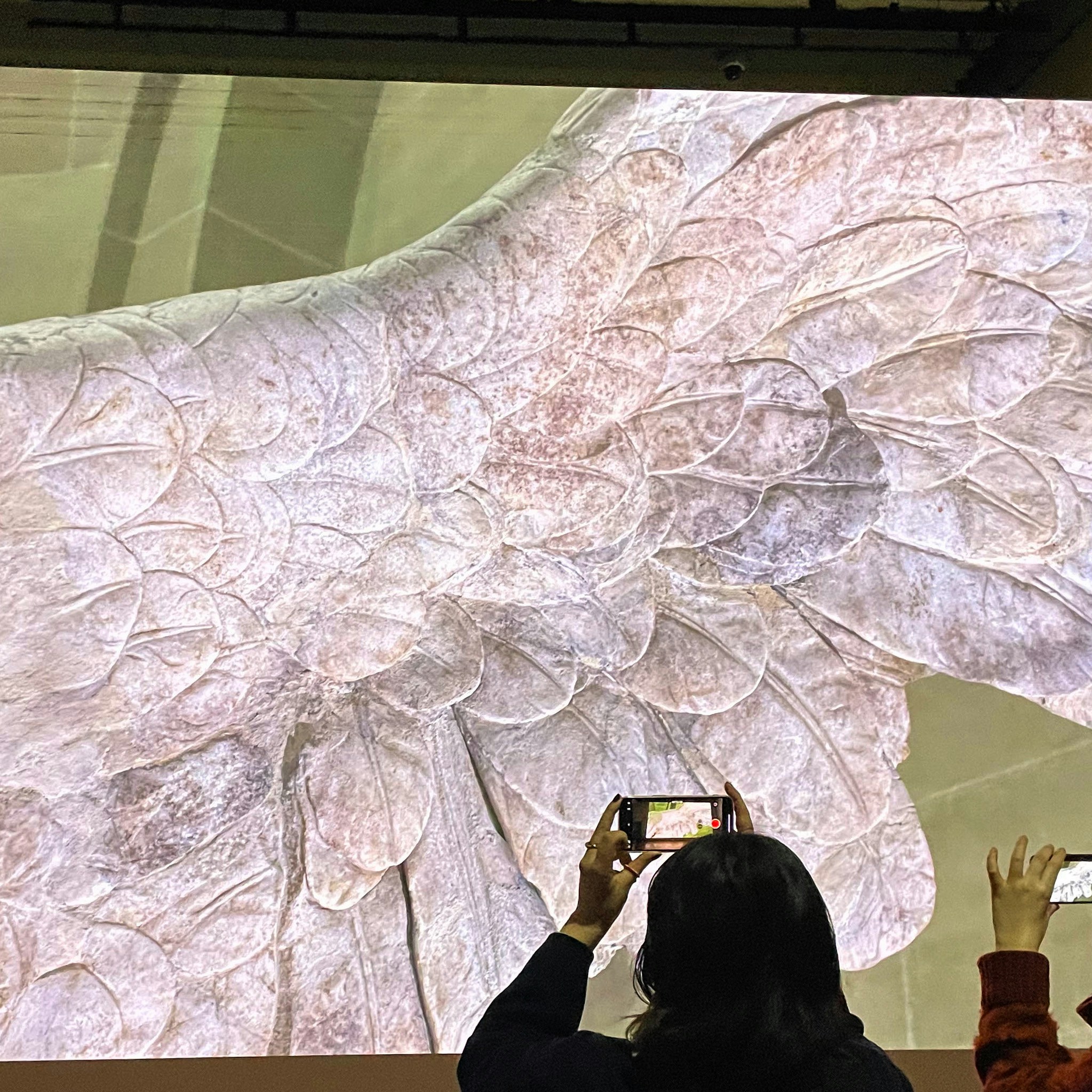 本企画は、ルーヴル美術館の至宝である《ミロのヴィーナス》《サモトラケのニケ》《モナ・リザ》などの名作を、325インチ(横 7200ミリメートル×高さ 4050ミリメートル)LED8Kモニターで投影。現地でもなかなか見ることが難しい彫刻のディティールや絵の具のニュアンス、筆のタッチ、表面に起こるひび割れなどを肉眼で鑑賞できるのがポイントだ。