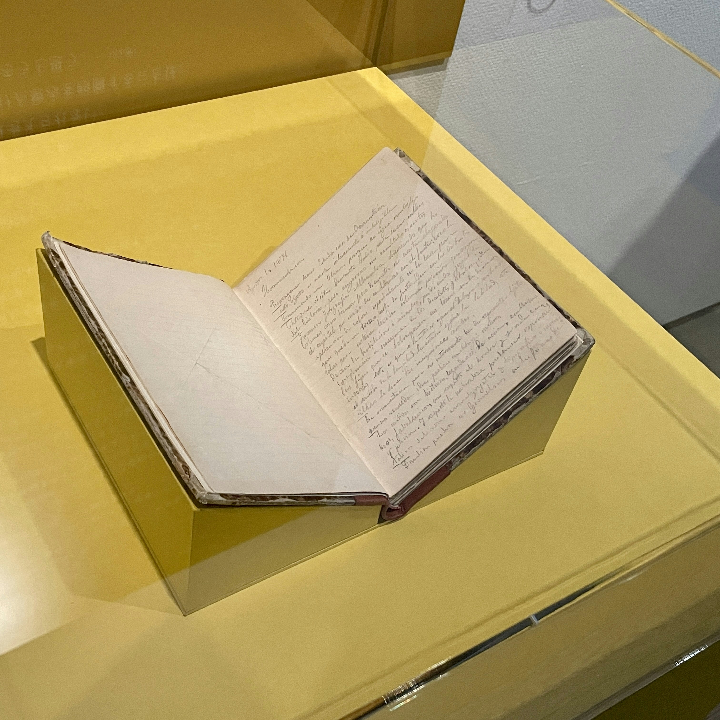 ガウディによるこのノートでは、装飾や建築の色彩、そしてキリスト教聖堂などについて論じられており、若年期のガウディの建築観をうかがい知ることができる貴重な資料だ。いっぽうの《クメーリャ革手袋店ショーケース、パリ万国博覧会のためのスケッチ》(1878)は、バルセロナで有名な革手袋店からショーケースのデザインを依頼され、ガウディが自身の名刺裏に描き留めたデザイン案。このショーケースは、パリ万博でバルセロナの資産家アウゼビ・グエルの目に留まり、その後ガウディのパトロンとなったグエルとの関係を築く機縁にもなった。