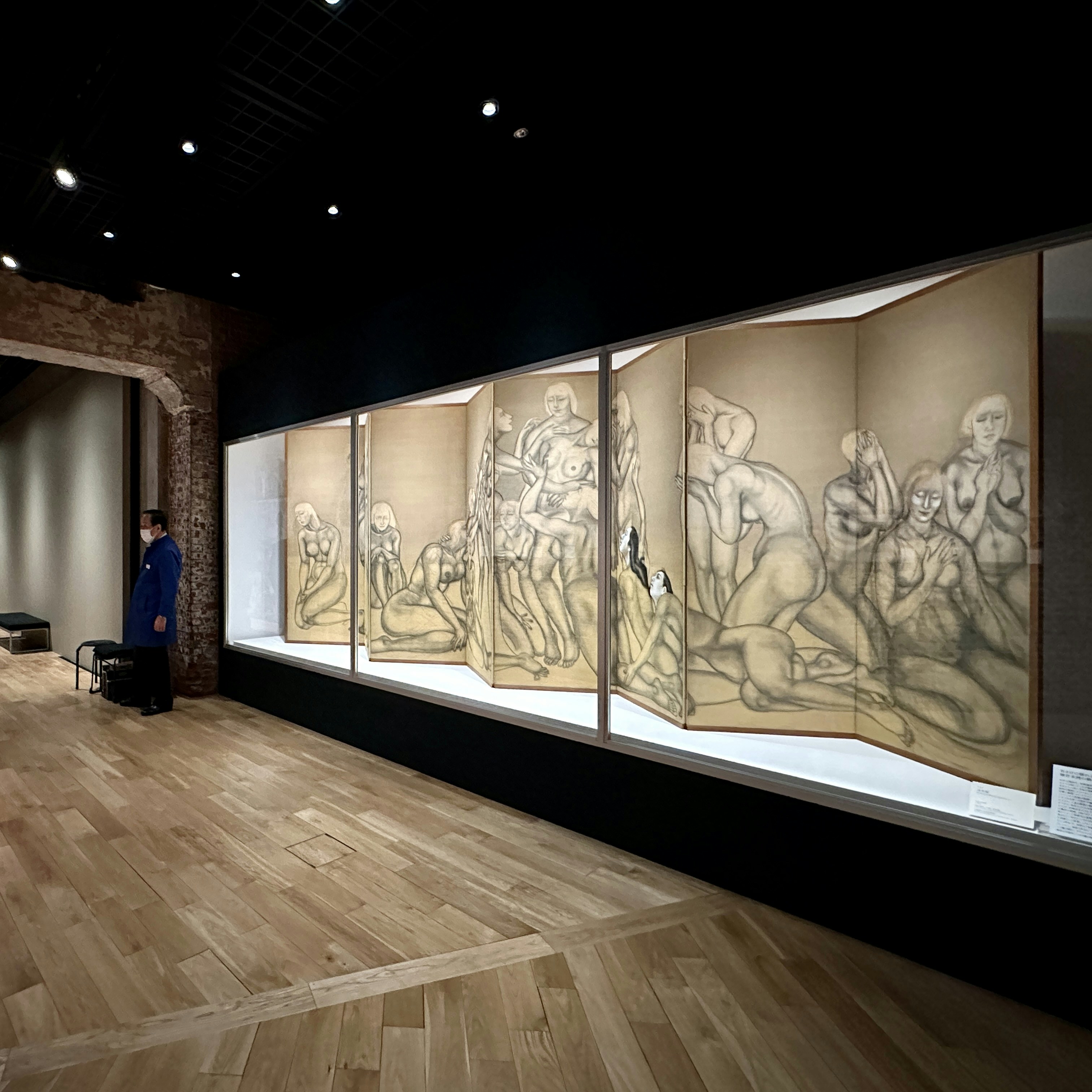 いっぽう横5.7メートル、八曲一隻におよぶ大作《畜生塚》(1915頃)は、その大部分が塗り残されたままの未完の大作。ミケランジェロなどに影響を受けたと思しき肉肉しい人物像からは、「畜生塚」(豊臣秀吉が養子である秀次を自害させ、その幼児や妻、妾など約30人を処刑して三条河原に埋めた史実)から抱くイメージとはやや遠い。なぜ楠音はこれを完成させなかったのか、想像をめぐらせて鑑賞するのもひとつの楽しみだろう。