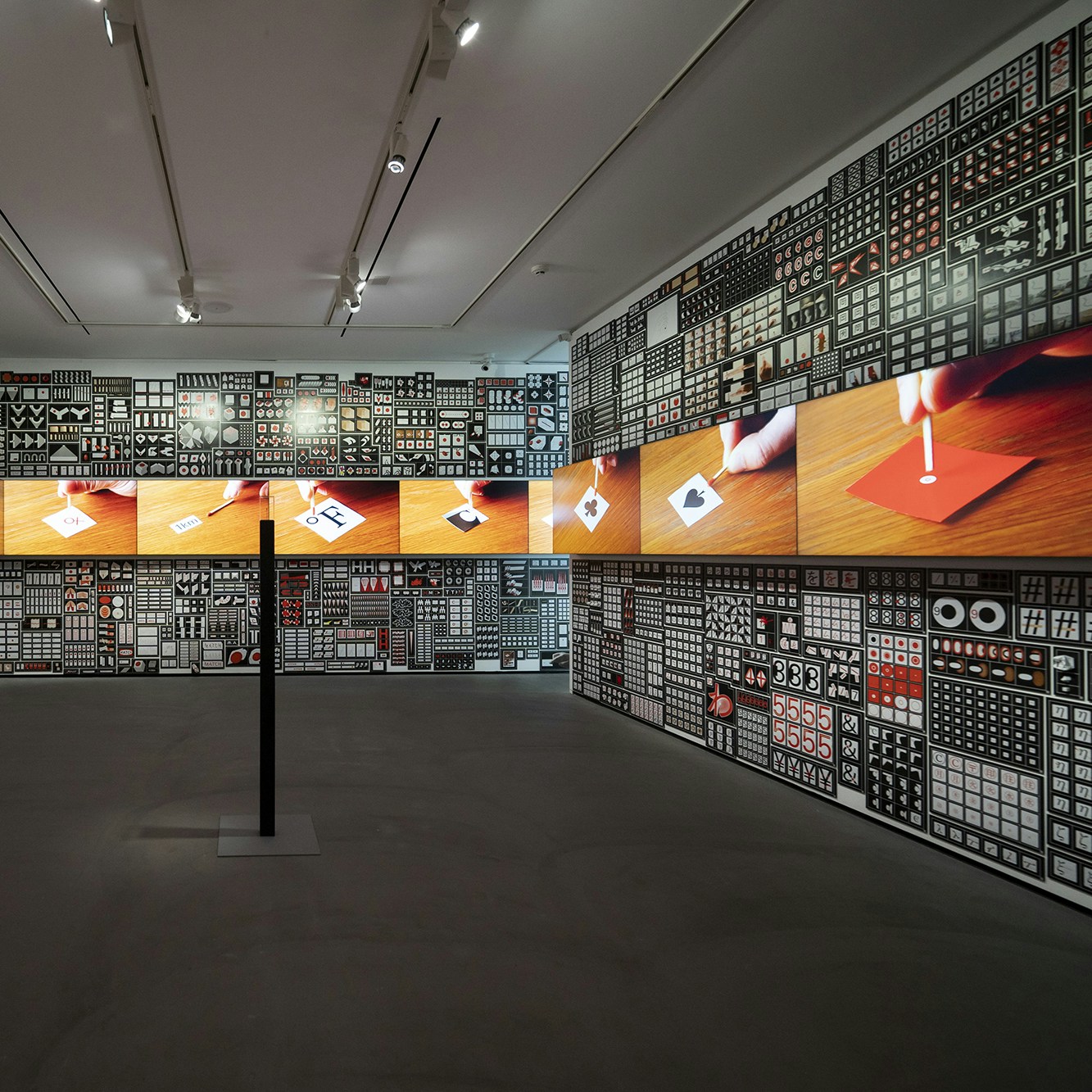先月まで開催されていた個展「STUDY」では、「つくっている最中」にデザインの面白さを見出す岡崎の、「デザインと向き合うスタディの時間」が展示空間へと再現されていた。第1展示室で展開されたテレビ番組「デザインあ」でもおなじみのストップモーションアニメでは、「あ」の一文字と白い紙のみから様々なパターンの動きが生み出されていることがわかるだろう。