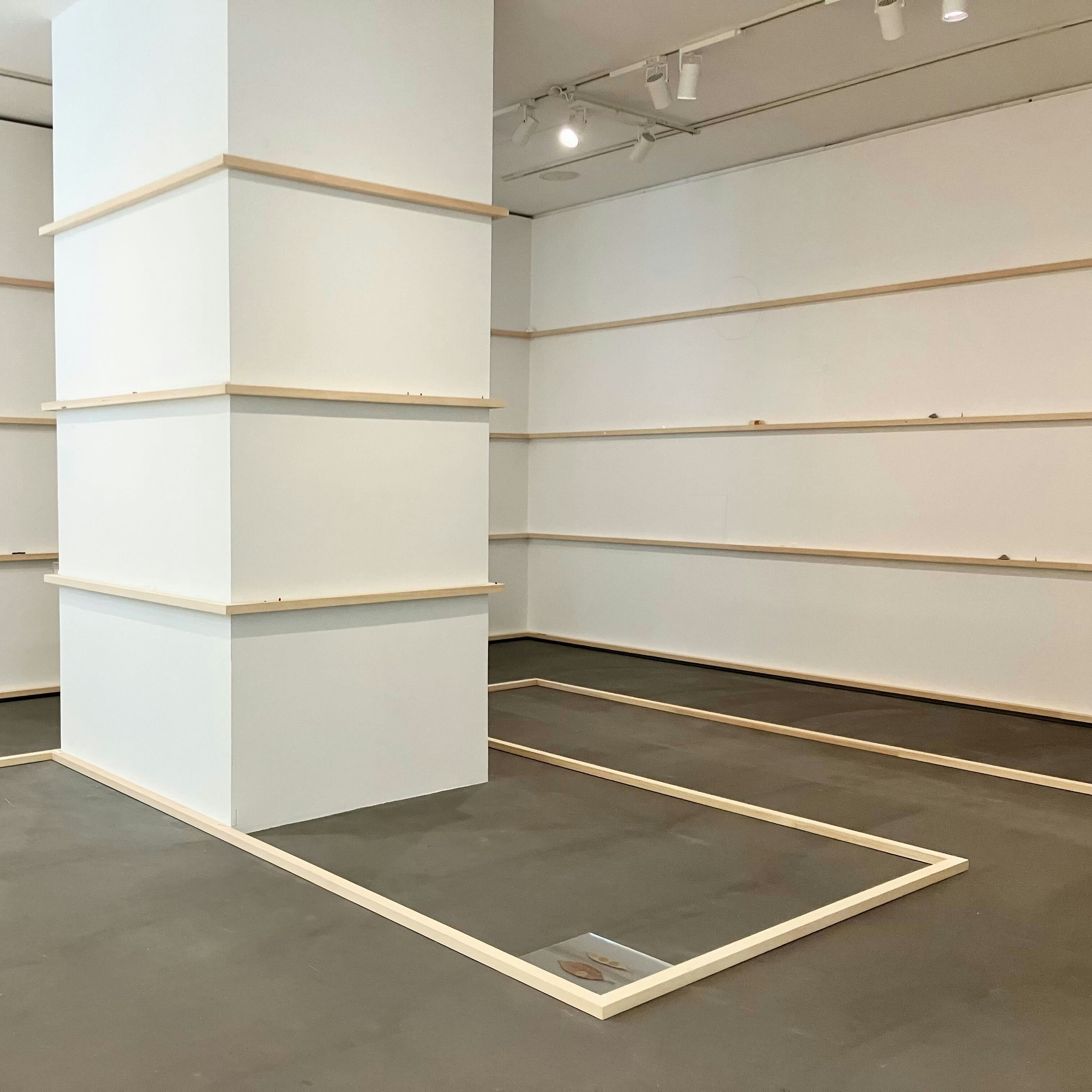 会場に足を踏み入れた人は、この角材のみが壁や床に巡らされているように見える空間に、一瞬戸惑うことだろう。この4段に設置されている垂木が、展示什器となっているのだ。垂木は、展示空間においてはよく裏方で使用される40×30ミリメートルの建築資材。この素材を壁に「留めただけ」で成立している会場そのものから「Just by」を体現しているのだ。