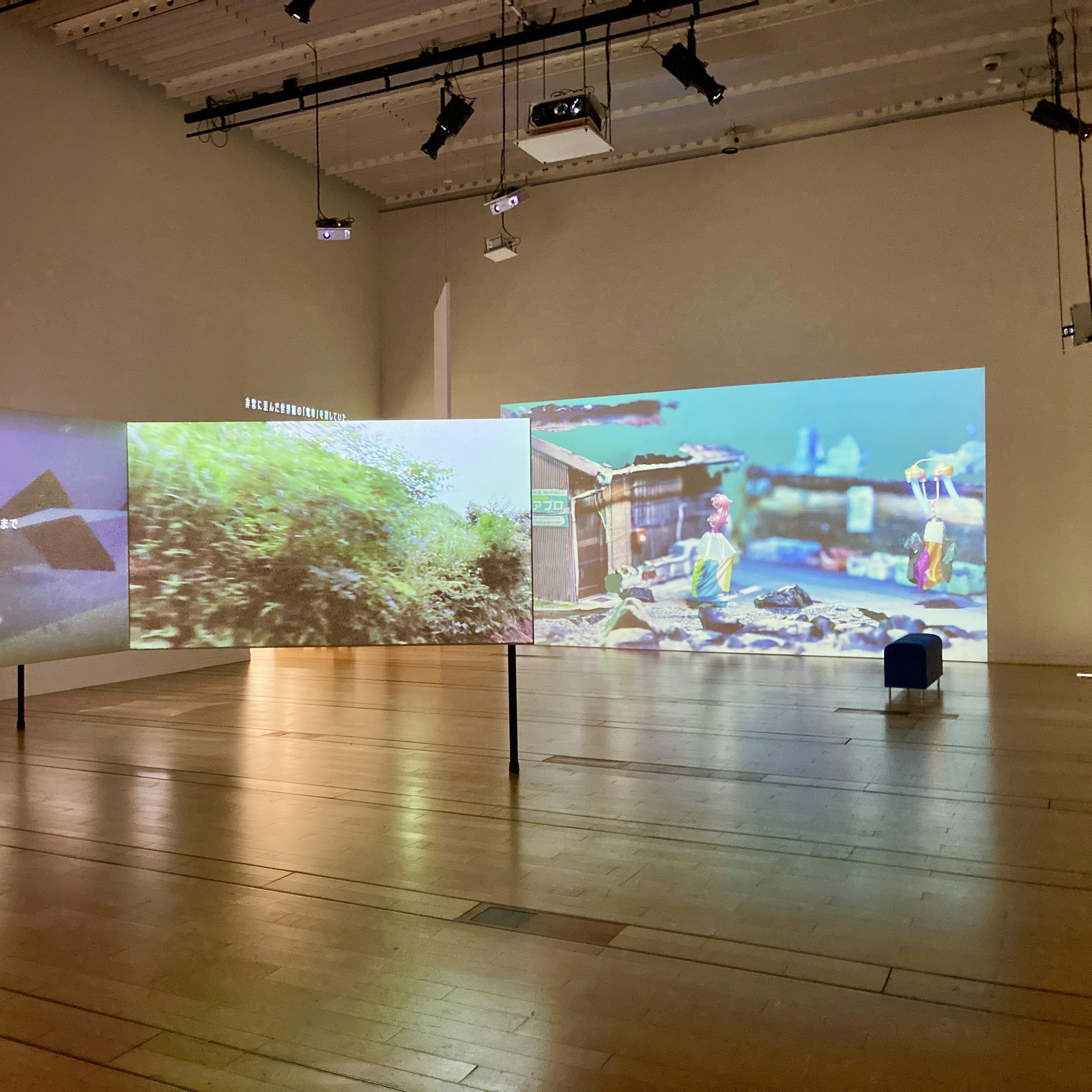 その背後には、放射状に構成されたスクリーンが設置されている。菅野歩美による映像インスタレーション《未踏のツアー》は、対になった2つの画面に3DCGを用いて実在する街を想像してつくった映像と実写映像を流した作品で、そのコントラストがどこかファンタジックかつ非日常的で、ときに奇妙な感覚を鑑賞者に与える。