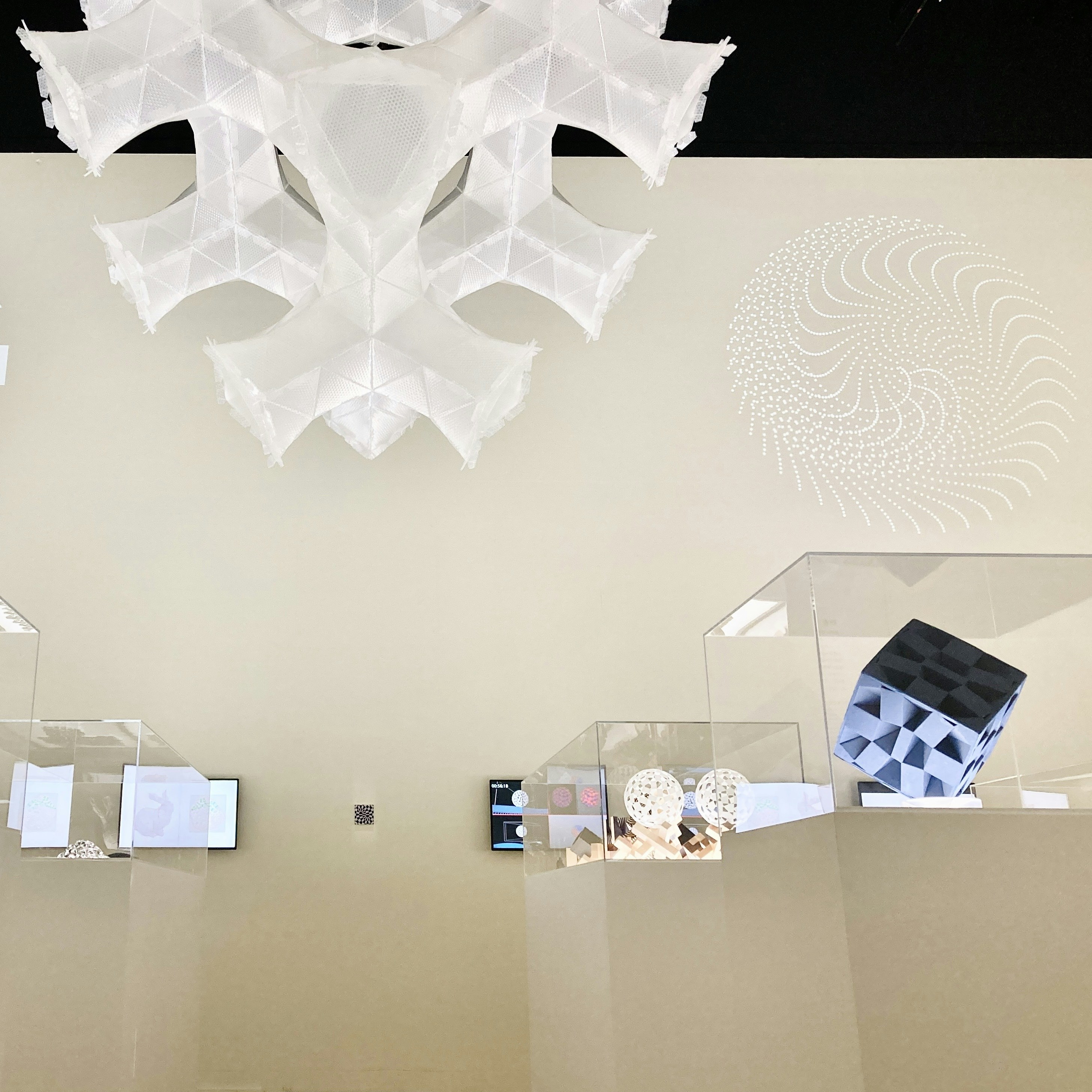 会場を入ってすぐの空間から奥に進むと、東京大学 舘知宏研究室 × 野老朝雄 × [ ]「つながるかたち展 2.5」にたどり着く。白く輝く展示室は、有機的かつ無機的な空気がある。掲示された説明とともに作品を眺めるにつれて、単純なかたちが一定のルールでつながって全体を構成する「個と群」の原理を体感できることだろう。