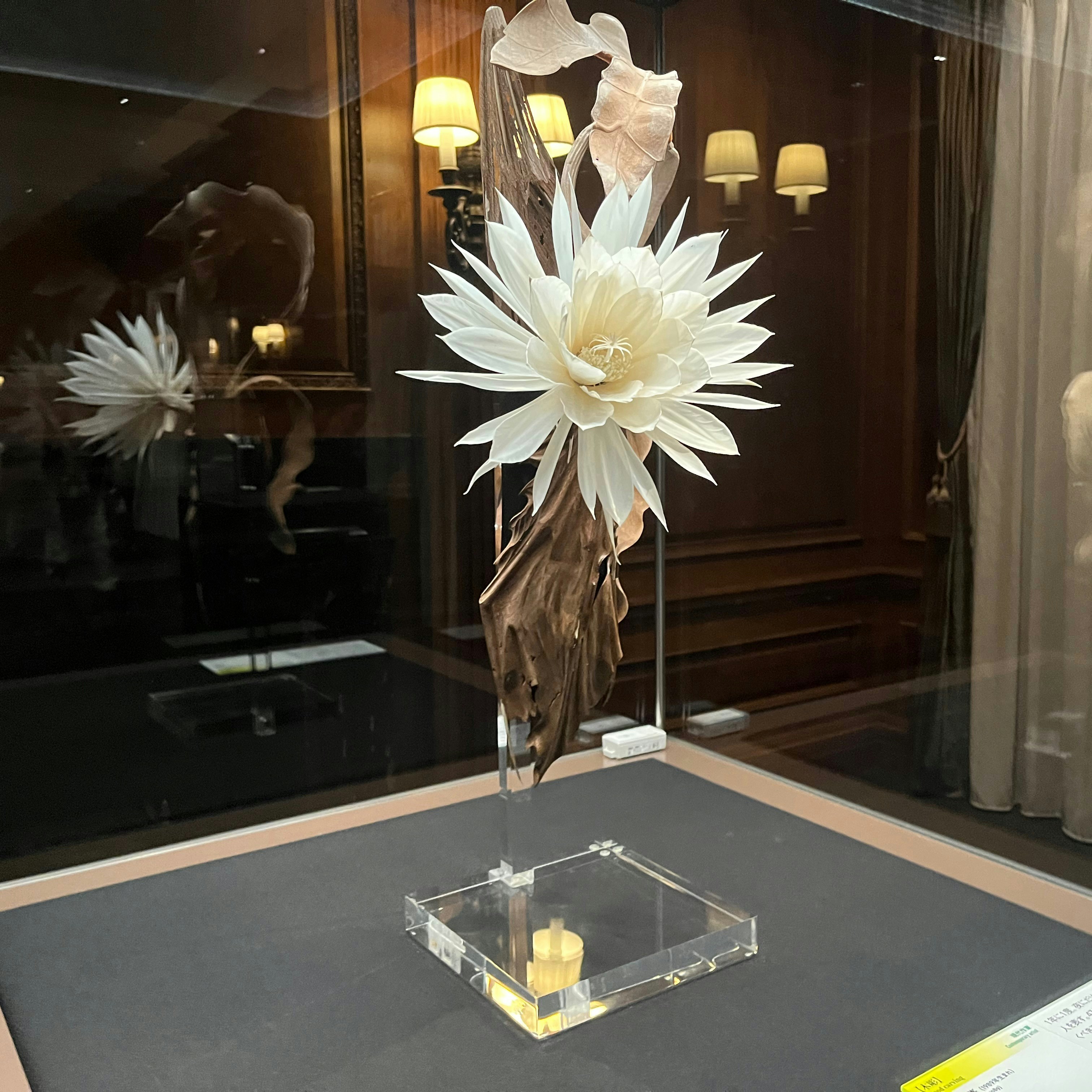 金属ではなく木彫による自在置物で生命力を感じさせる人体や昆虫、草花をつくりあげる大竹亮峯。花器に水を注ぐとゆっくりと花弁が開くという仕掛けを持つ《月光》(2020)は、動かずとも圧巻の迫力を感じさせてくれる。