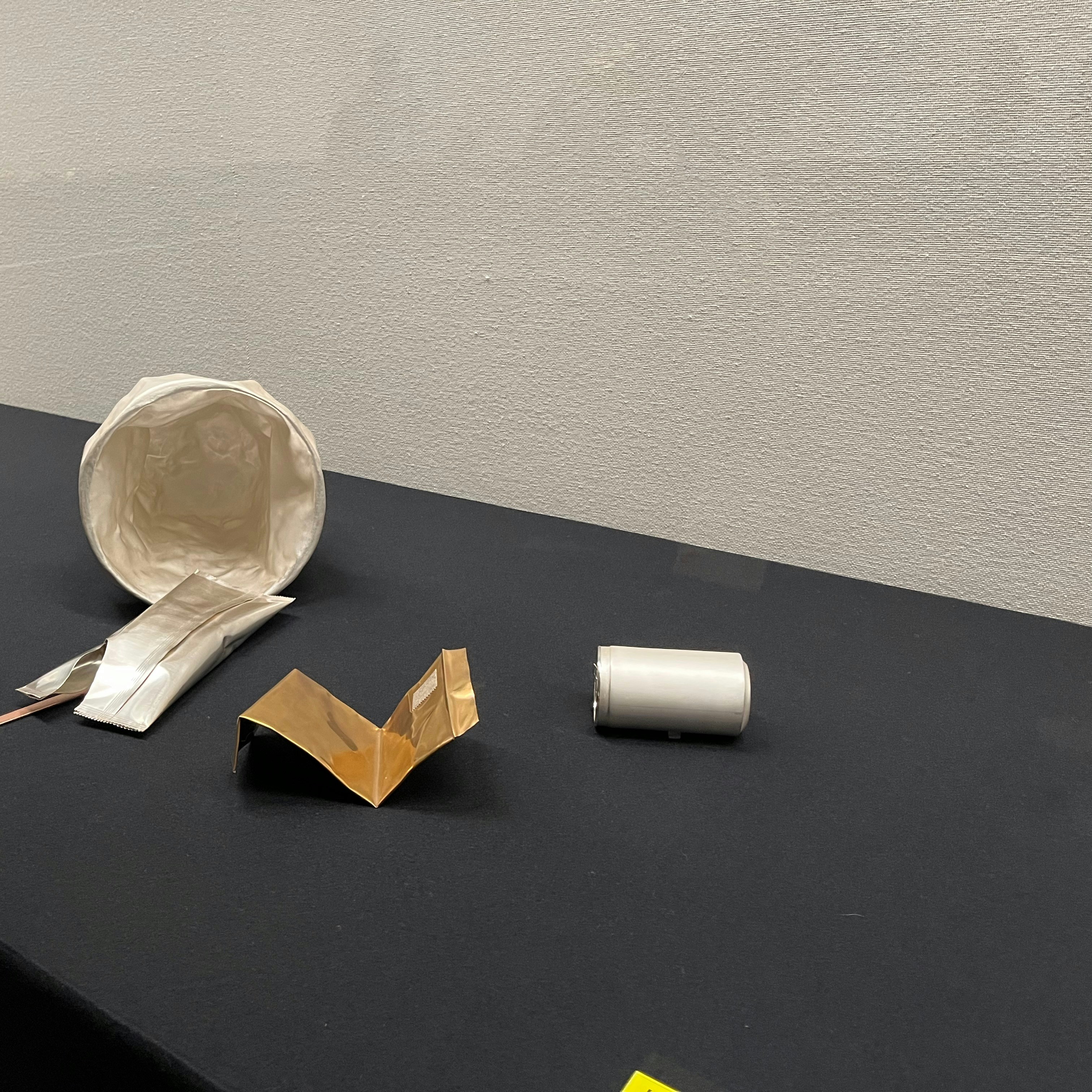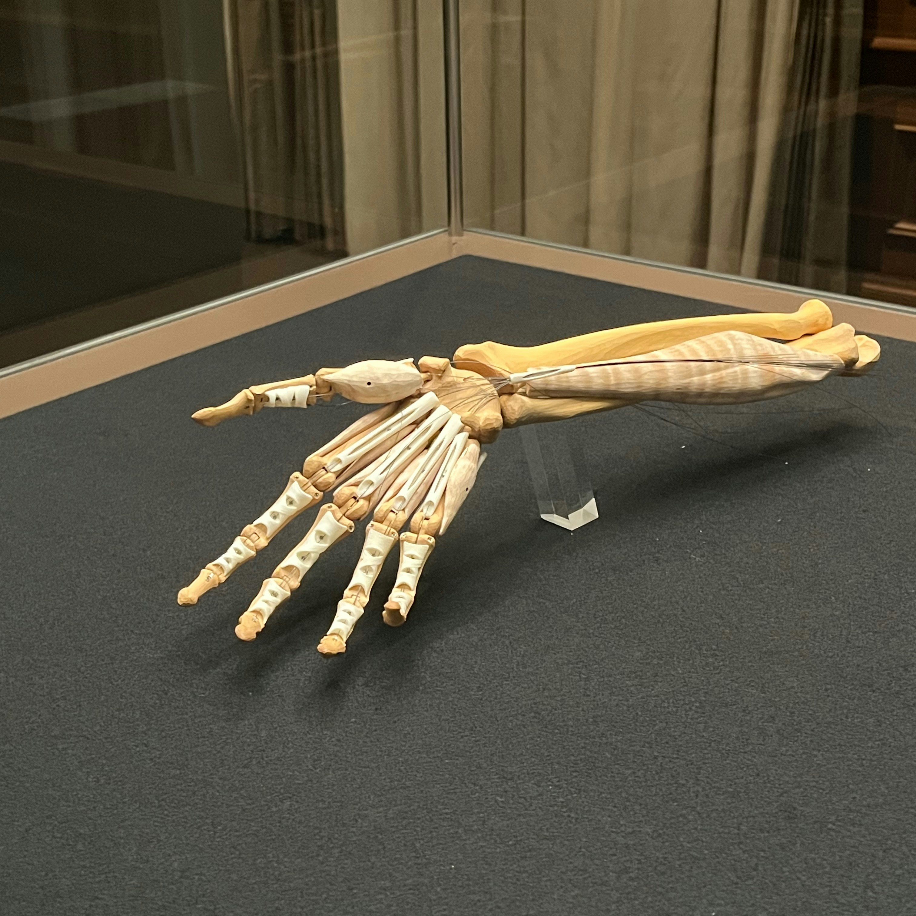 エントランスに展示されている彫金のカラスは、金工作家の本郷真也による《Visible 01 境界》(2021)だ。彫金による羽毛の重なりの表現に圧倒されるが、表面のみならず通常は見ることができない内部の骨格までがつくりこまれているというから驚きだ。会場ではCTスキャンによる映像が上映されており、つくりこまれた内部の様相を知ることができる。胃袋の中にはカラスが飲み込んだキャンディの袋まで再現されており、人間社会と動物の関わりをについての問いも内包されているという。
