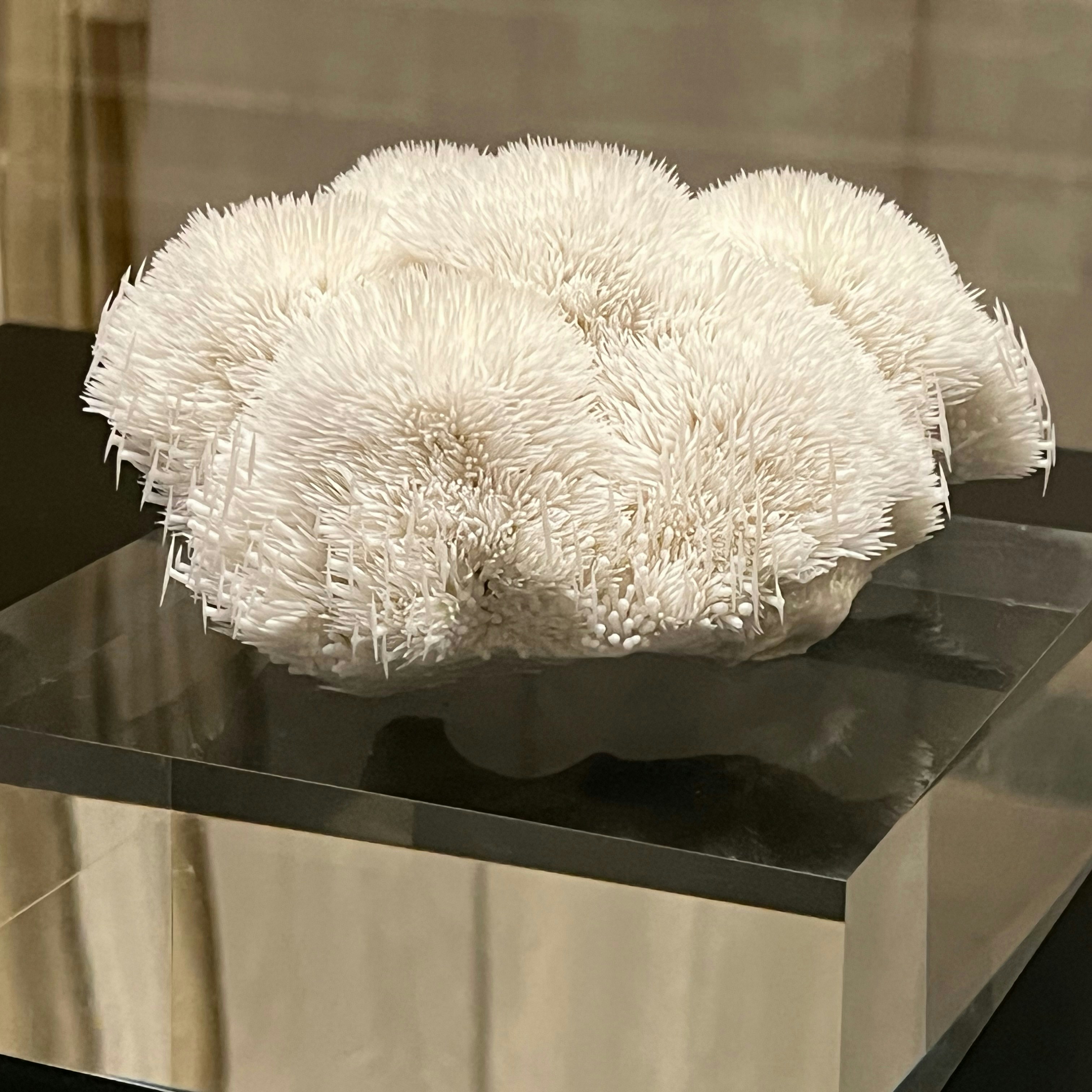 本展出品者のなかでも最年少となる福田亨は1994年生まれ。福田は着色をしないことにこだわった木彫作家で、例えば吸水するアゲハチョウをモチーフとした《吸水》(2022)の、鮮やかな色調の羽根も素材の異なる木材を組み合わせて表現されており、水滴さえも磨き込んだ木でつくられているというから驚きだ。