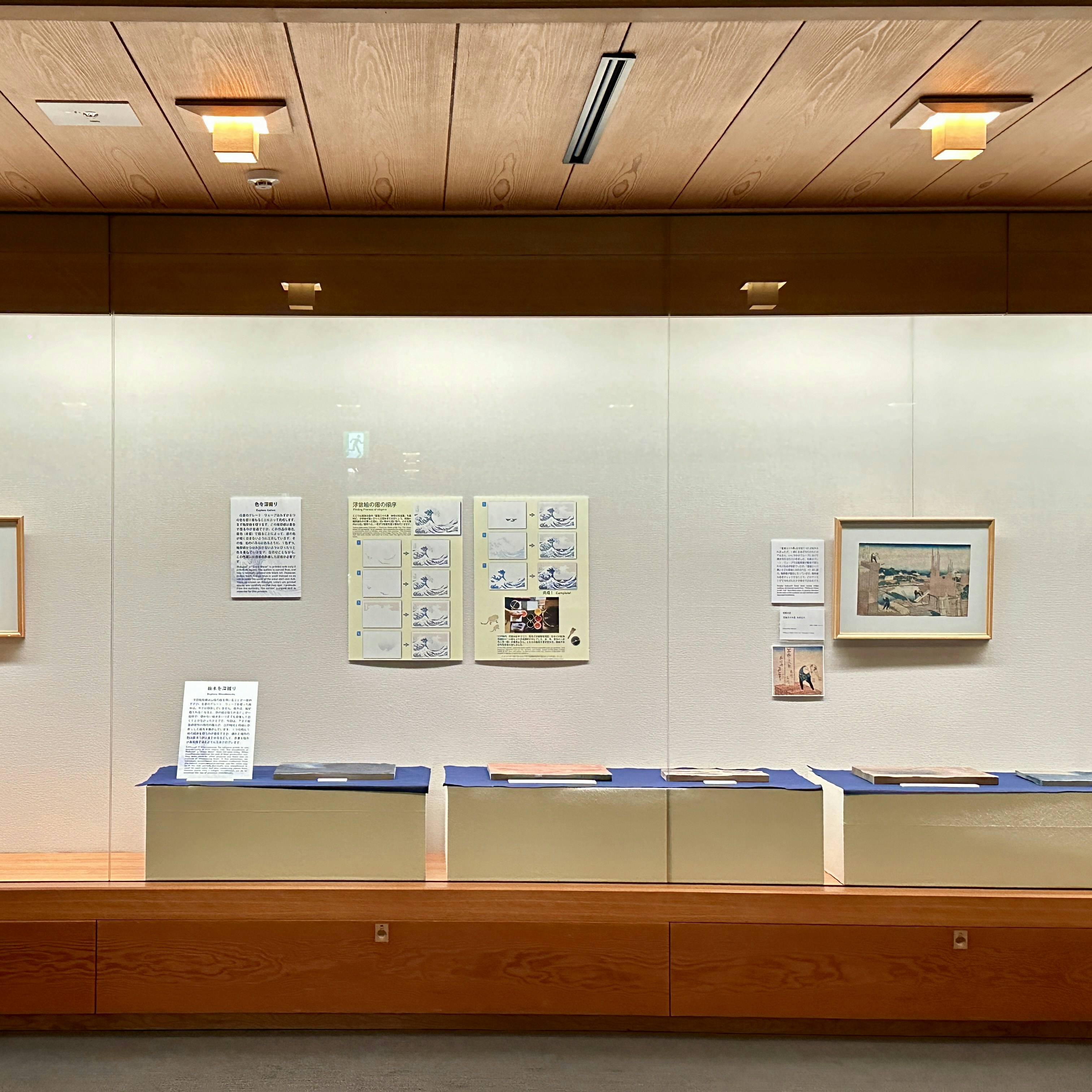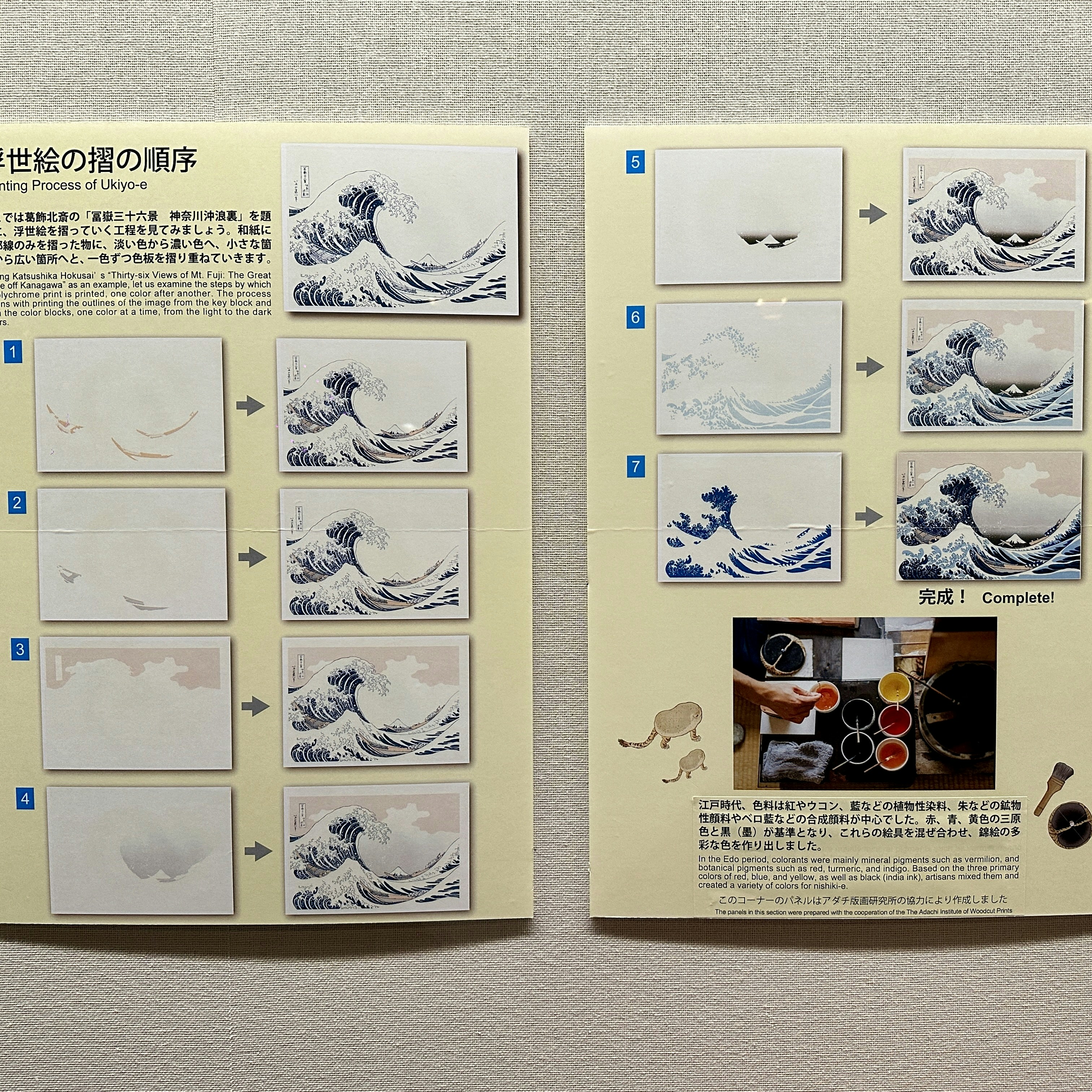 《冨嶽三十六景 神奈川沖浪裏》は8つの色を摺り重ねることで完成するが、現在その版木は残っていない。ここでは、アダチ版画研究所の現代の職人が手彫りした版木を展示することで、その制作過程がより深く理解できるようになっている。浮世絵では1つの色に1枚の版木を使うのが基本だが、同作では離れた色は1枚の板木にまとめるなと、最低限の版木で済むような工夫がなされているという。