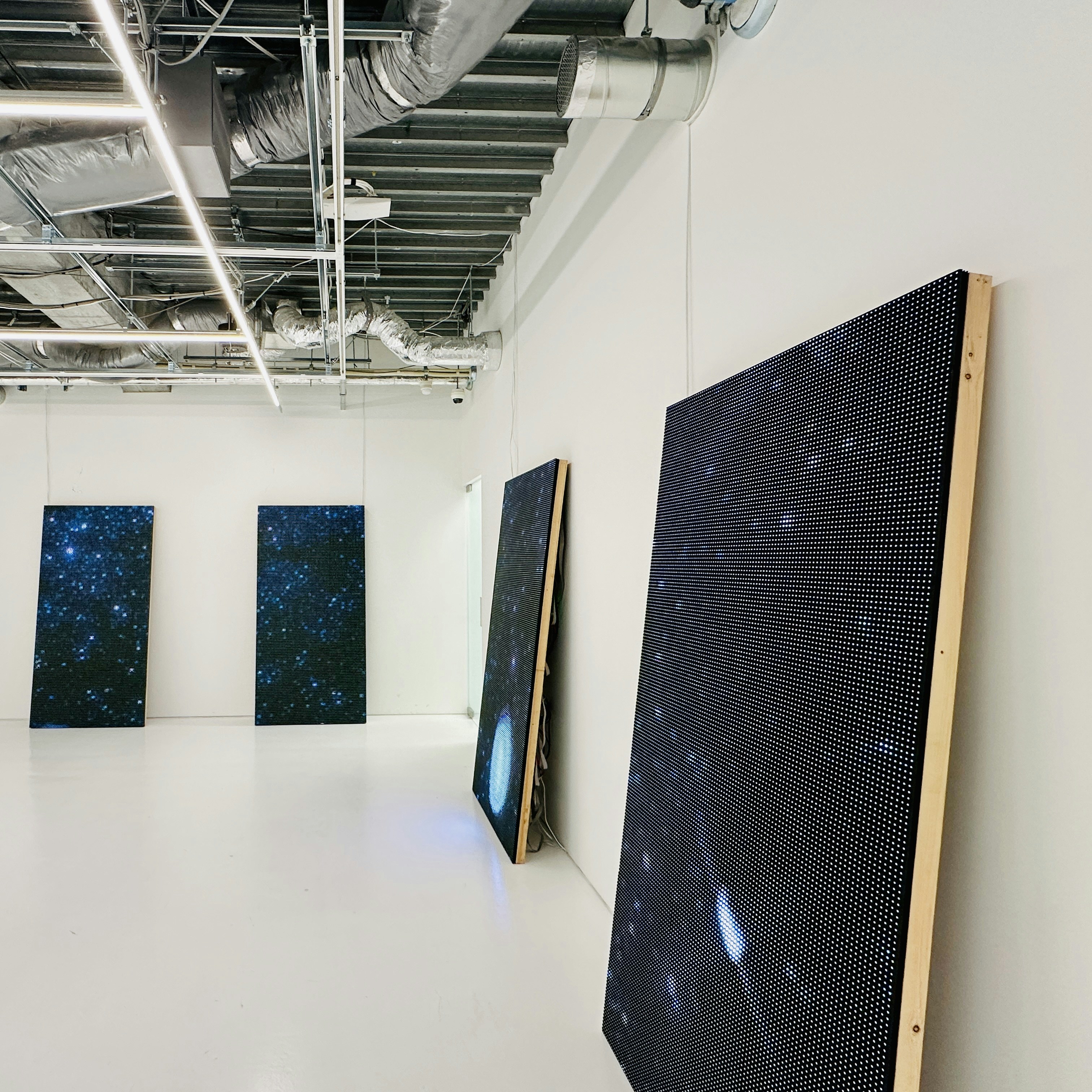 初回の展示作品は、立石従寛・松田将英・保良雄による共作《Gravitation》。谷川俊太郎の詩集『二十億光年の孤独』の一節からインスピレーションを得たというこの作品。落下して割れたカップ&ソーサーの破片が仮想空間でふたたび出会う物語が、複数台のLEDモニターに投影された映像で展開するとともに、割れた陶器そのものも展示されている。