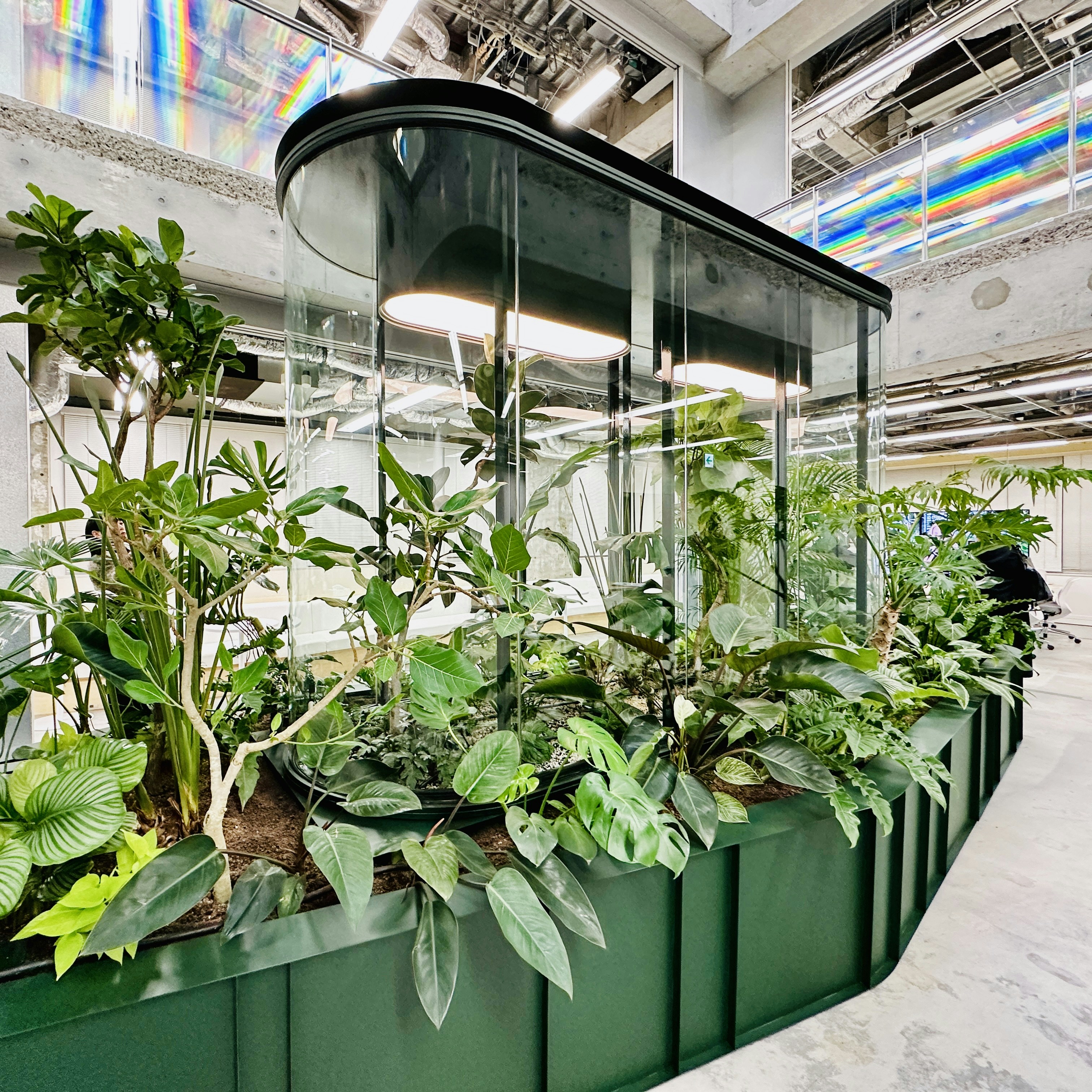 なおこの新社屋には、5階の執務フロア(非公開)に室内の空気を浄化することを目的とした植物によるろ過システム「Fabbrica dell'Aria®︎(ファブリカ デラリア)」も設置。フィレンツェ大学のステファノ・マンクーゾ教授が率いる国際植物神経生物学研究所の実験結果をシンクタンク「PNAT(ピナット)」が実用化したもので、長谷川はこのろ過装置もひとつのアートととらえ、新社屋の肝として取り入れたという。