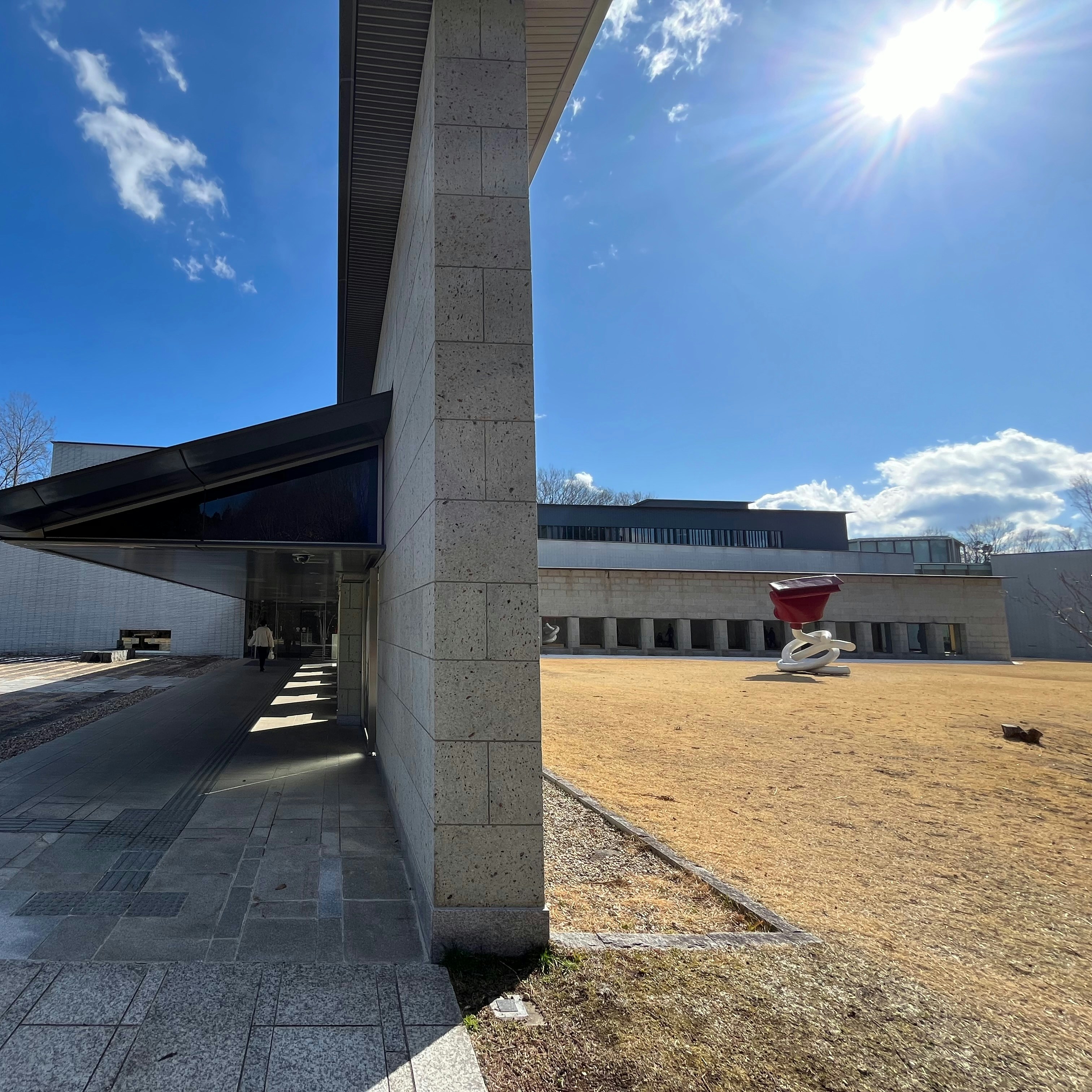 宇都宮美術館は岡田新一による設計。大谷石をふんだんに使いつつ、外庭と一体化するような大型のガラスが特徴的な館だ。ガラス張りの廊下を展示室に向かうところから、本展は始まる。