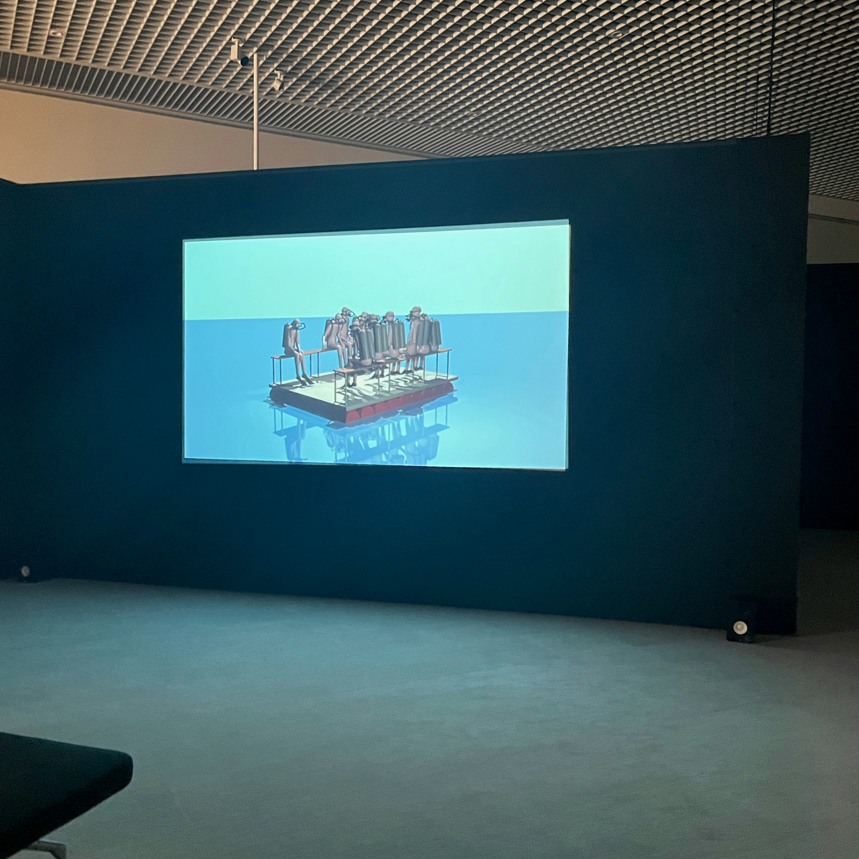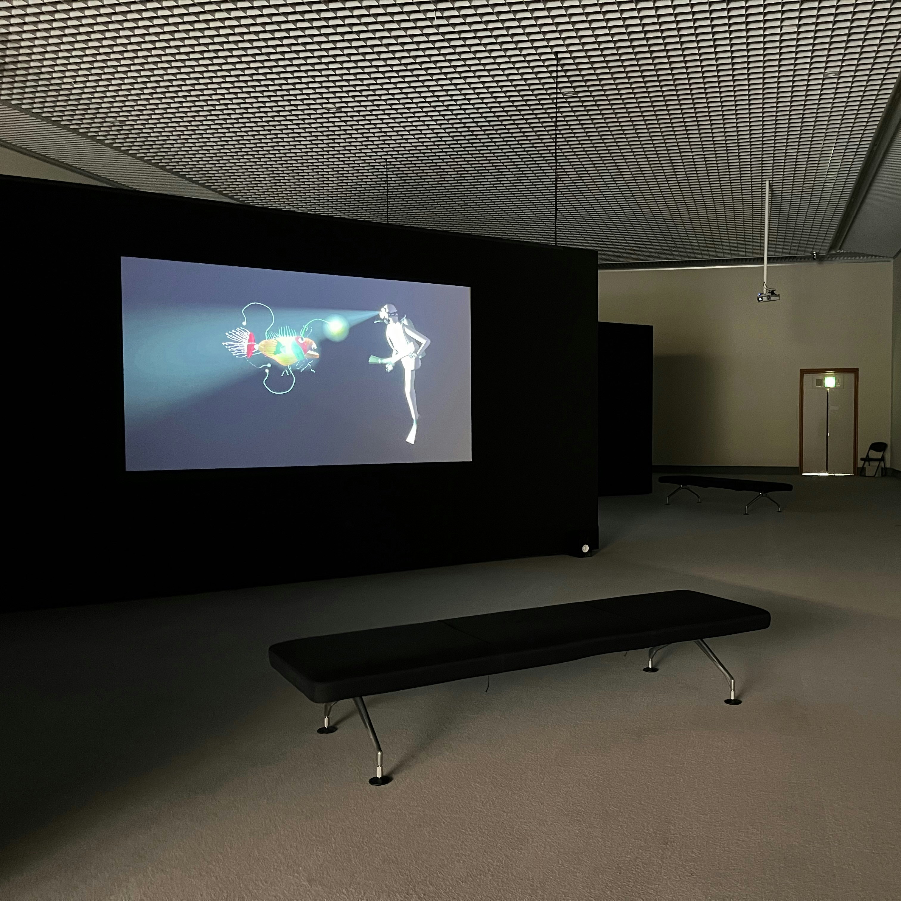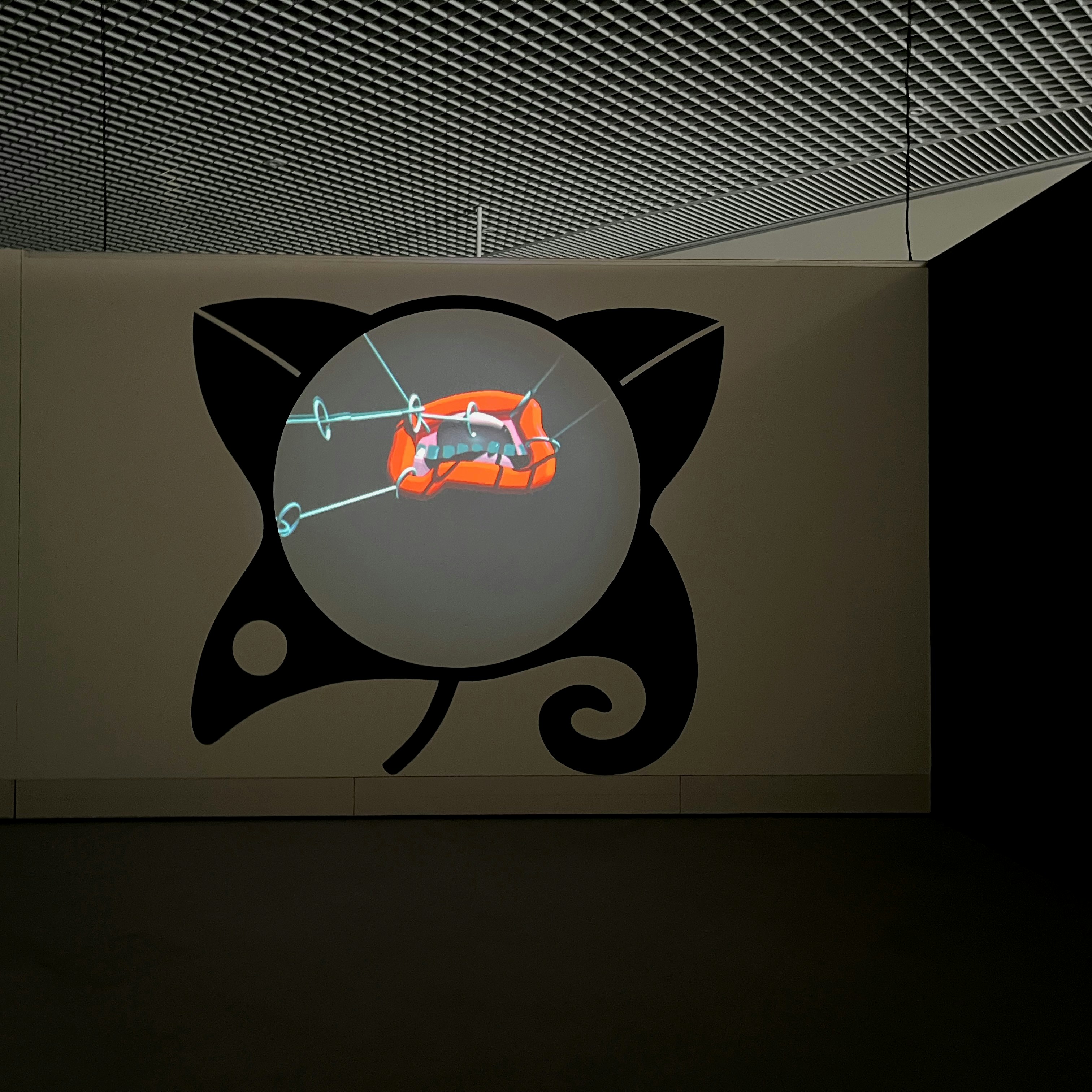 さらに、この《筏》の周囲には、戦争を想起させる屏風絵《世界は美しく、こんなにも多様だ。本当なら皆、愛し合ってもおかしくないはずなのに。》(2024)や、3DCGモデルによる身体イメージのアニメーション作品を展示。加えて、アニメーション作品を投影するプロジェクターは《筏》の内部に組み込まれているなど、与えられた空間で全方向からの視聴に耐えるよう展示を成立させる、作家の手腕が光る。