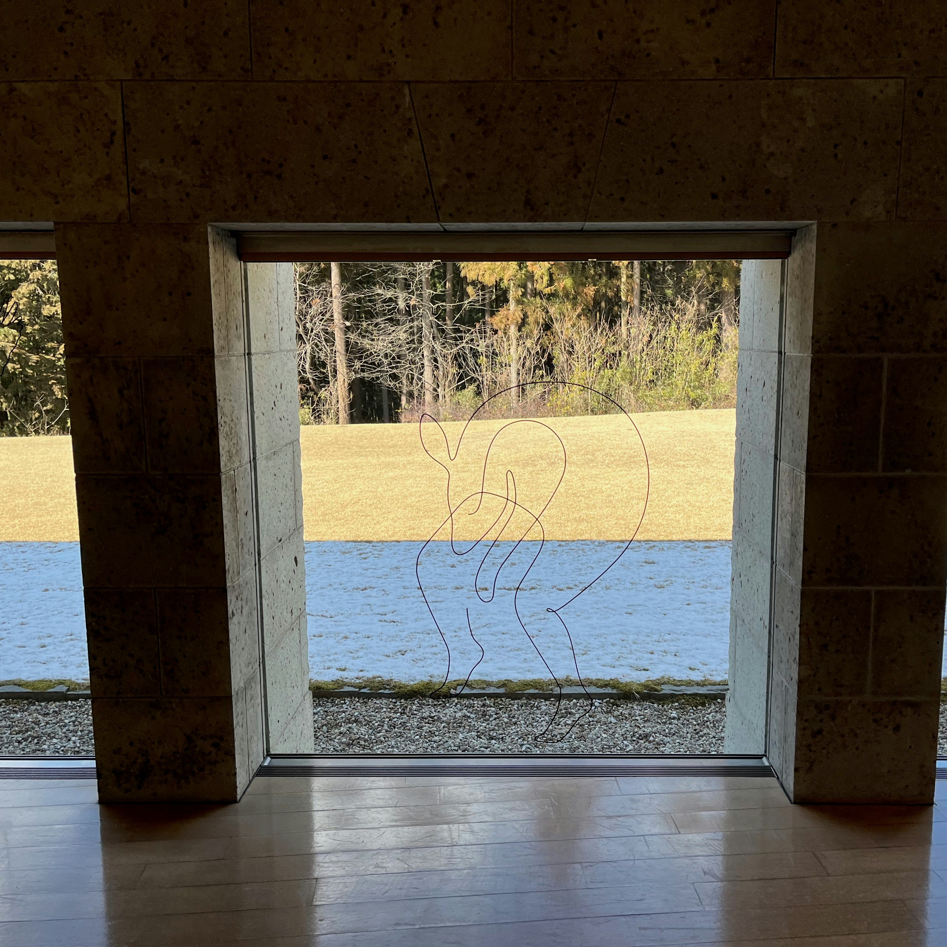 中庭のクレス・オルデンバーグの彫刻《中身に支えられたチューブ》(2024)を望むガラス窓のある廊下には、コンピューターによるネッツハマーの線描画《ガラス面上の素描群》(2024)が並べられている。やわらかなフォルムと、ときには顔のようにも見える豊かな線のドローイングは、外光を浴びて影と交わりながら様々な表情を見せる。ネッツハマーが極めてミニマルに見える線を用いながらも、個性豊かな表現を実現してきたことがよくわかるだろう。