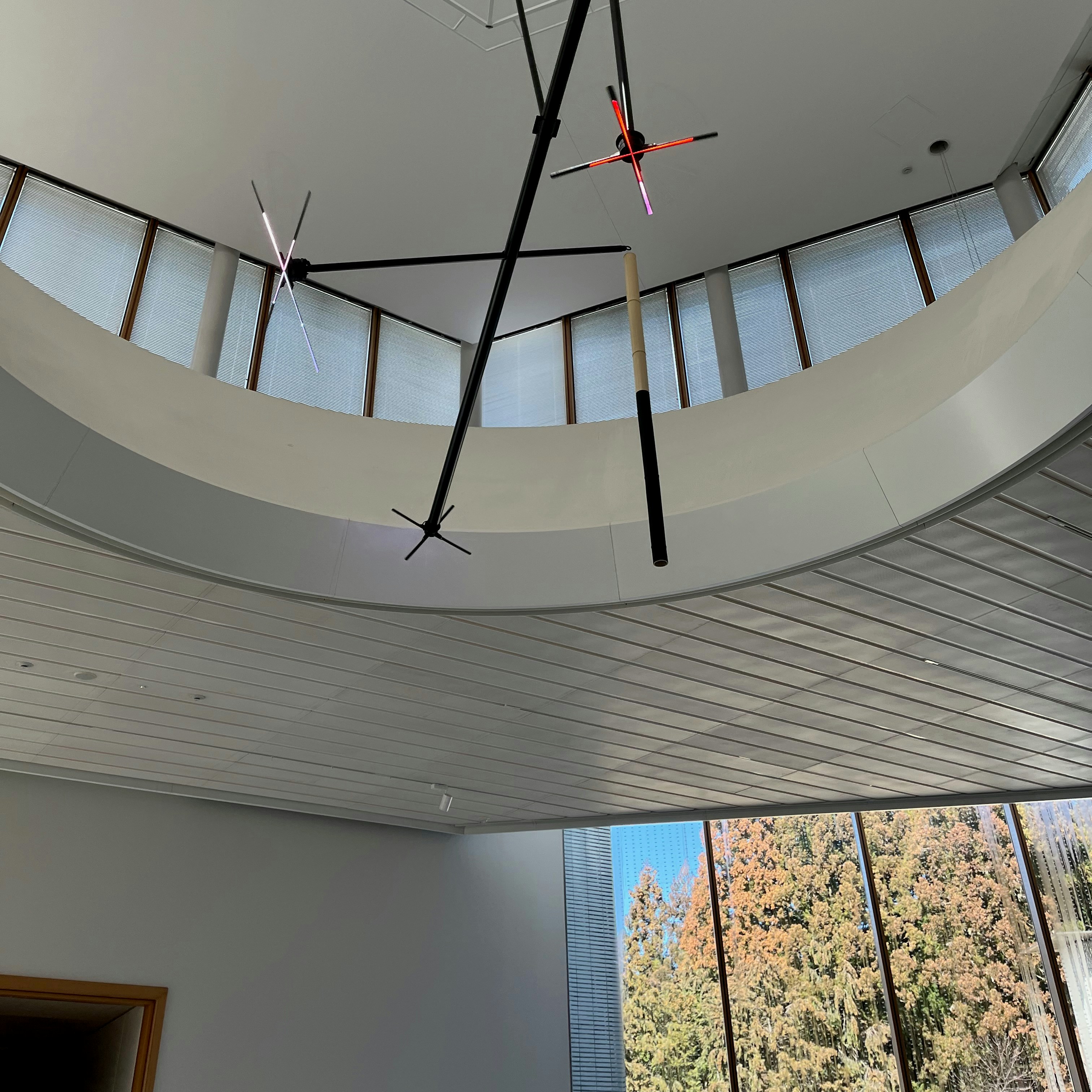 本ホールには大きなガラス窓が設置されており、そこからは針葉樹と広葉樹の森林が見える、開かれて開放的な空間だが、ネッツハマーは身体のイメージをオブジェのなかに閉じこめて延々と回転させており、そこには窮屈さを感じる。しかし、このような限定的な環境に置かれているからこそ、ポリゴンの身体が美的に感じられる瞬間があるのも事実だ。抑圧と美の関係を鑑賞者の身体の延長として語りかけてくる展示だといえよう。なお、LEDホログラムファンは写真や動画ではその像を補足しにくく、撮影してもただの光となってしまう。これもまた、SNS時代におけるイメージのあり方を問いかける、ネッツハマーの仕掛けだと思わずにはいられない。
