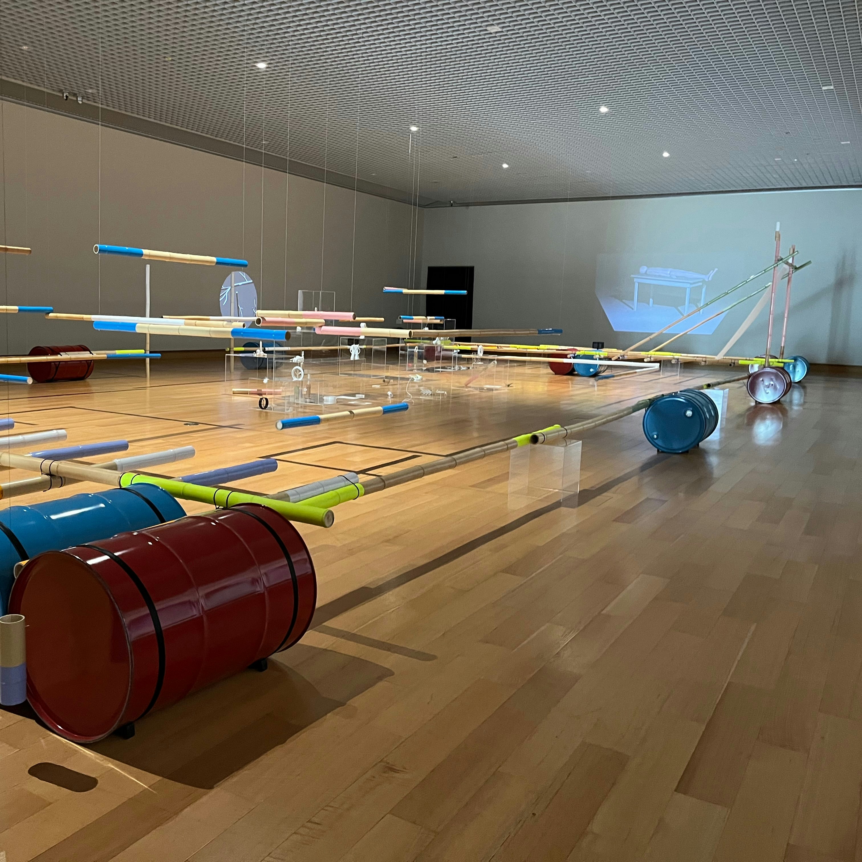 空間にはいくつもの竹が空中に浮かぶように天井から吊り下げられており、さながら地中に張り巡らされた水道管のようだ。仕込まれたターンテーブルによって吊り下がった竹が揺れると、竹の中を音が伝い、楽器のように場内に響く。また、竹は油分が多いために着色が難しいとされるが、本作は大田原市の竹芸工房「無心庵」による着色技術を用いることで、ビビッドなカラーがつけられている。ネッツハマーは竹というともすれば日本的な印象になりがちな素材を用いながらも、無機質で無国籍的なリゾームをシステムとして体現させたといえるだろう。