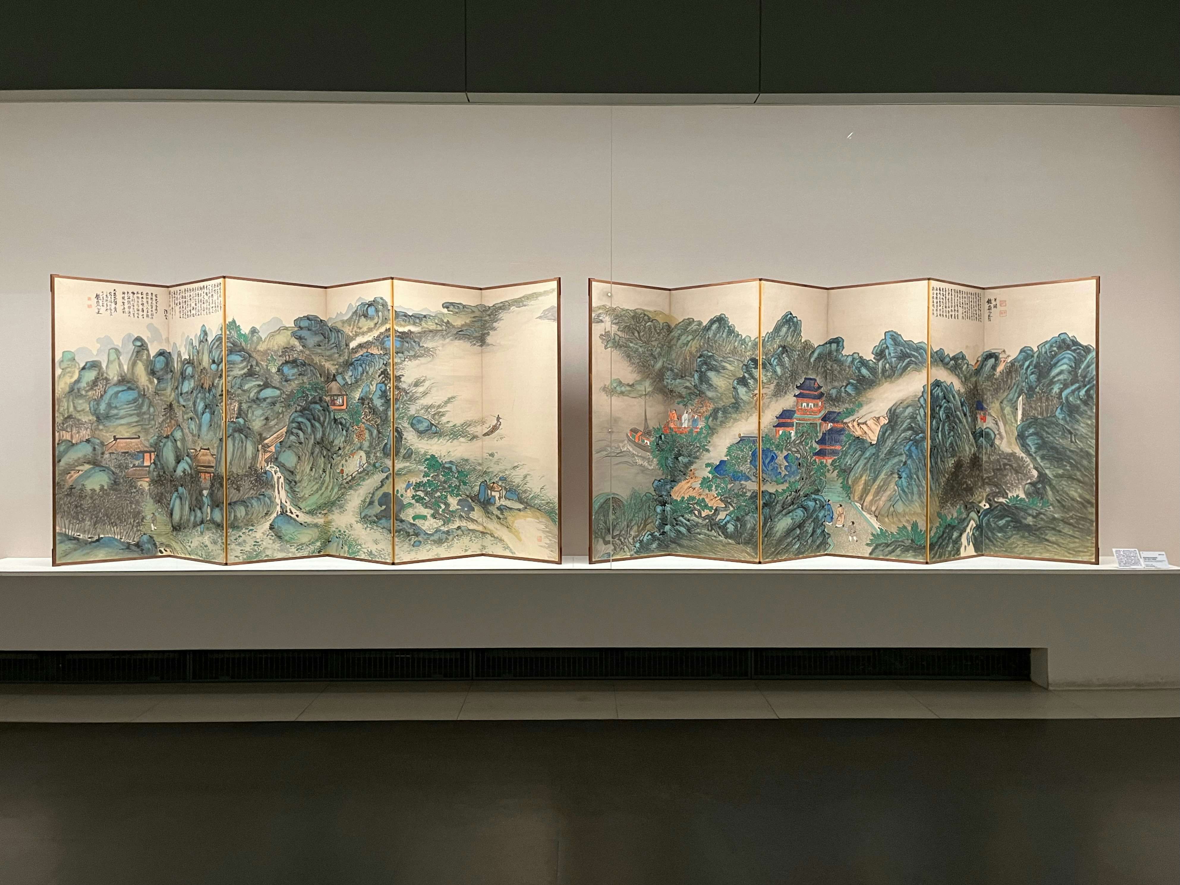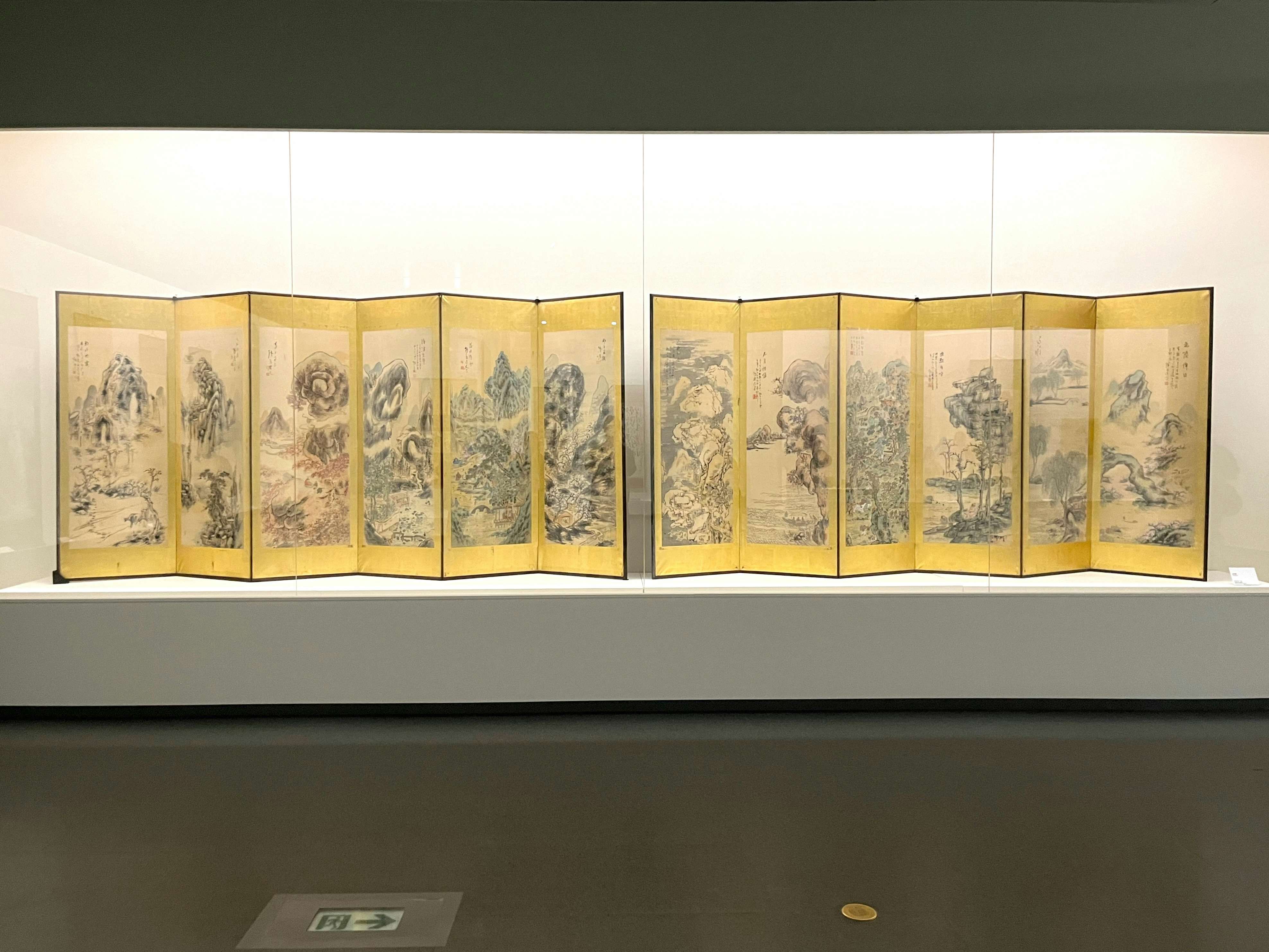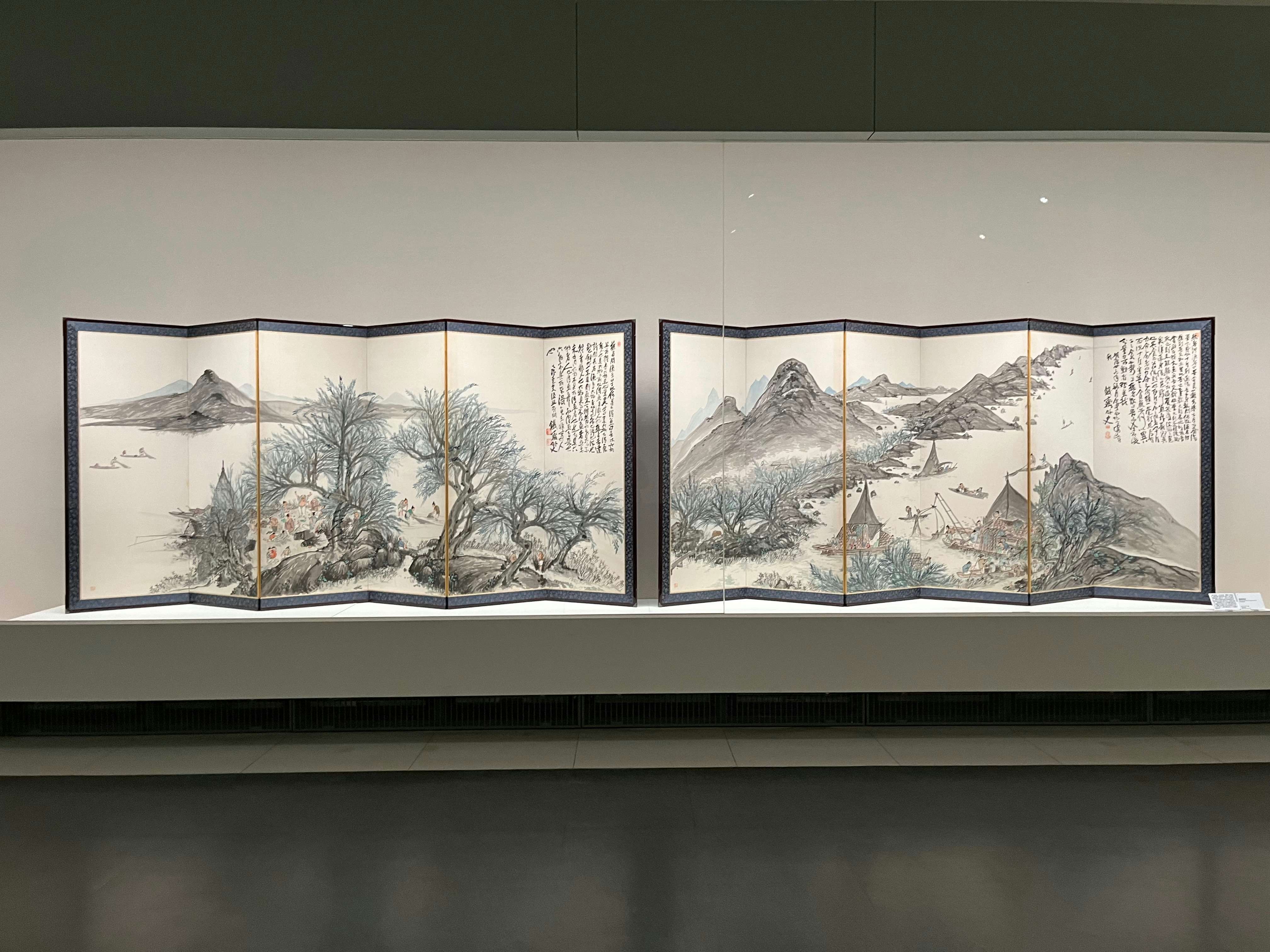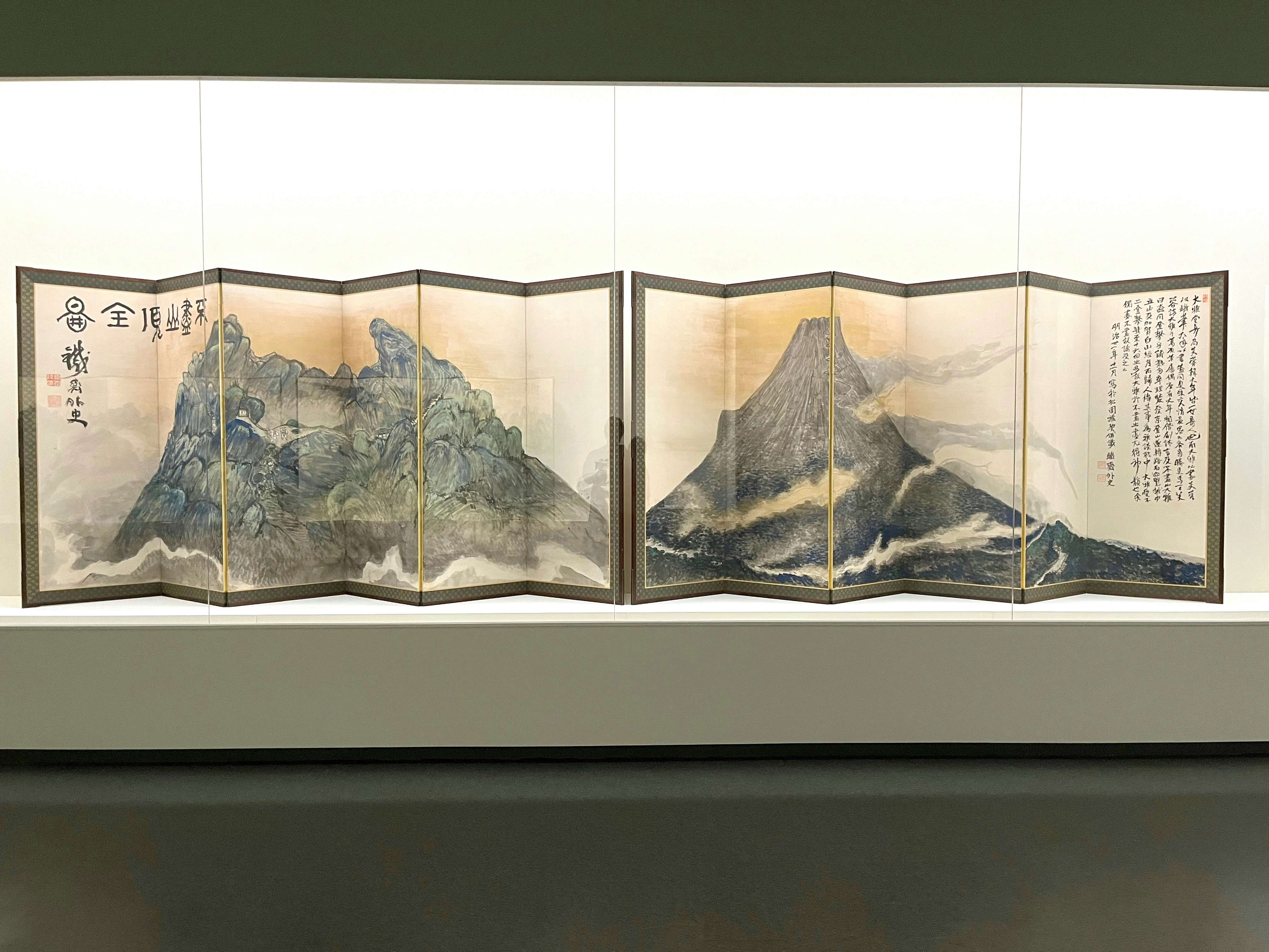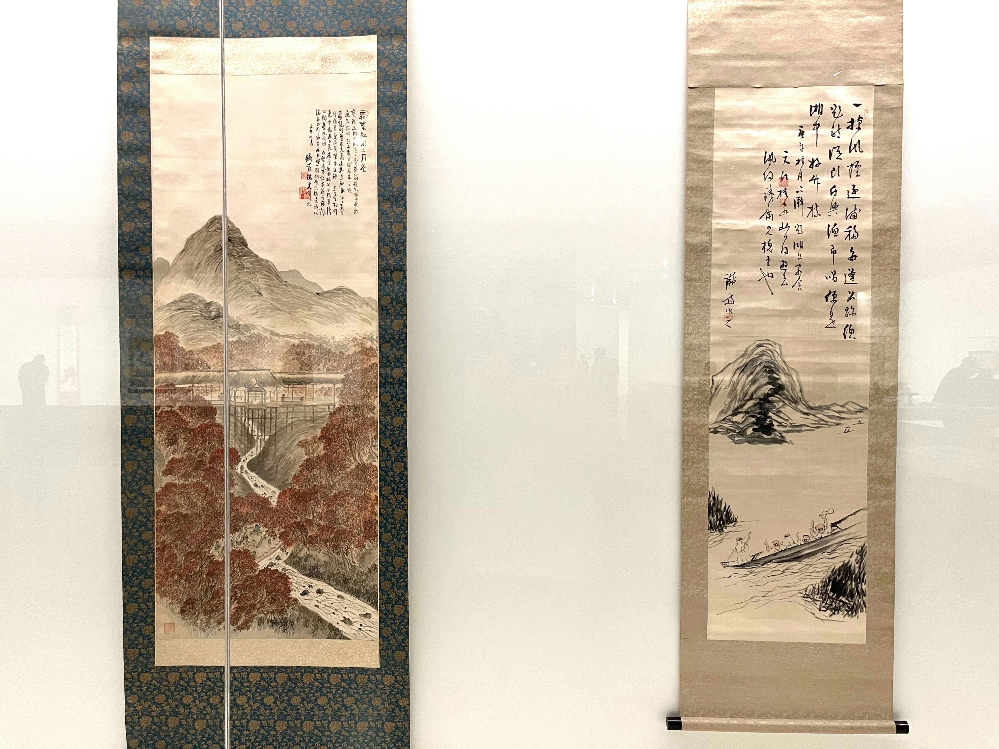 展示風景より、左から富岡鉄斎《通天紅葉図》(1882)、《琵琶湖周遊図》(1870)