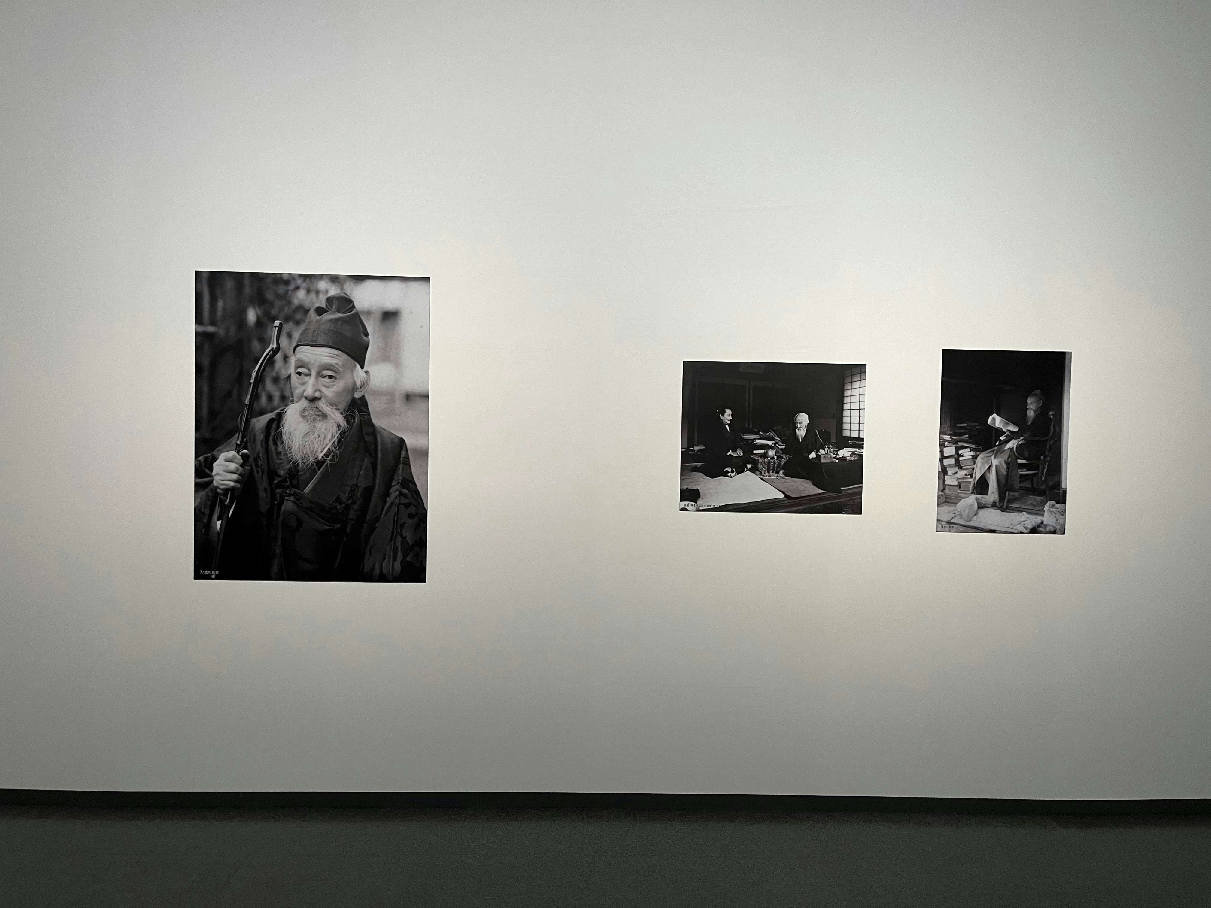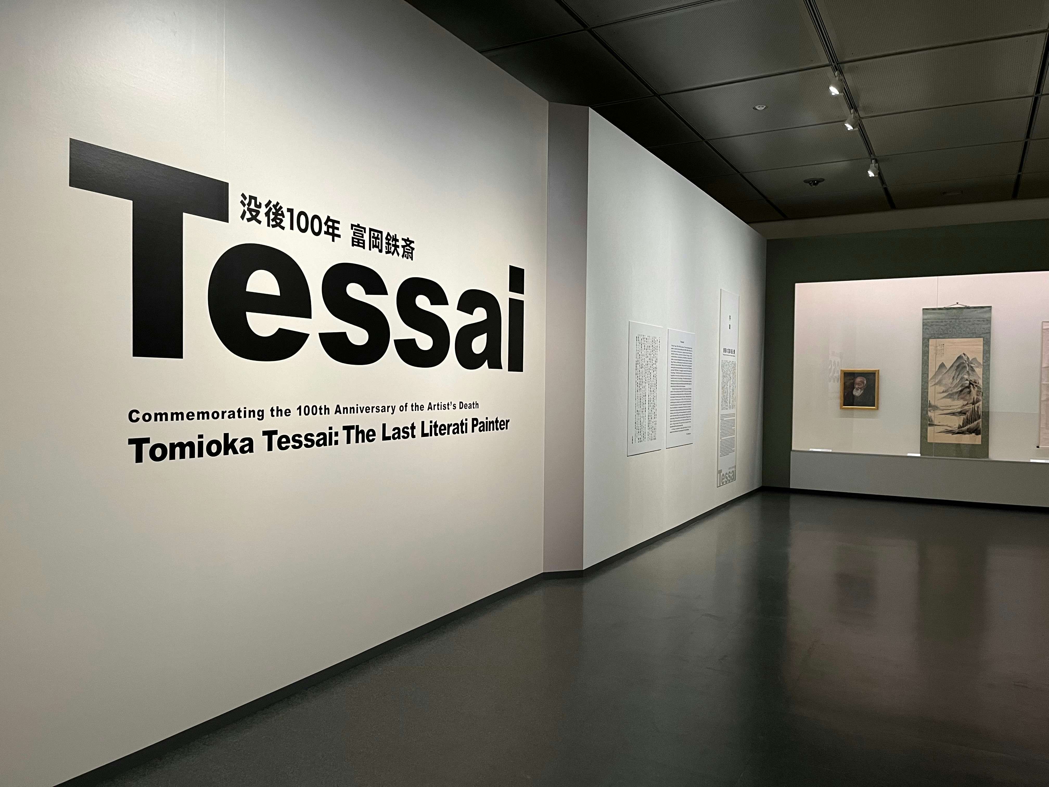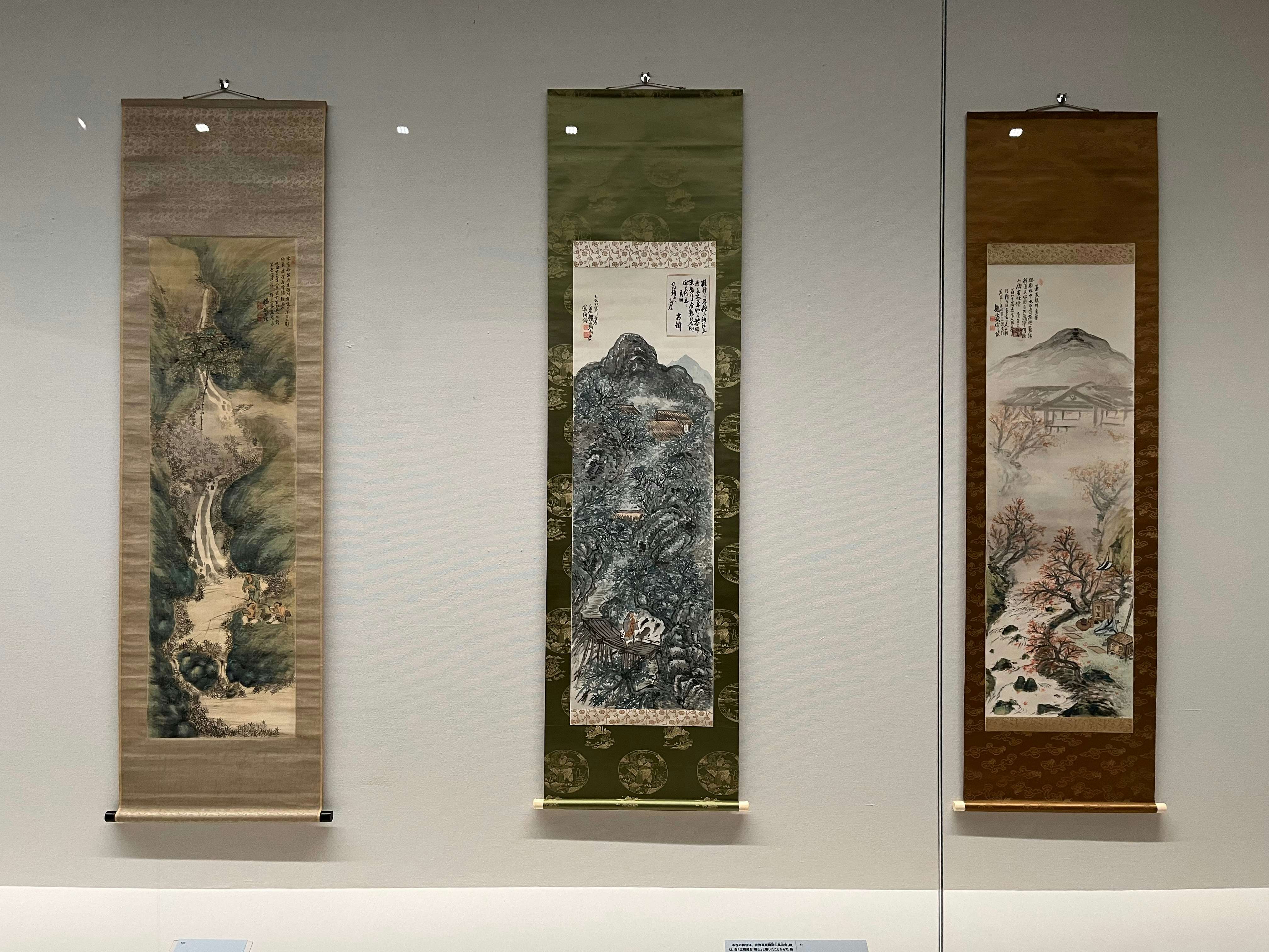 展示風景より、左から富岡鉄斎《高士肥遯図》(1889)、《梅山幽趣図》(1915)、《交友外売茶図》(明治〜大正時代)